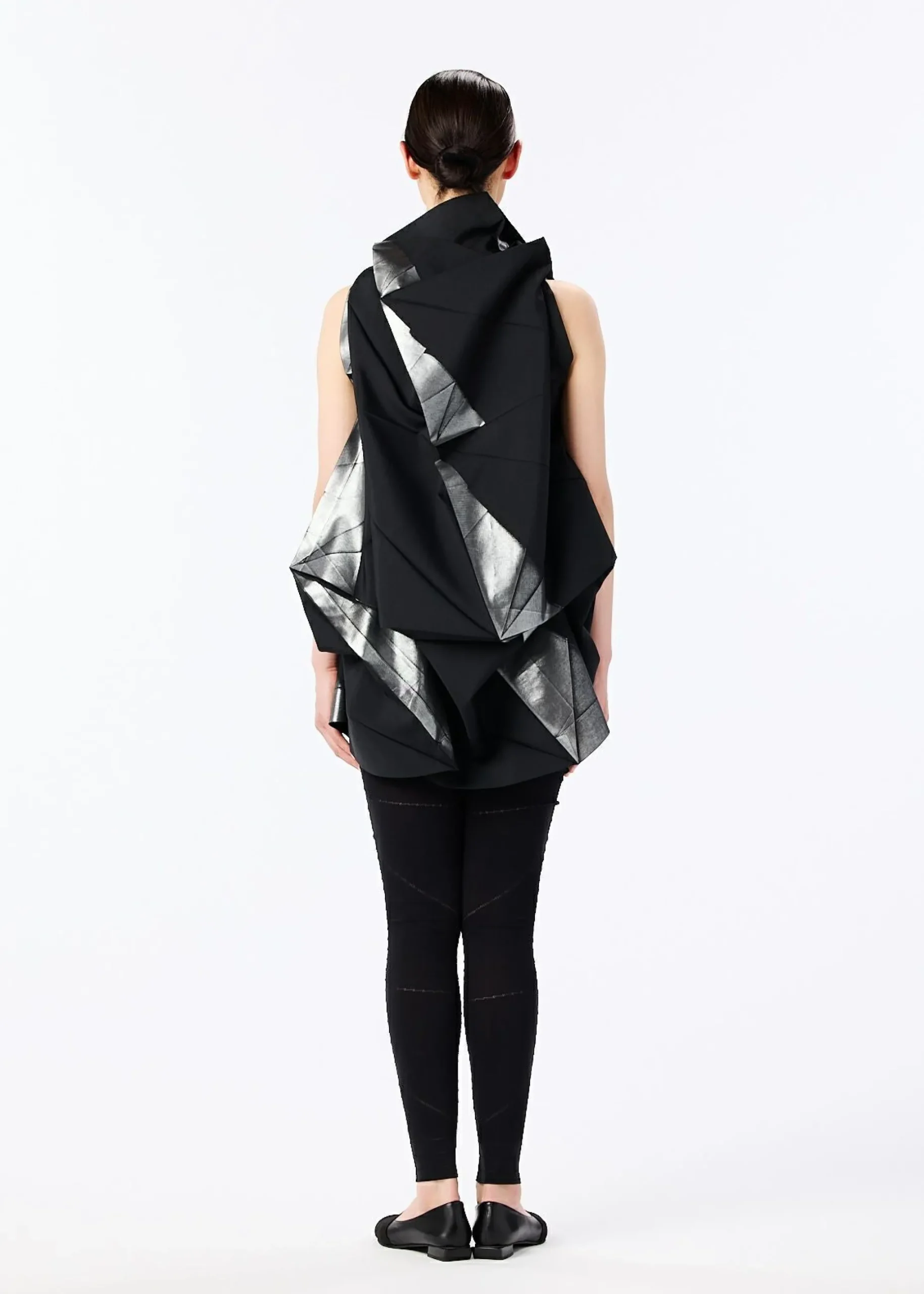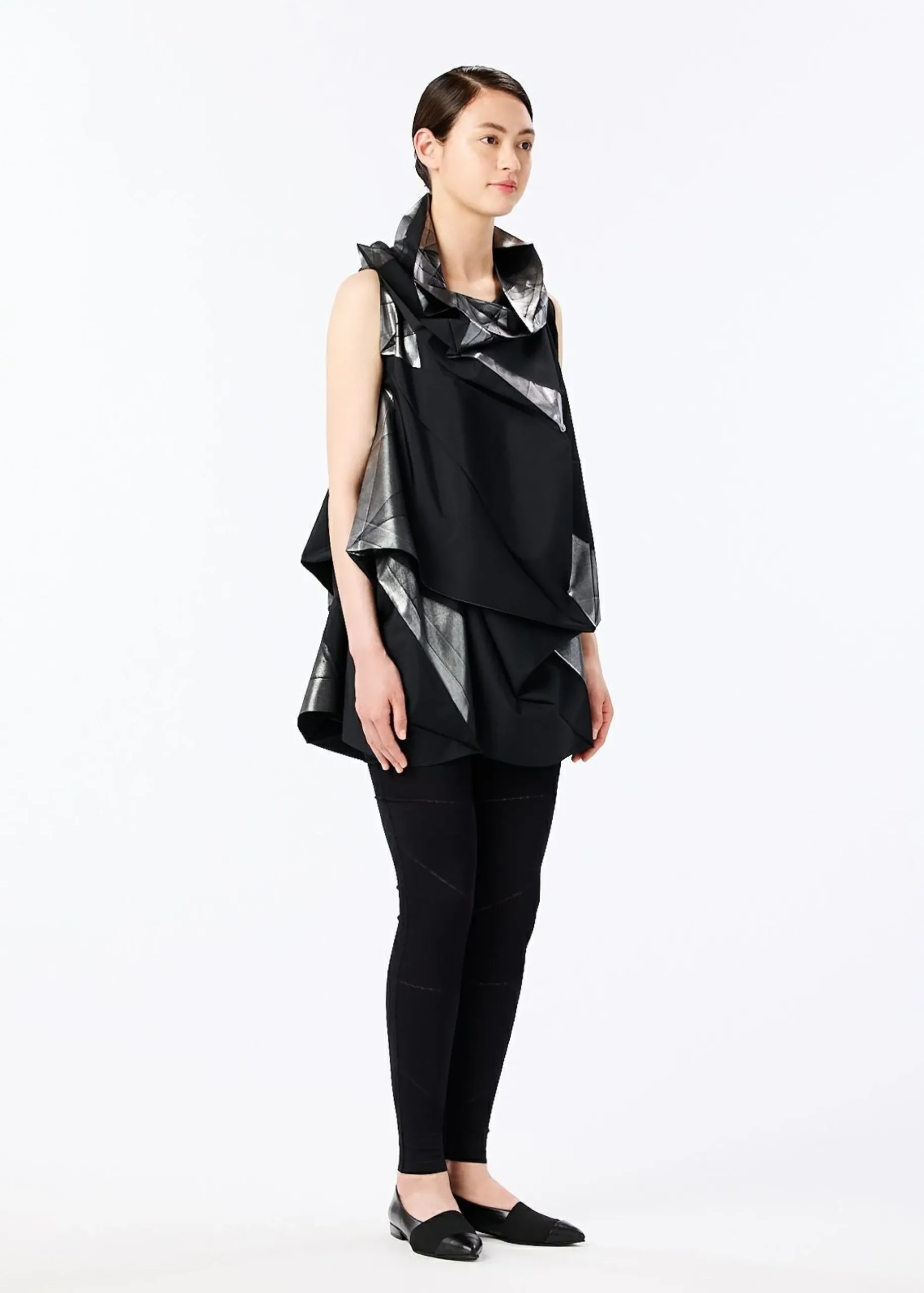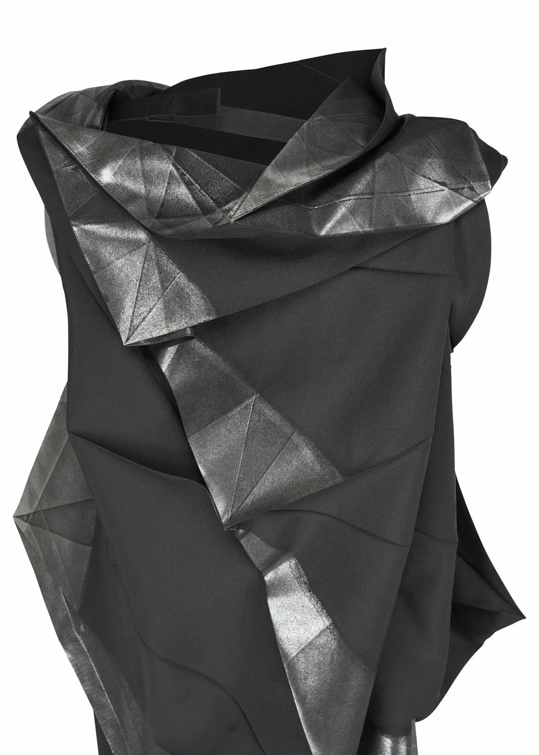One piece made from recycled polyester fabric. By applying foil while folded flat, the foil scatters and creates shadows when worn. It has a flat design when folded.