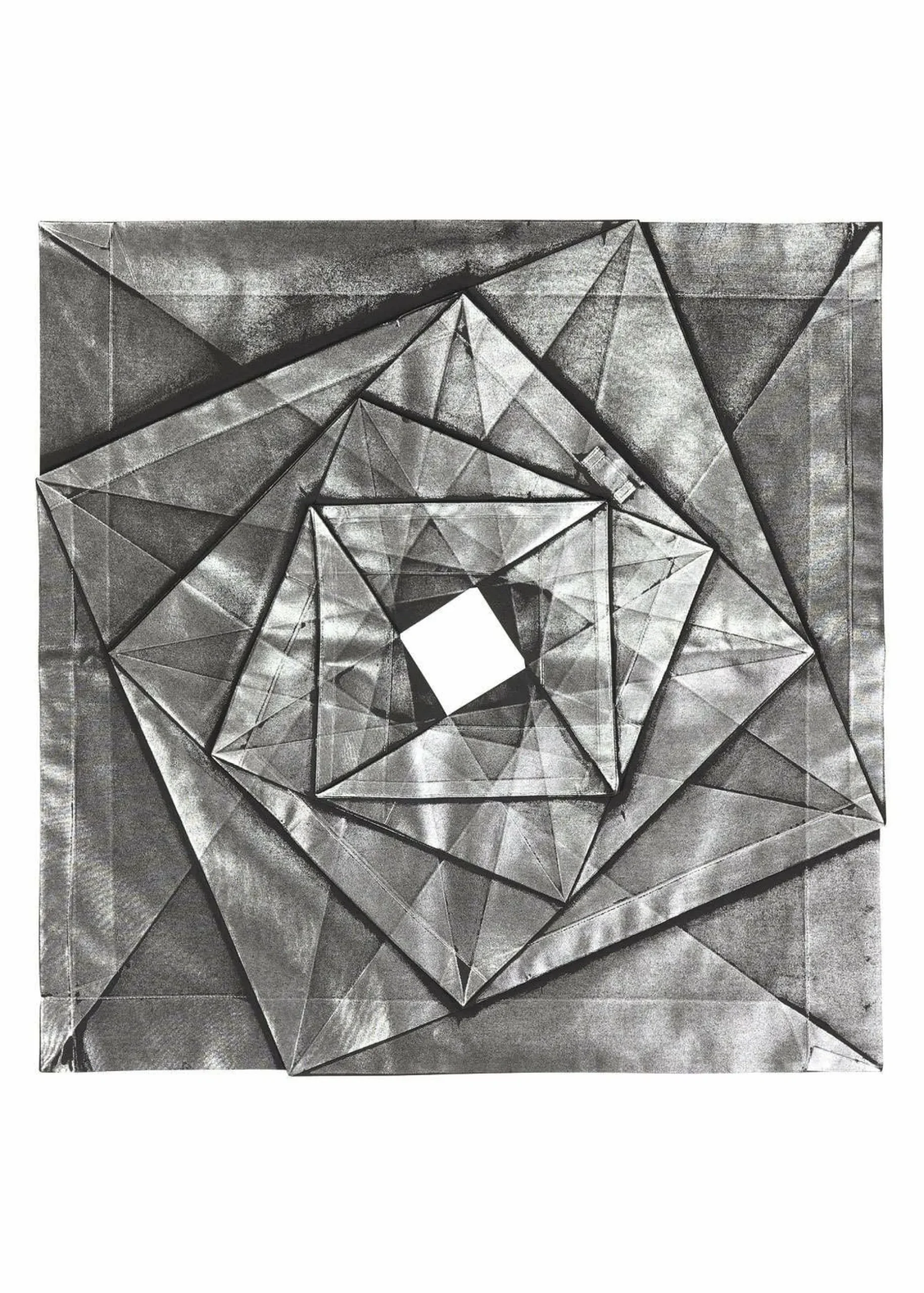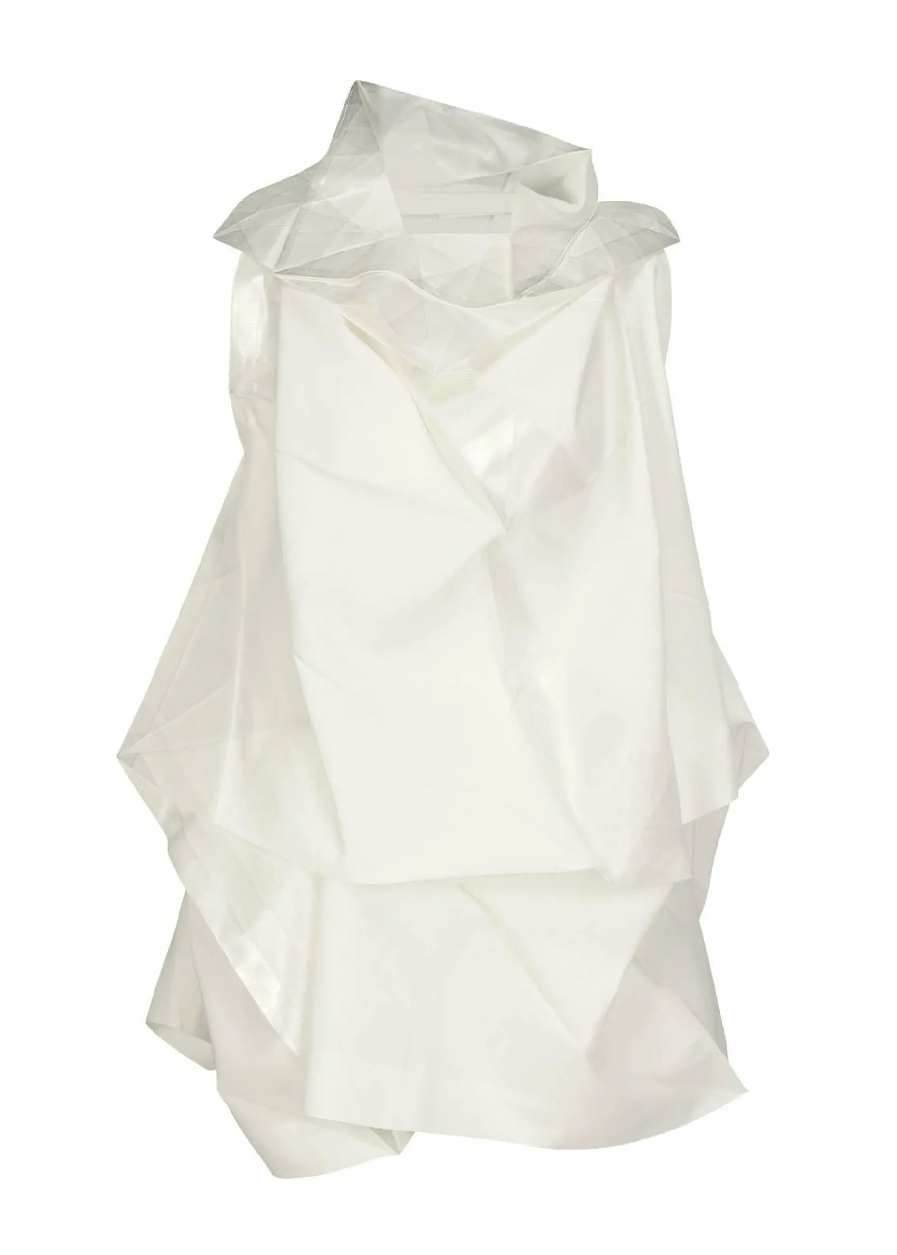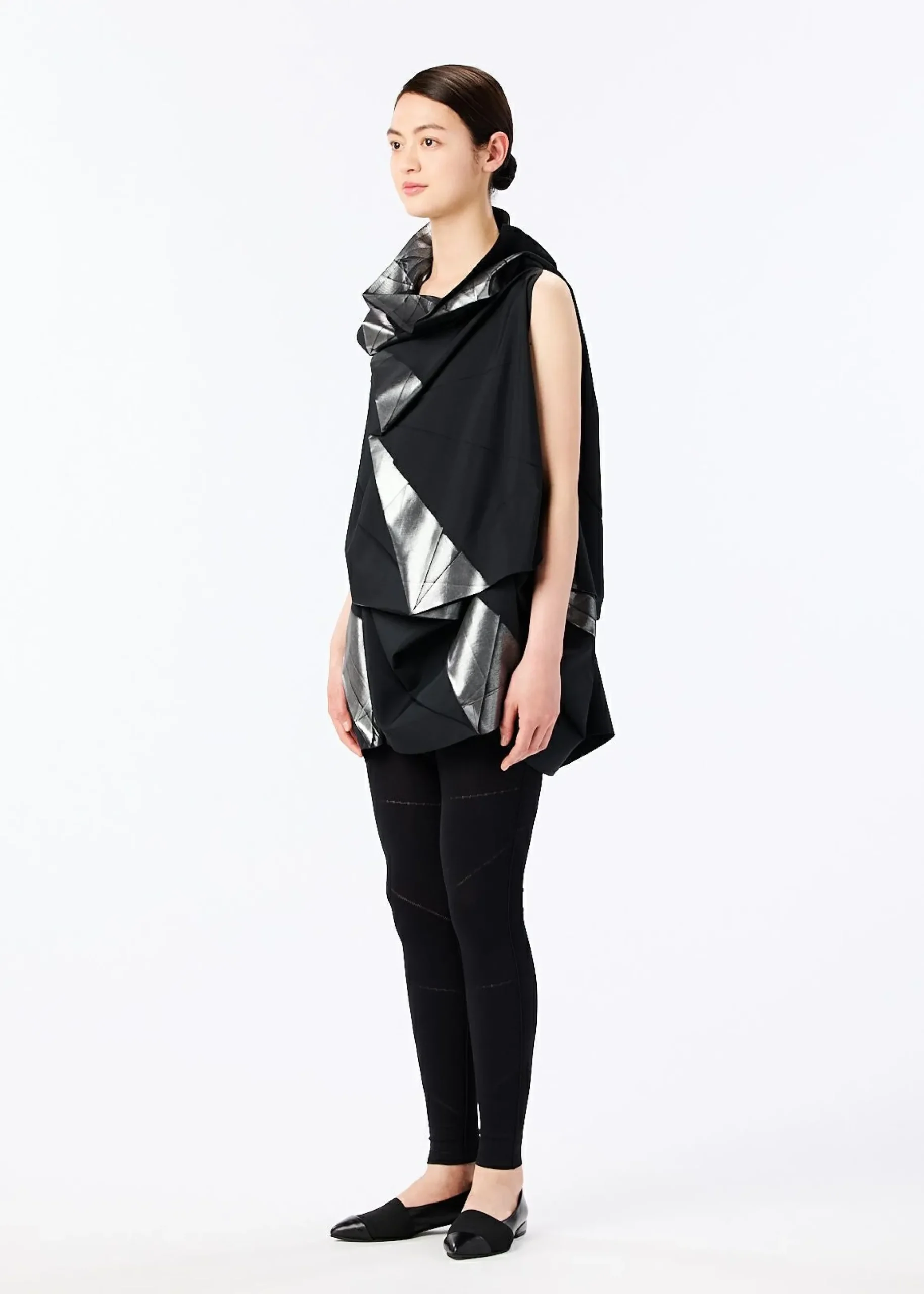 One piece made from recycled polyester fabric. By applying foil while folded flat, the foil scatters and creates shadows when worn. It has a flat design when folded.