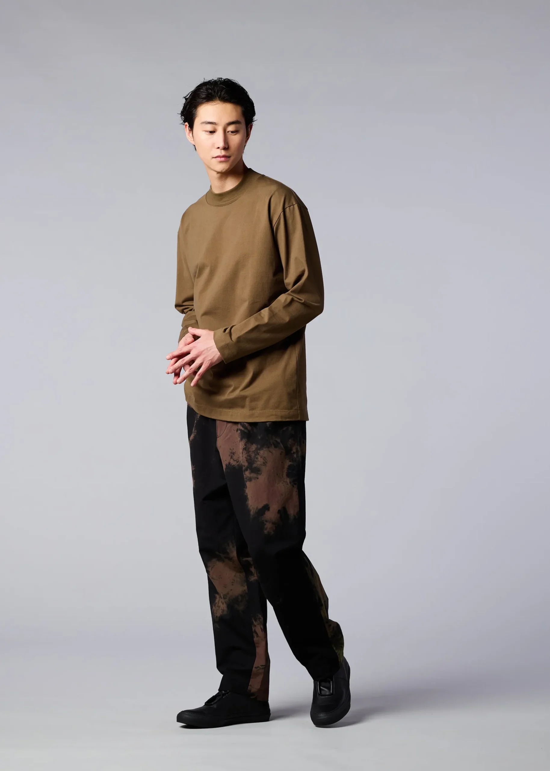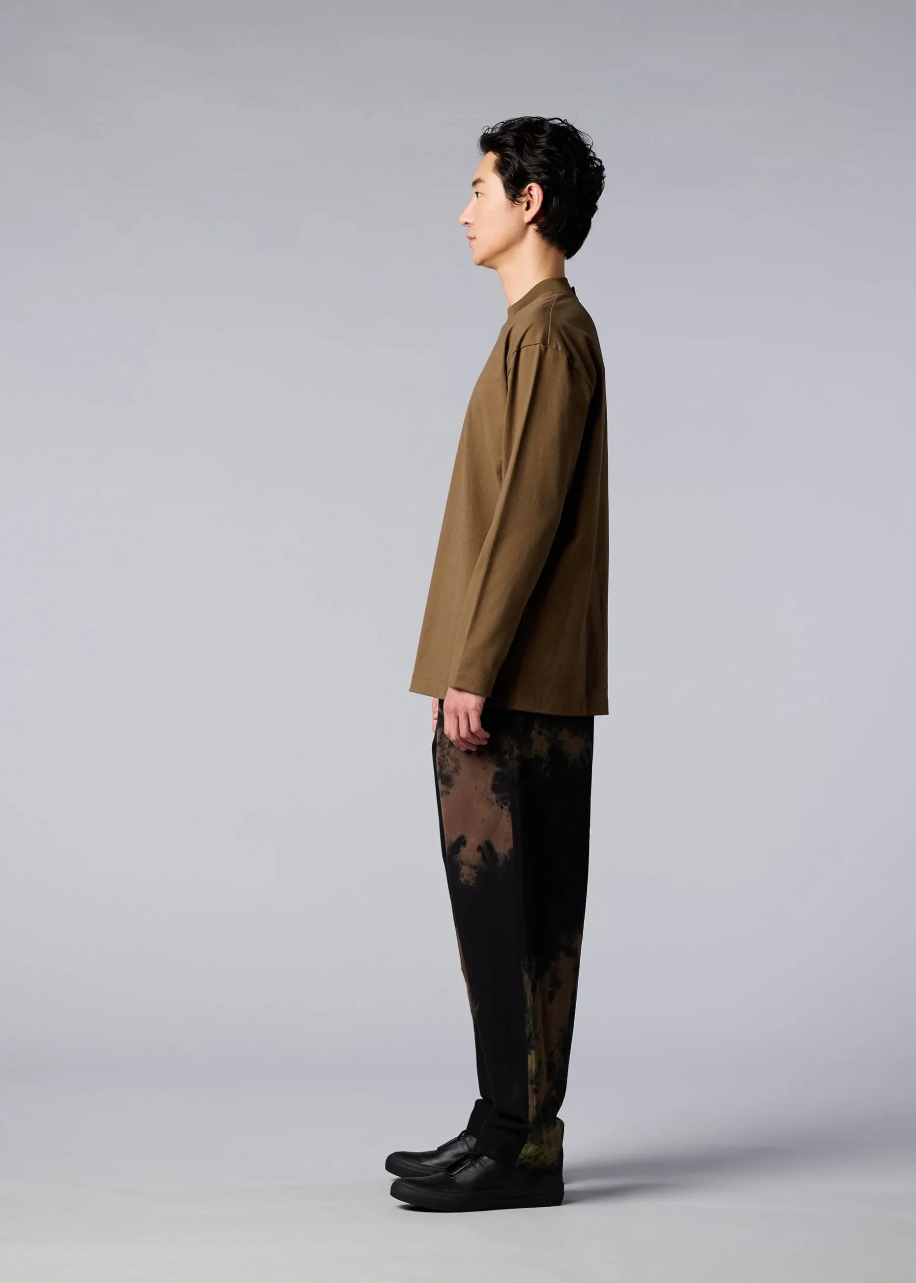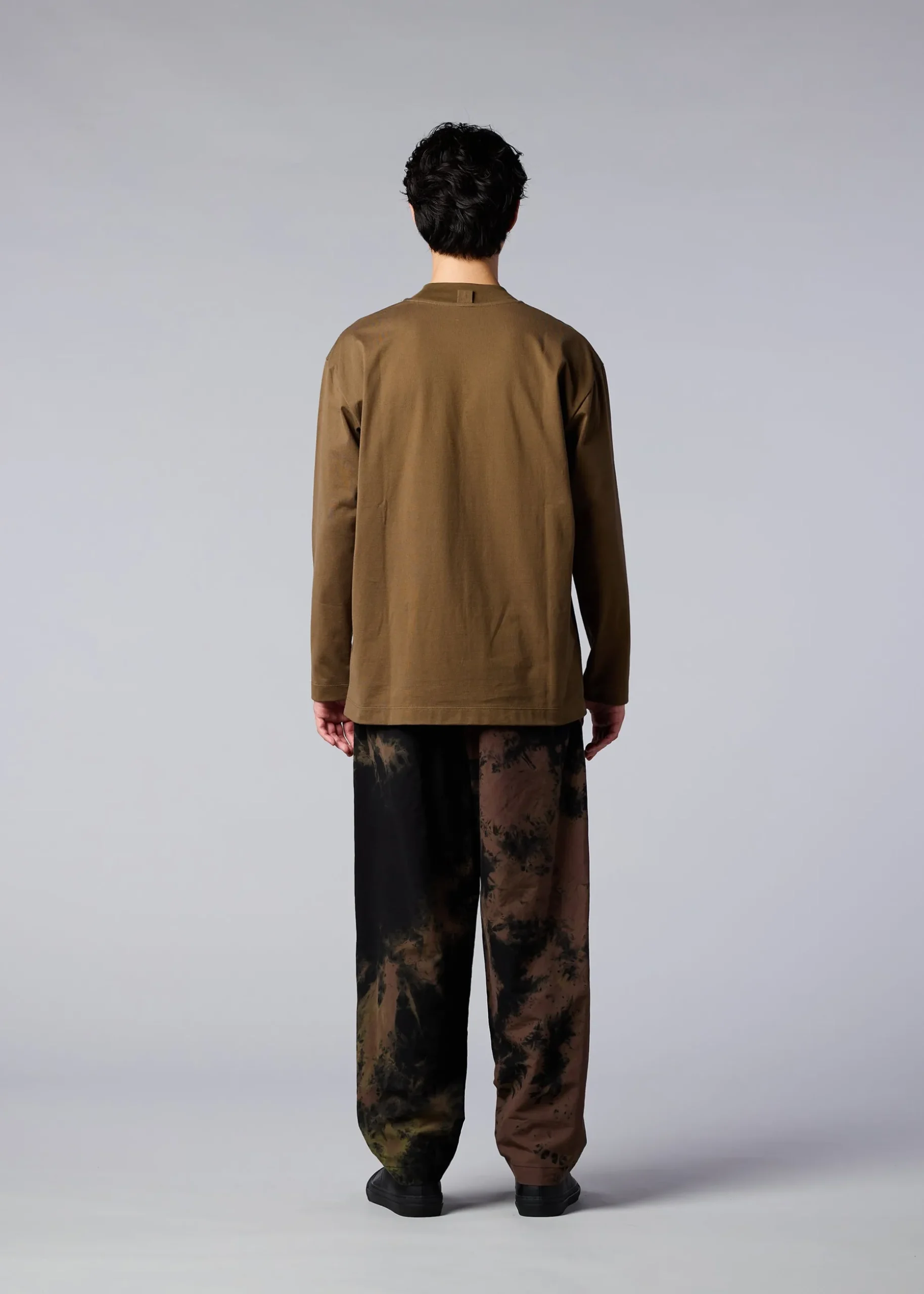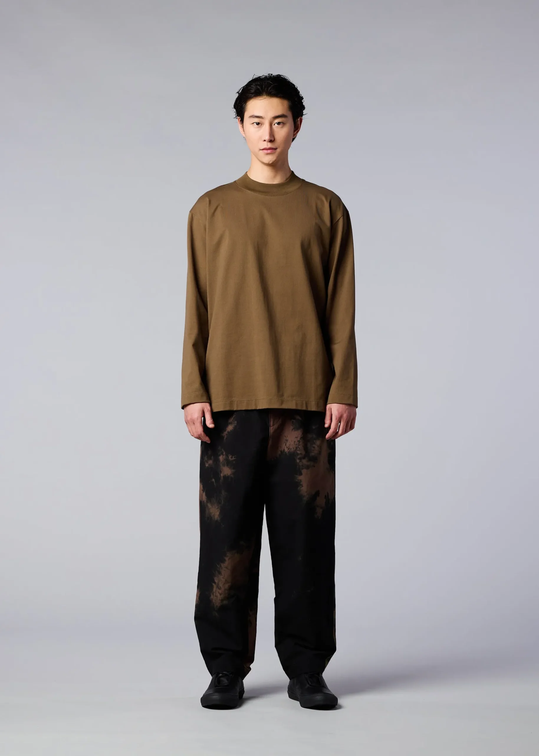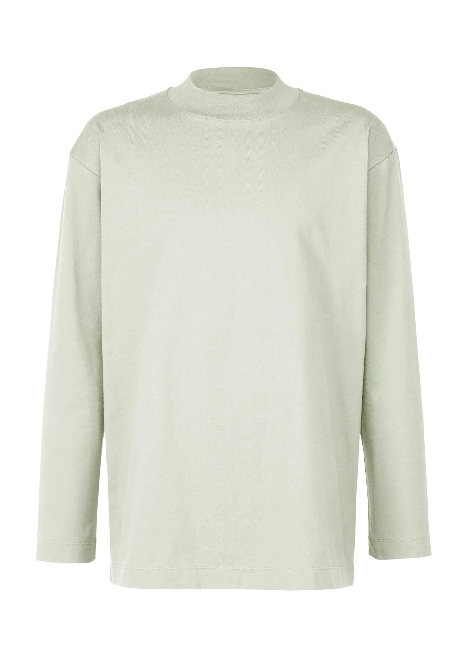 Mock-neck long-sleeved T-shirt made from a textile knitted from a blend of biodegradable polyester and cotton. We have improved durability while pursuing a better texture. As a design accent, there is a collar hanging on the back of the collar.