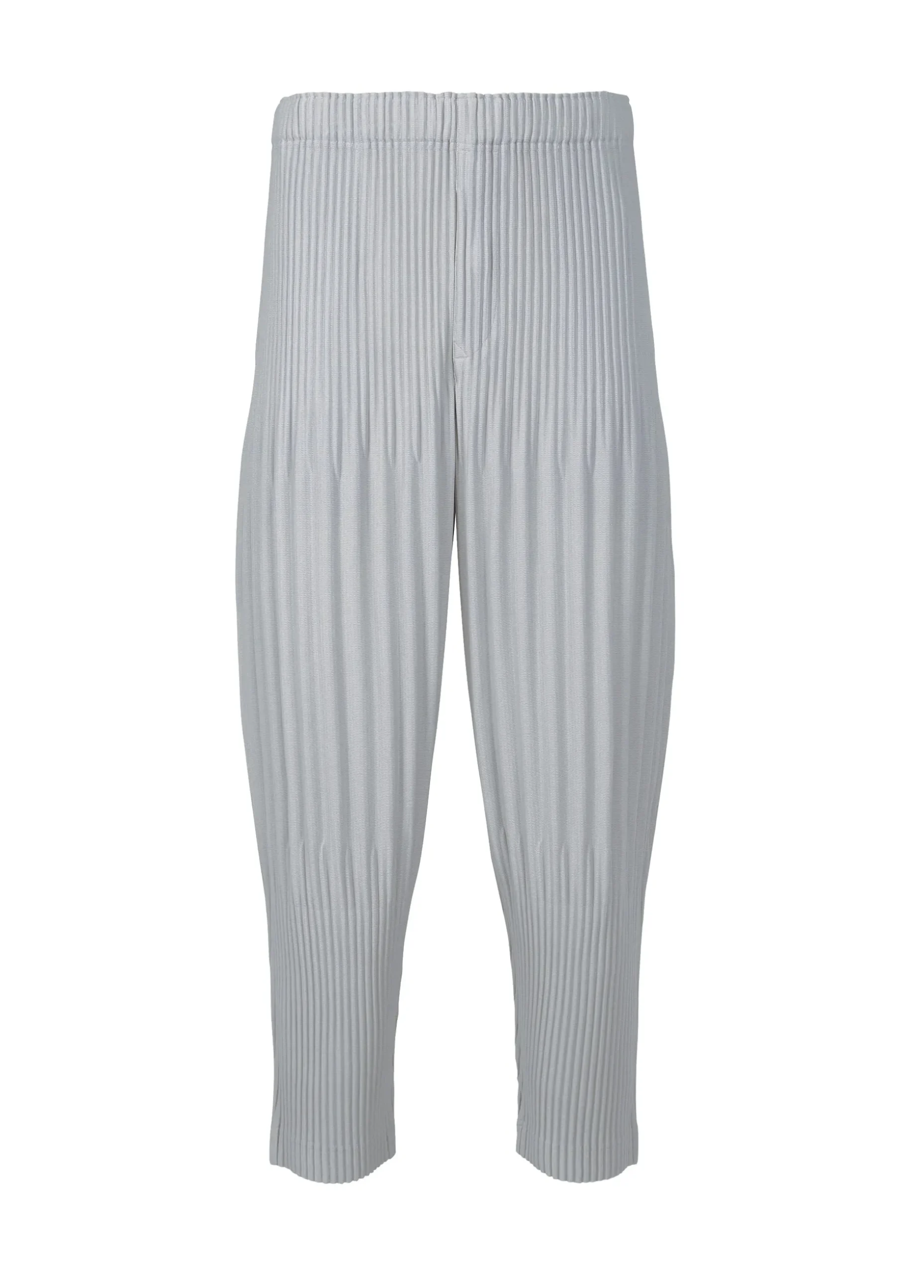 Pants with eraser pleats that dry easily, which is unique to polyester material, and are lightweight and comfortable to wear. This product has a button opening in the front.