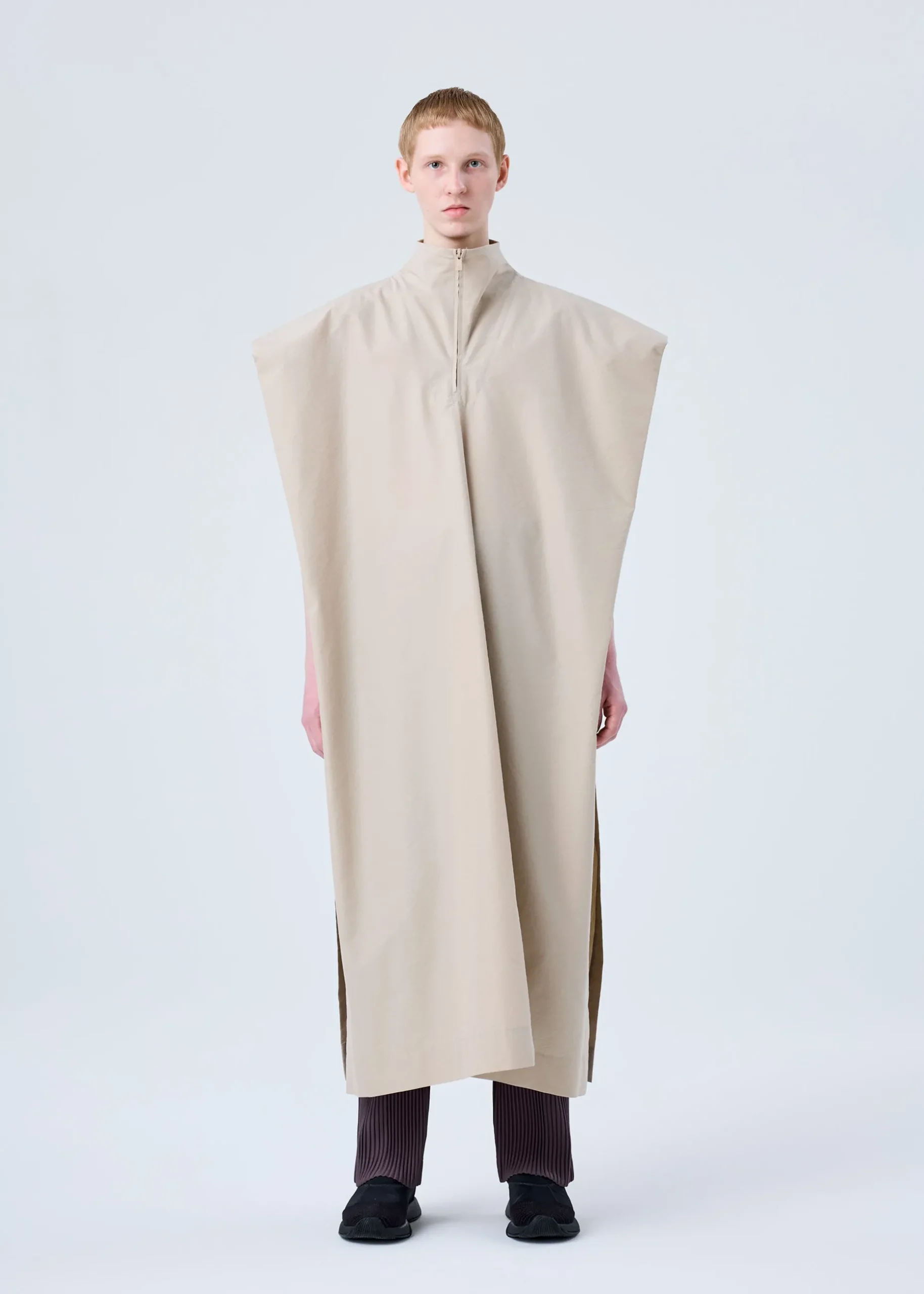 This long shirt was inspired by the silhouette of a product created by designer/artist Ronan Bouroullec. It is made from cotton-polyester fabric characterized by its natural texture with a sun-dried finish. It has a half-zippered design and slits on both sides.