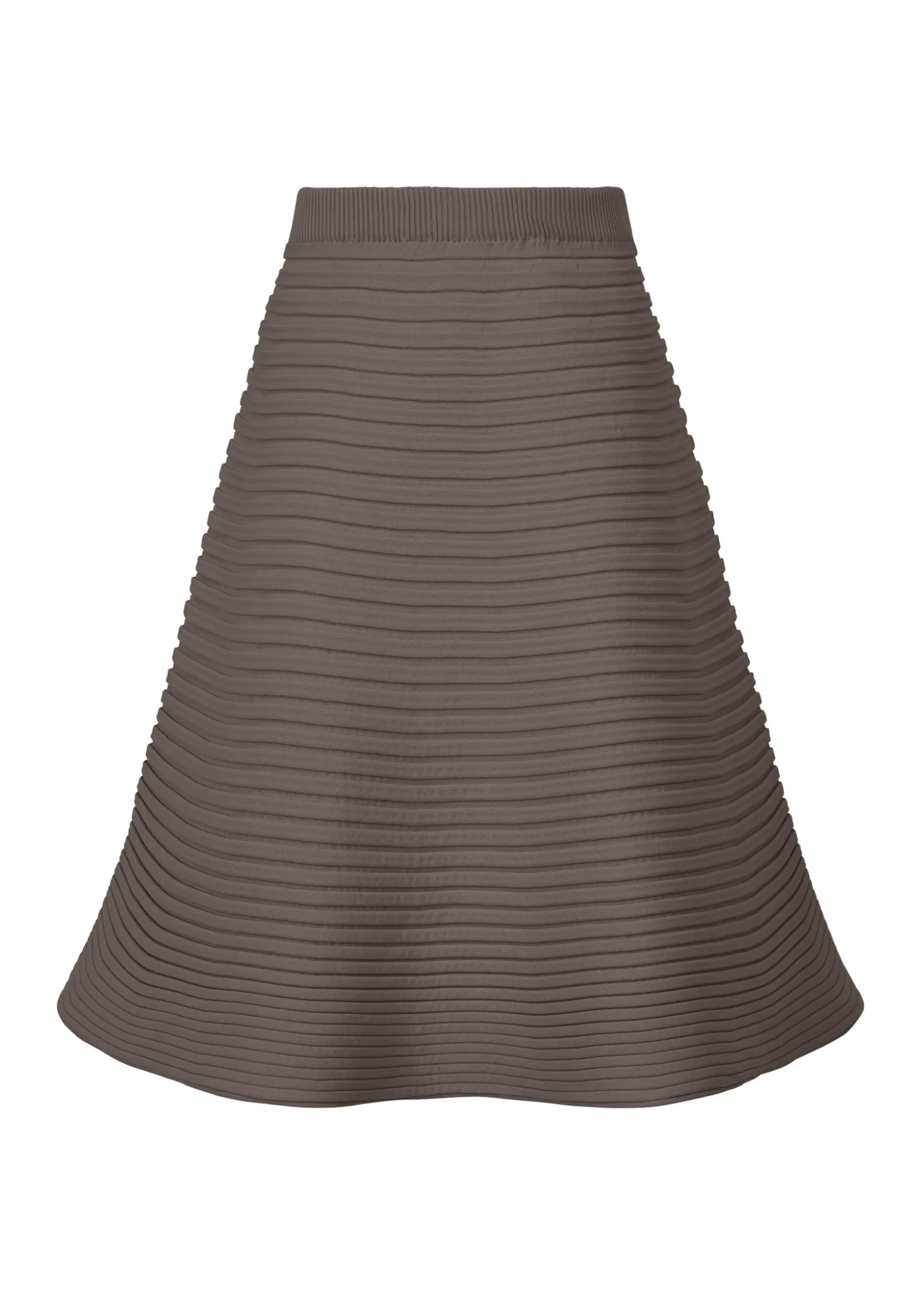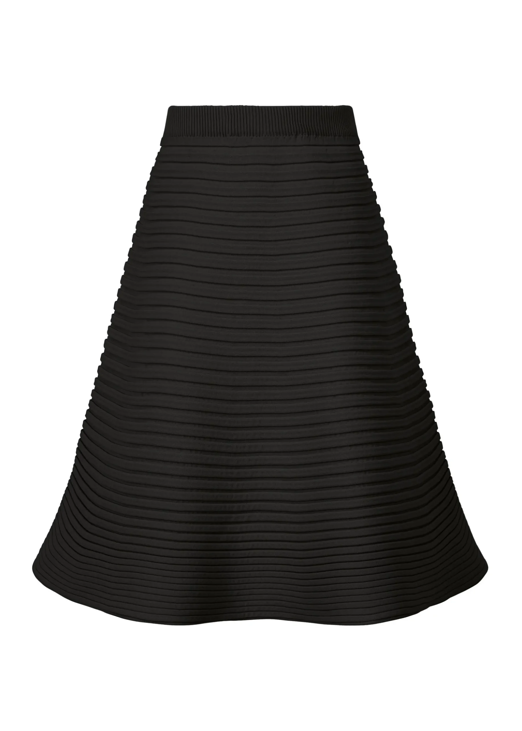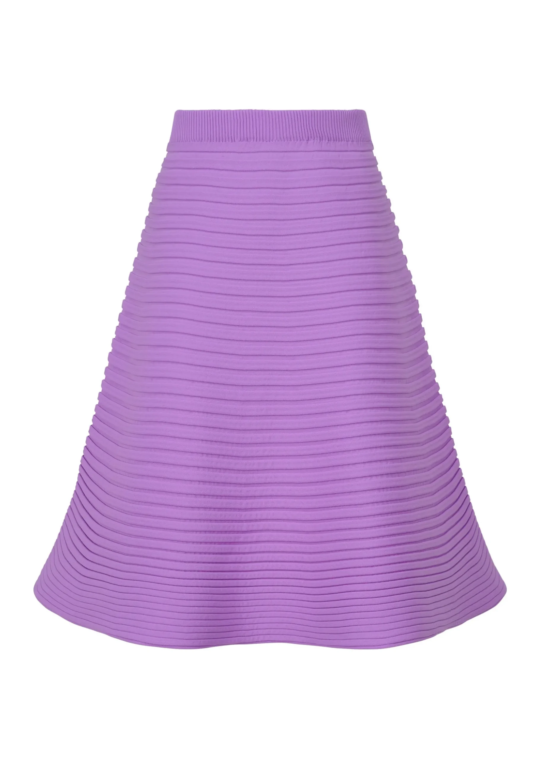 This non-sewn knit skirt expresses horizontal pleats with its knitted structure that bounces as you move. Recycled polyester thread is used to create the textile that is easy to care for because it is washable in water.