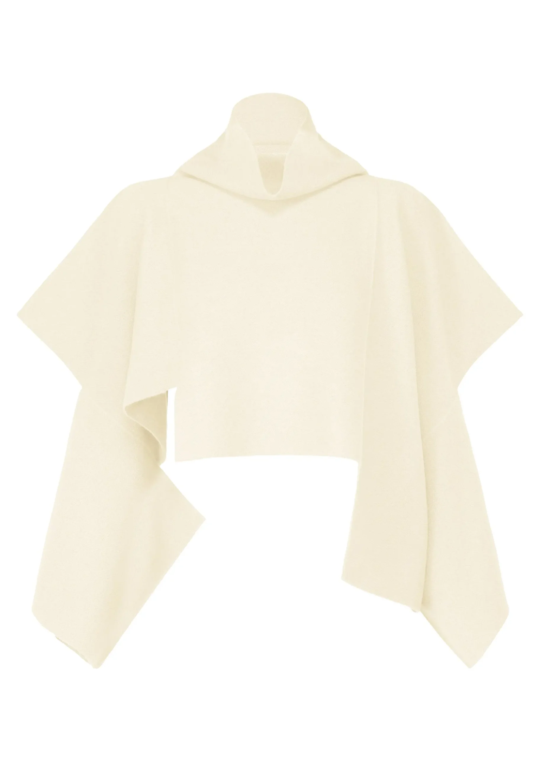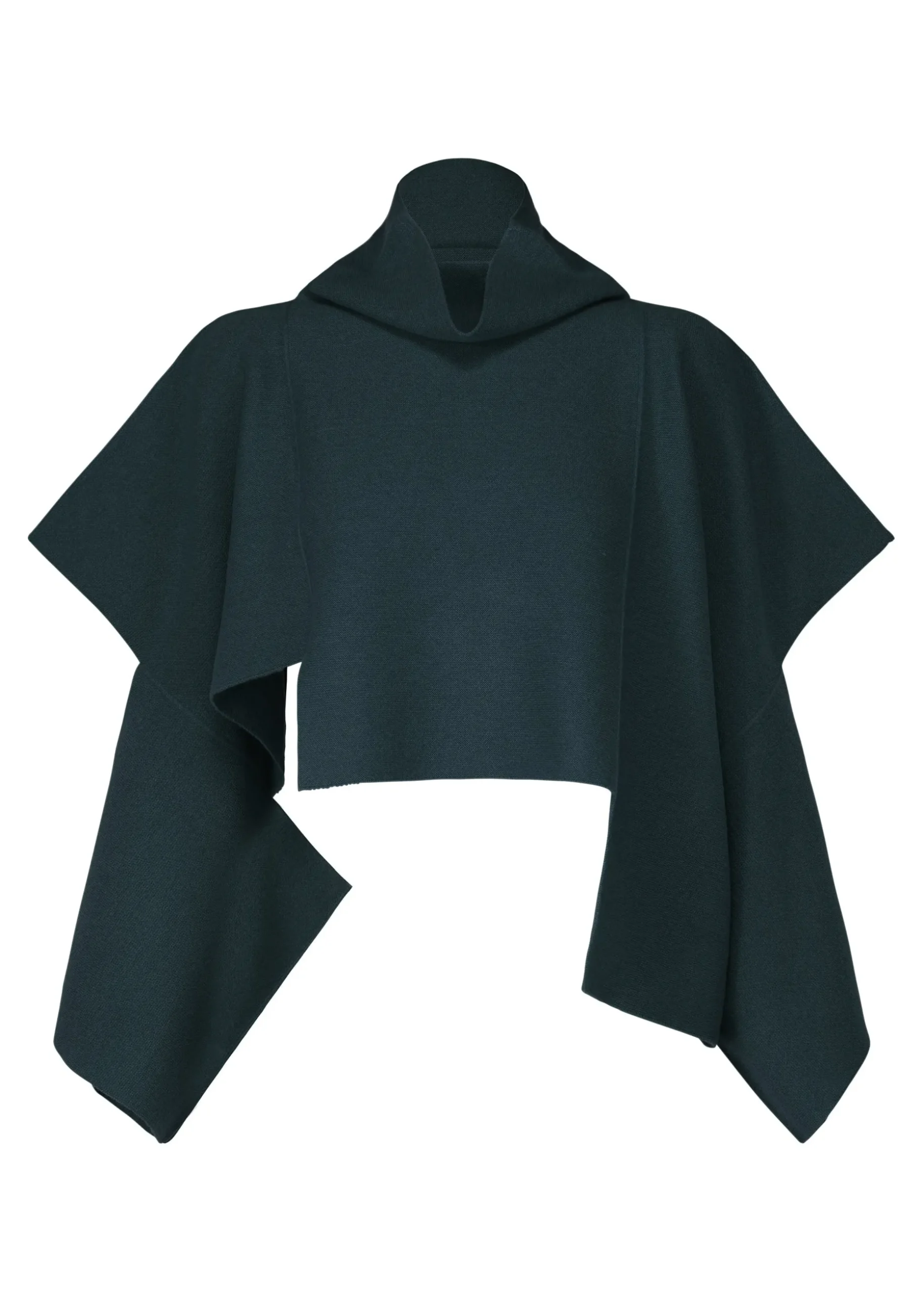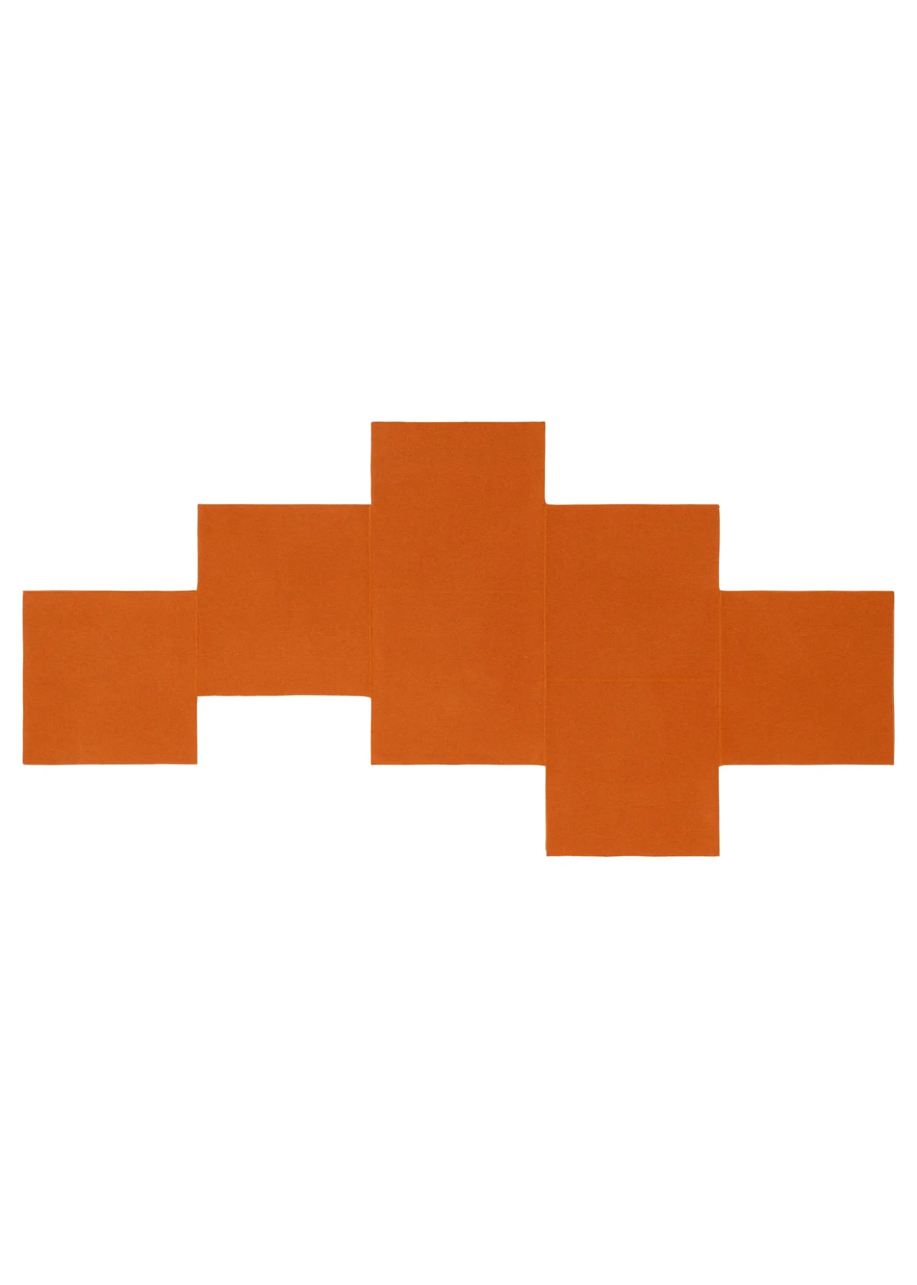 This non-sewn knit has a design that combines squares like alternating stacked bricks. The design is characterized by its silhouette created from the rectangles in a graphical arrangement. The knit is finished to have a light, soft texture.