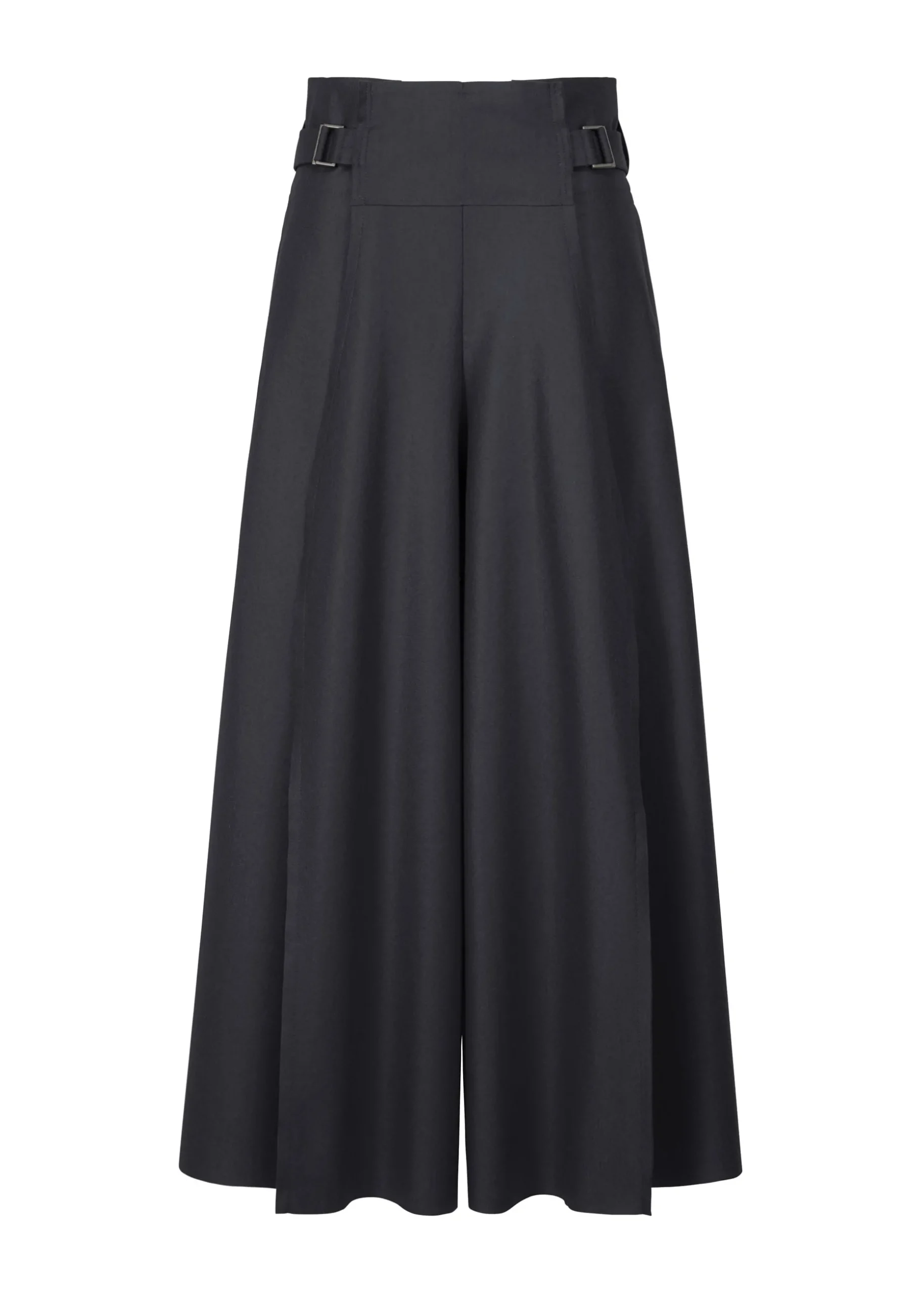 These pants are characterized by their design featuring a supple wool textile that is cut in a curved line and then made to have an exposed seam allowance.