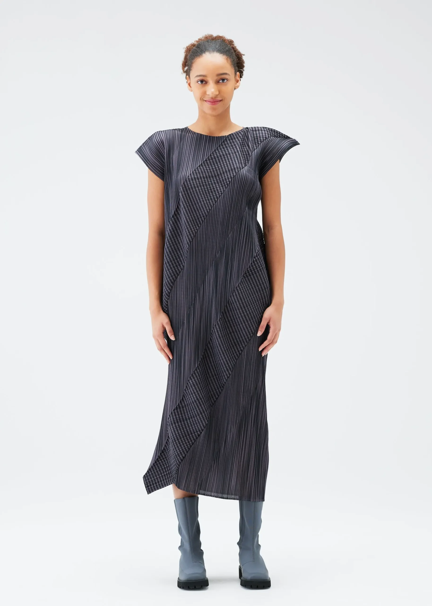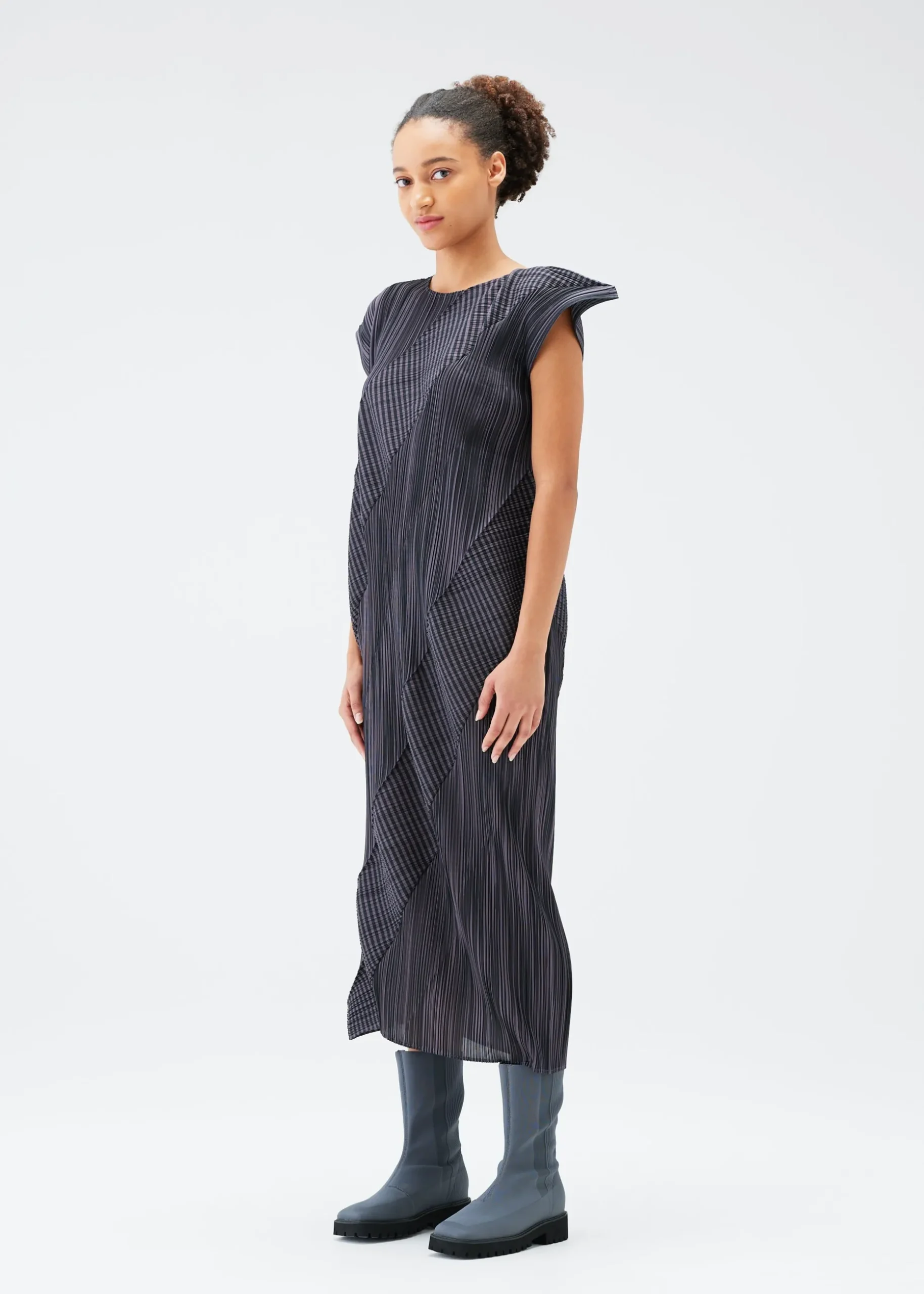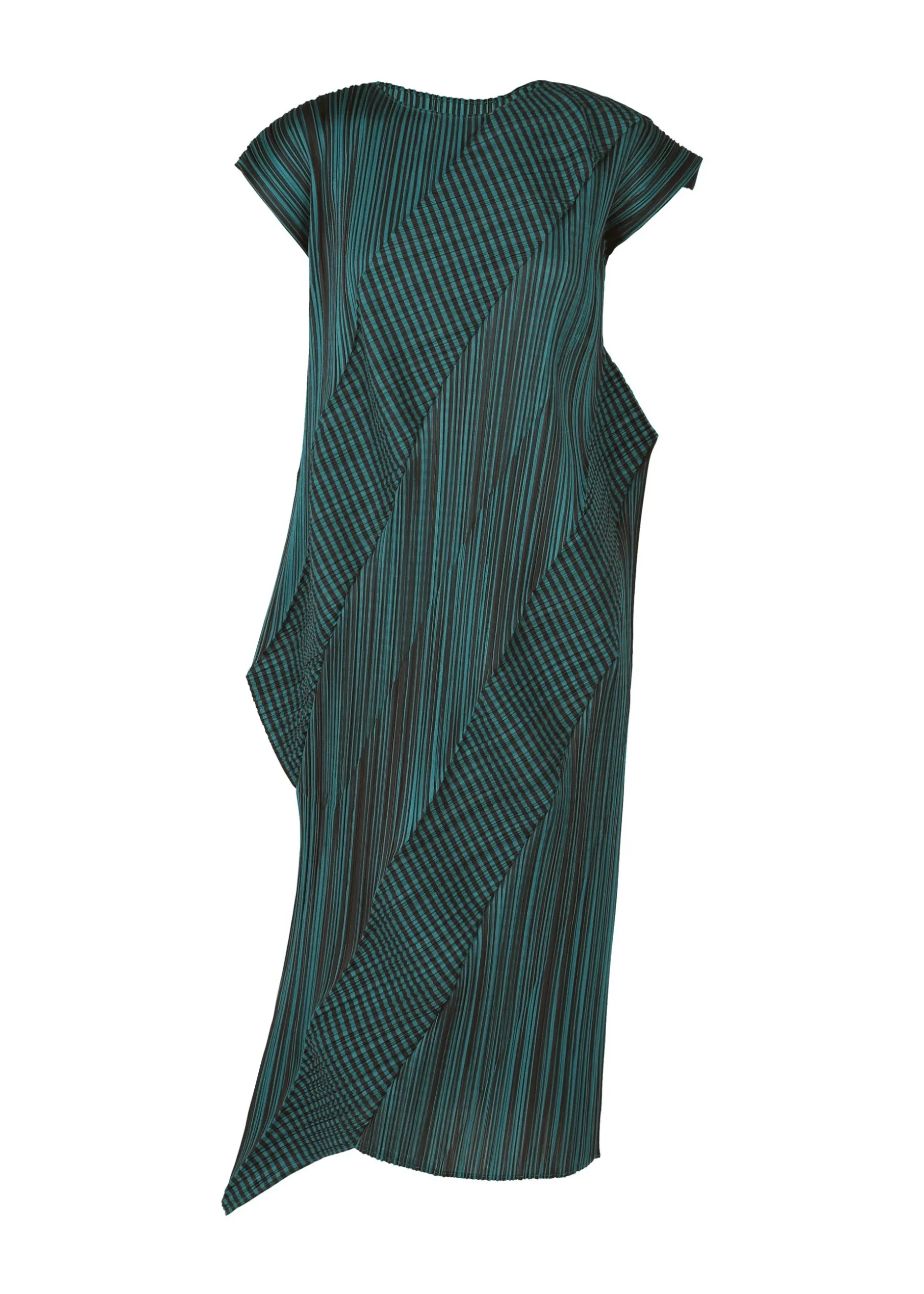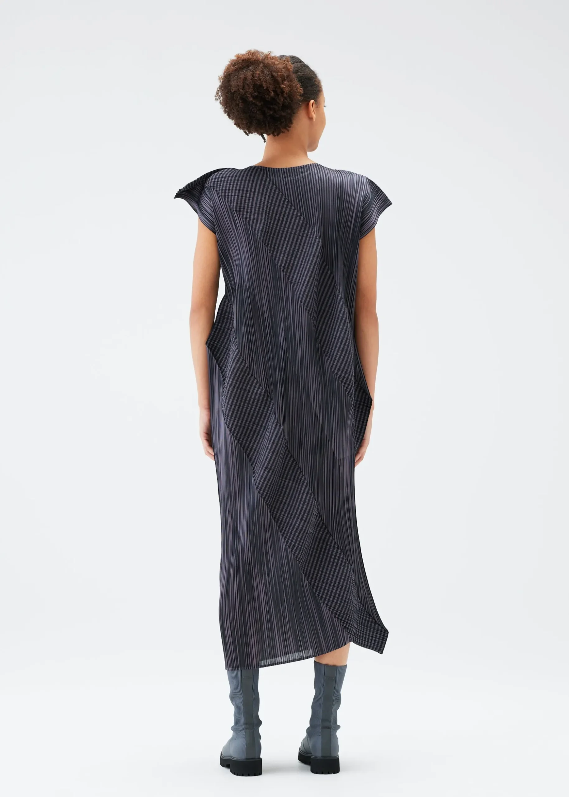This round-neck dress has a print inspired by rays of light moving through space. It is characterized by the beautiful look of the diagonal and vertical pleats created by pleating the fabric after folding it in a stairs-like pattern, and by the moiré pattern created by the transfer print.