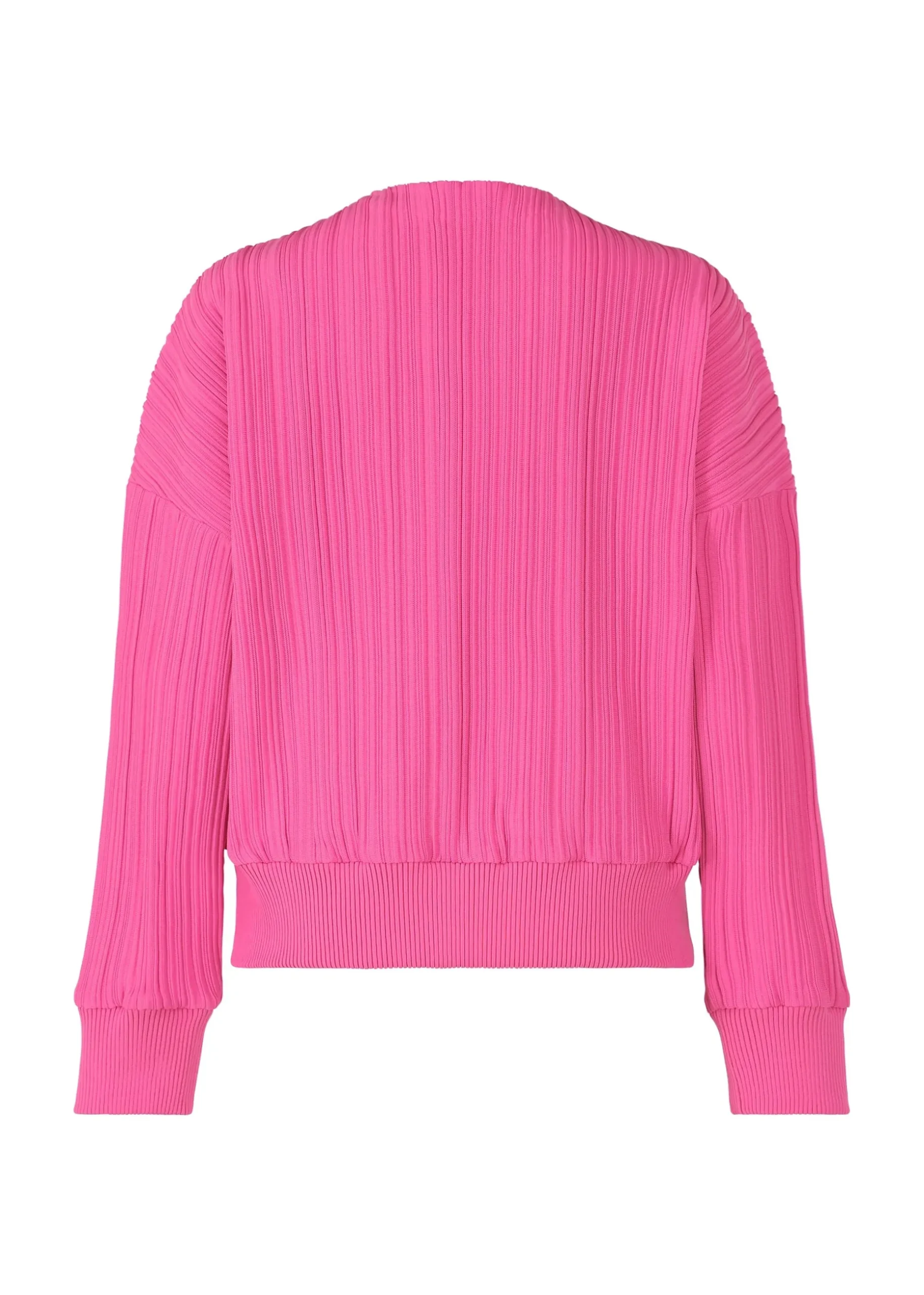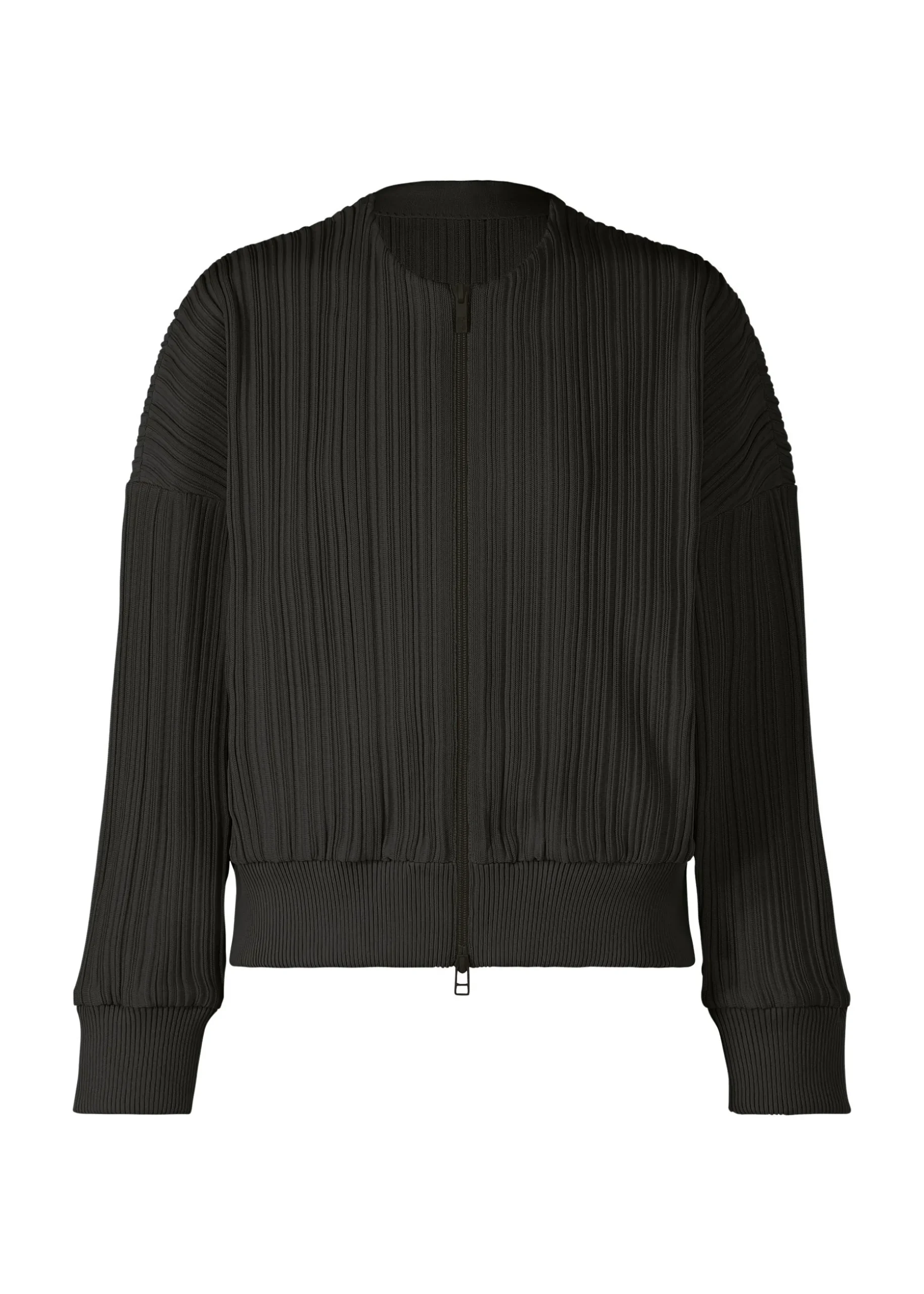 This knit jacket with a zipper features pleats in a horizontal knitting structure. It is characterized by being easy to care for as it is lightweight and machine-washable due to being made from 100% recycled polyester. There are pockets on both sides.