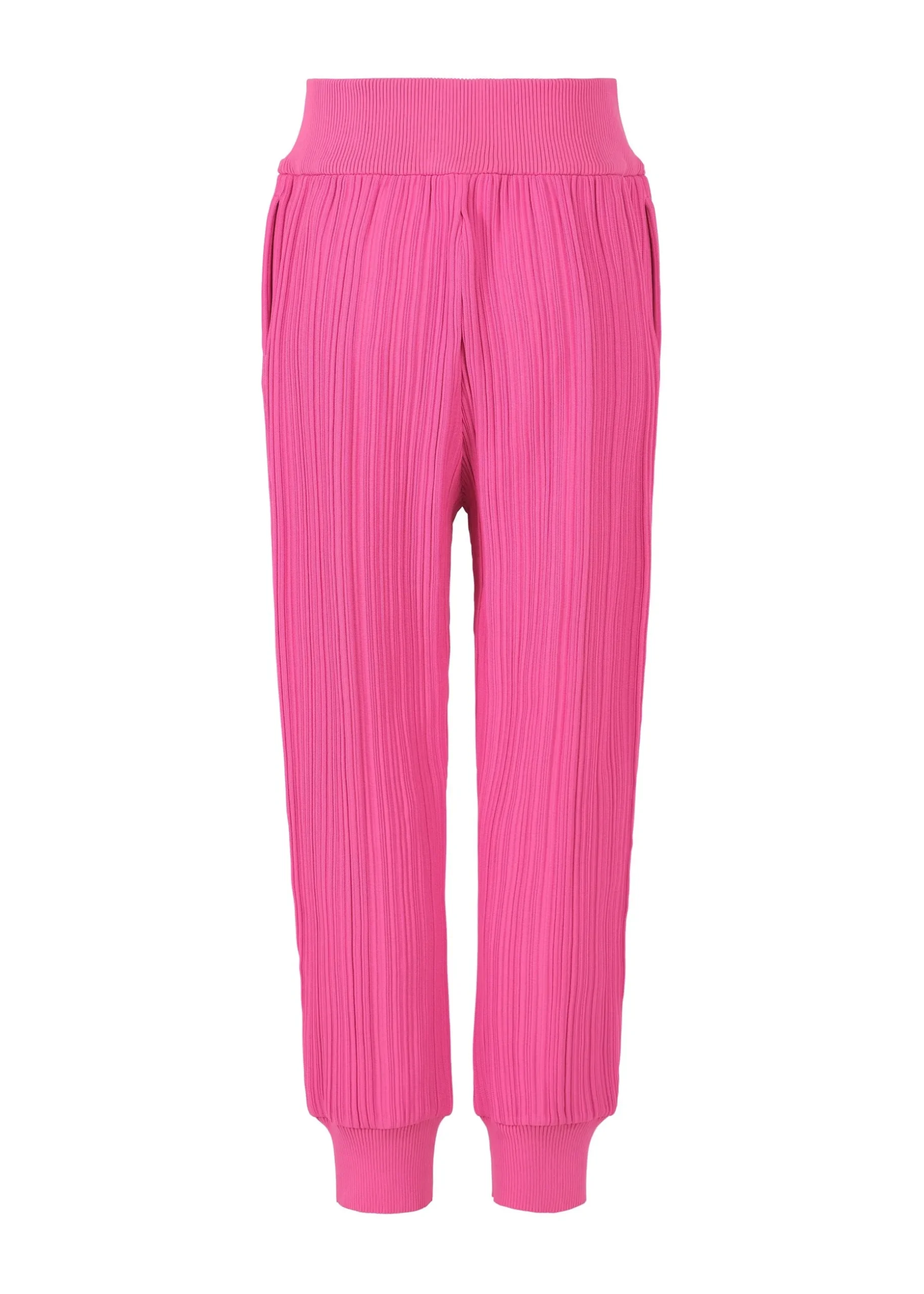 These knit pants feature pleats in a horizontal knitting structure. They are characterized by being easy to care for as they are lightweight and machine-washable due to being made from 100% recycled polyester. There are pockets on both sides.