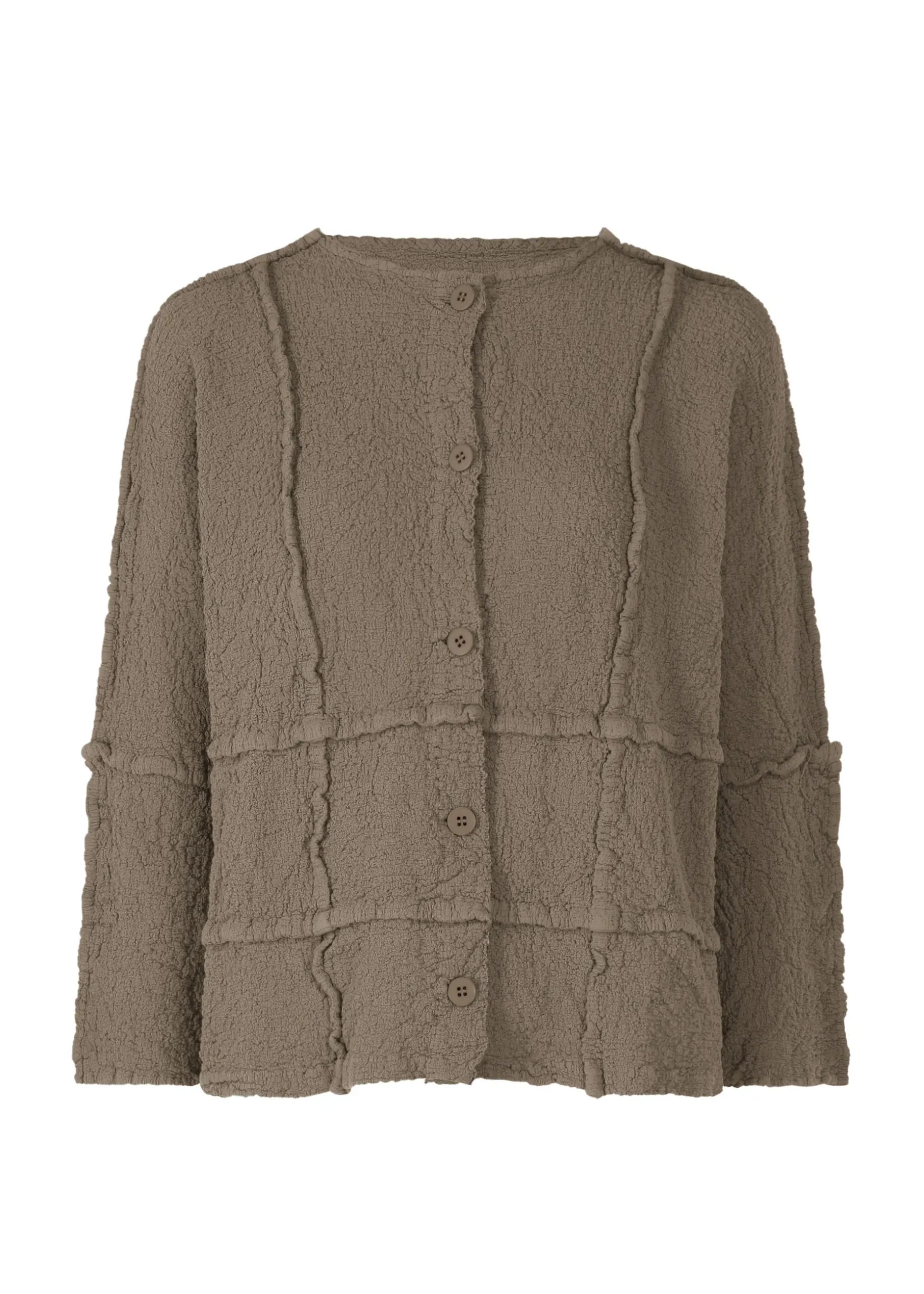 This CAULIFLOWER long-sleeved cardigan is characterized by the feel of its material that has the excellent comfort unique to cotton as well as a stretchy unevenness. The seams are exposed to create a checkered pattern. The simple design in a cotton blend material makes this an item that can be worn throughout all seasons.