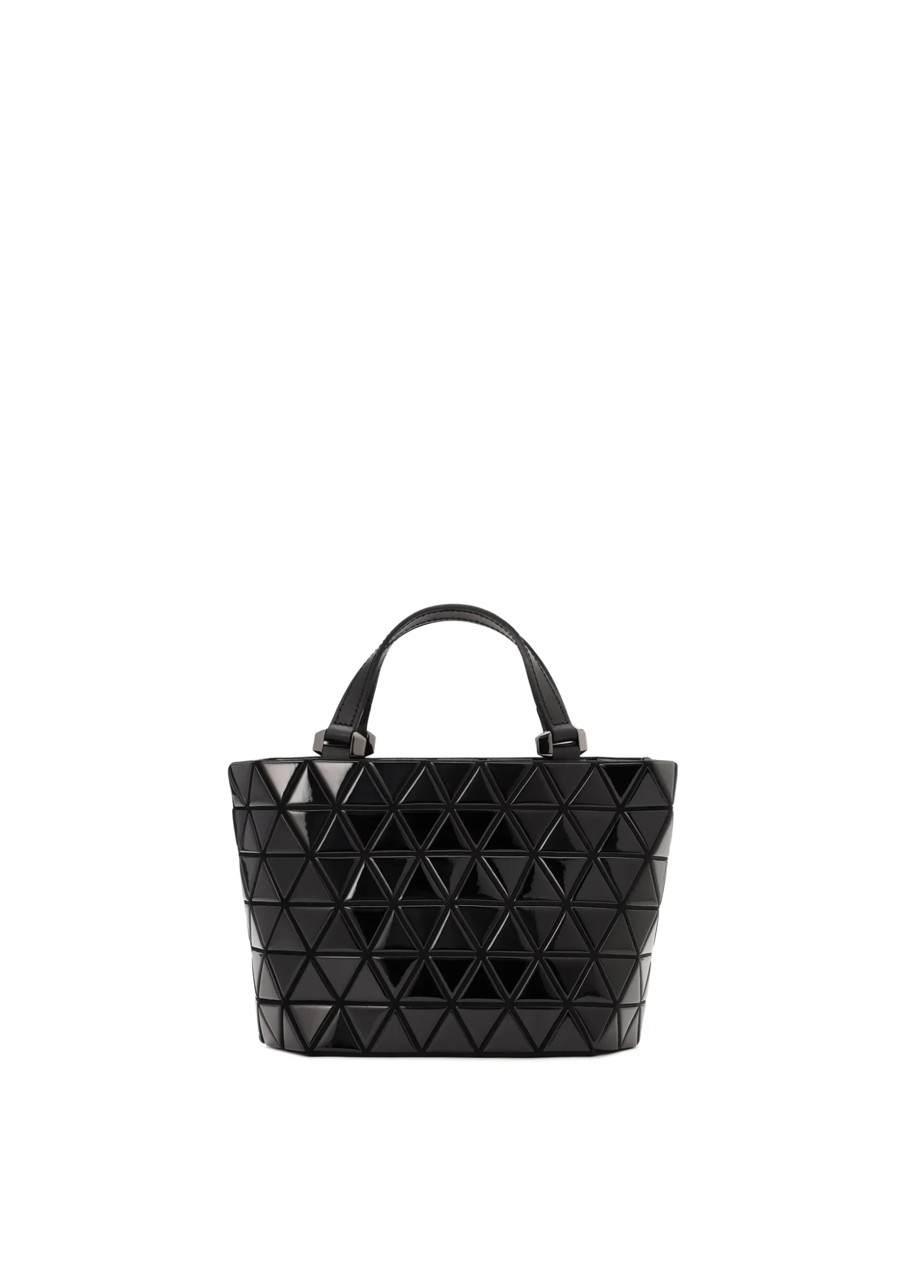 This elegant small handbag combines triangular pieces made from glossy enamel material with leather straps and handles. The straps are detachable. It has two inside pockets that are convenient for organizing your card case, keys, and other items. Its size allows it to hold a smartphone and wallet.