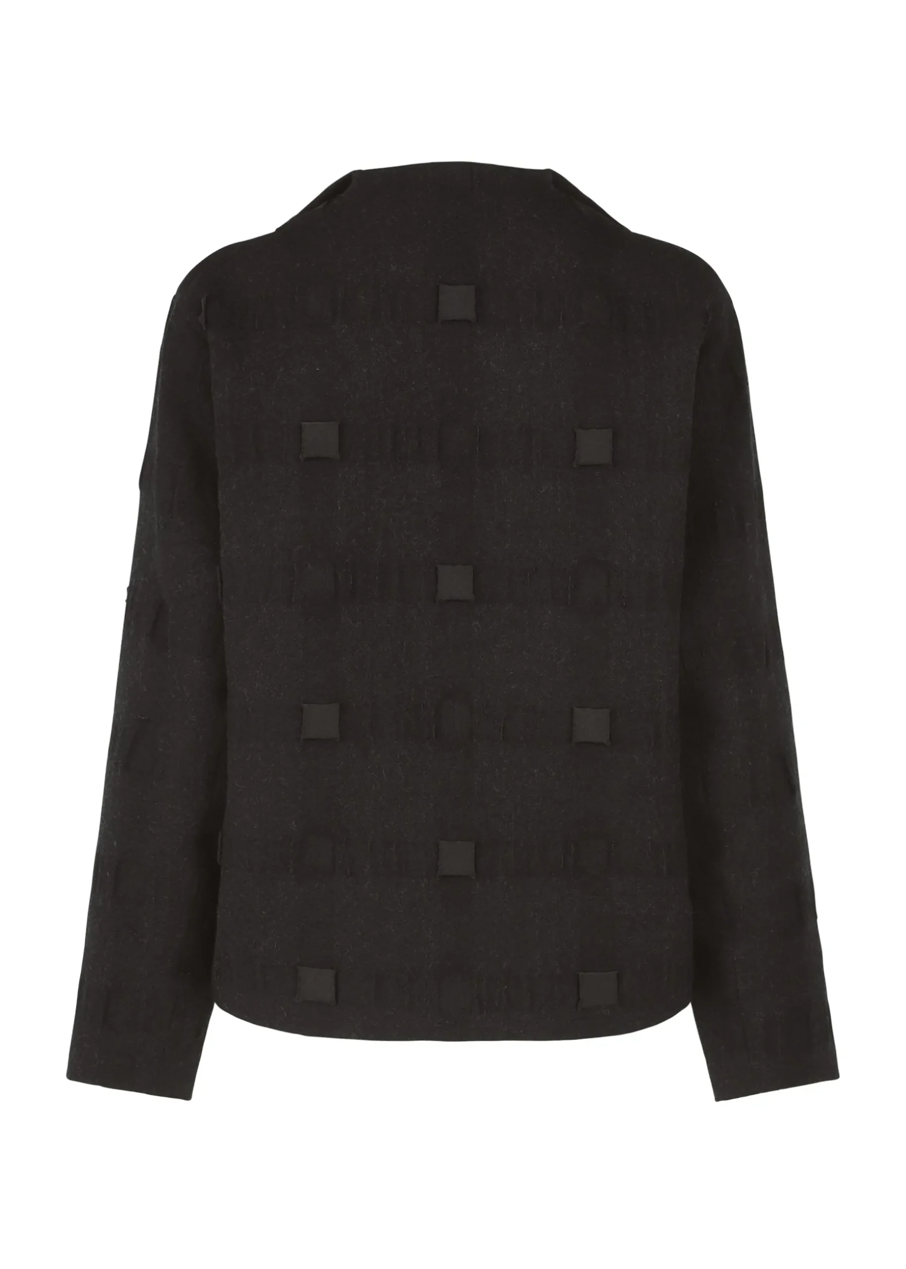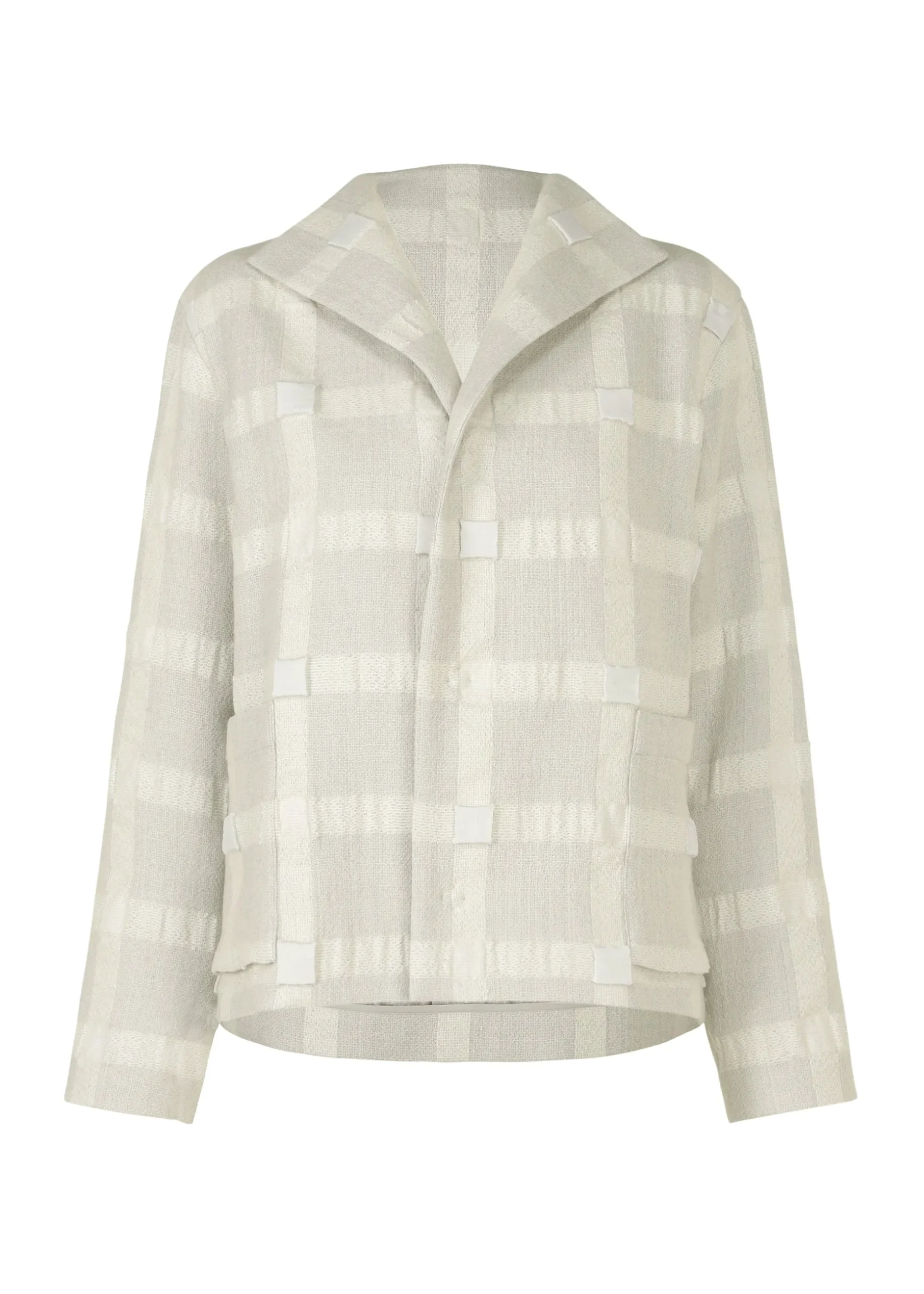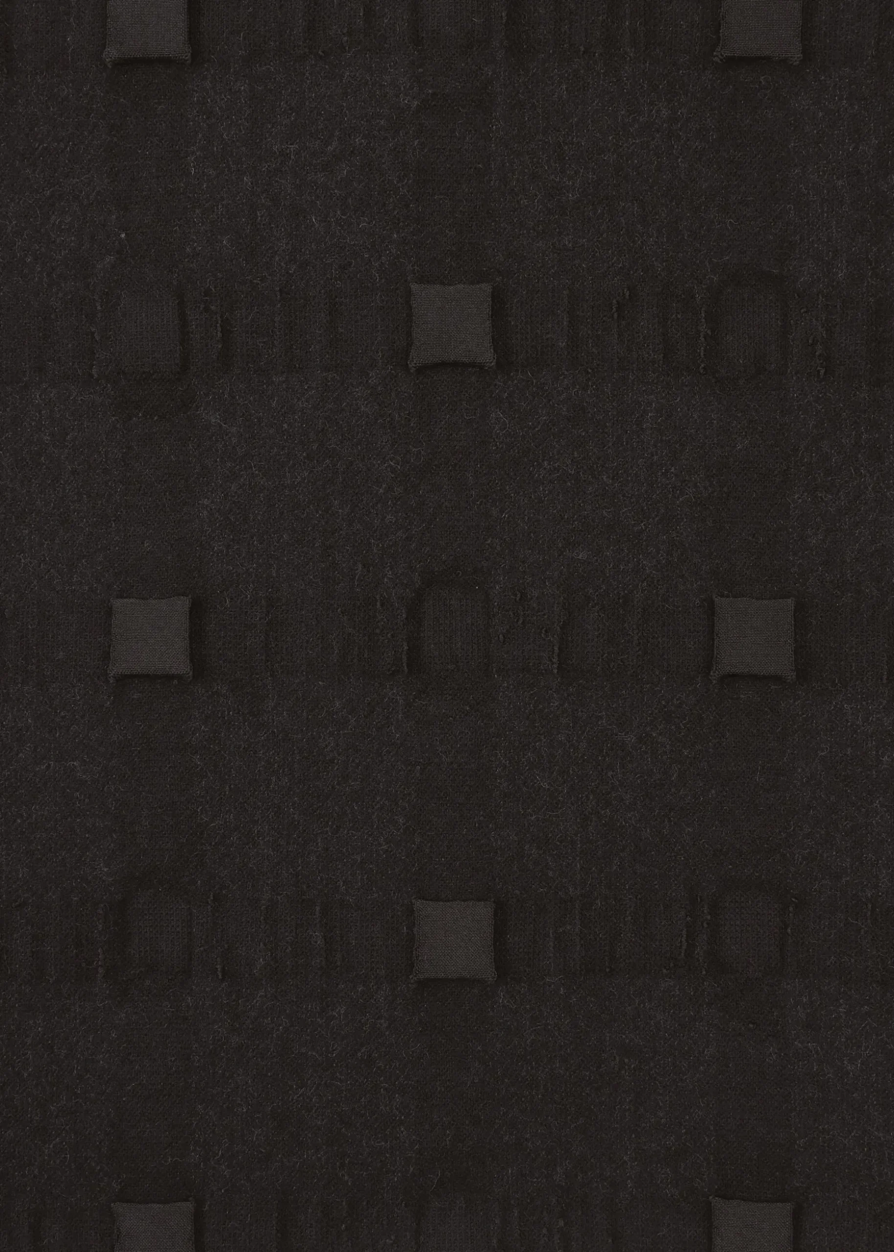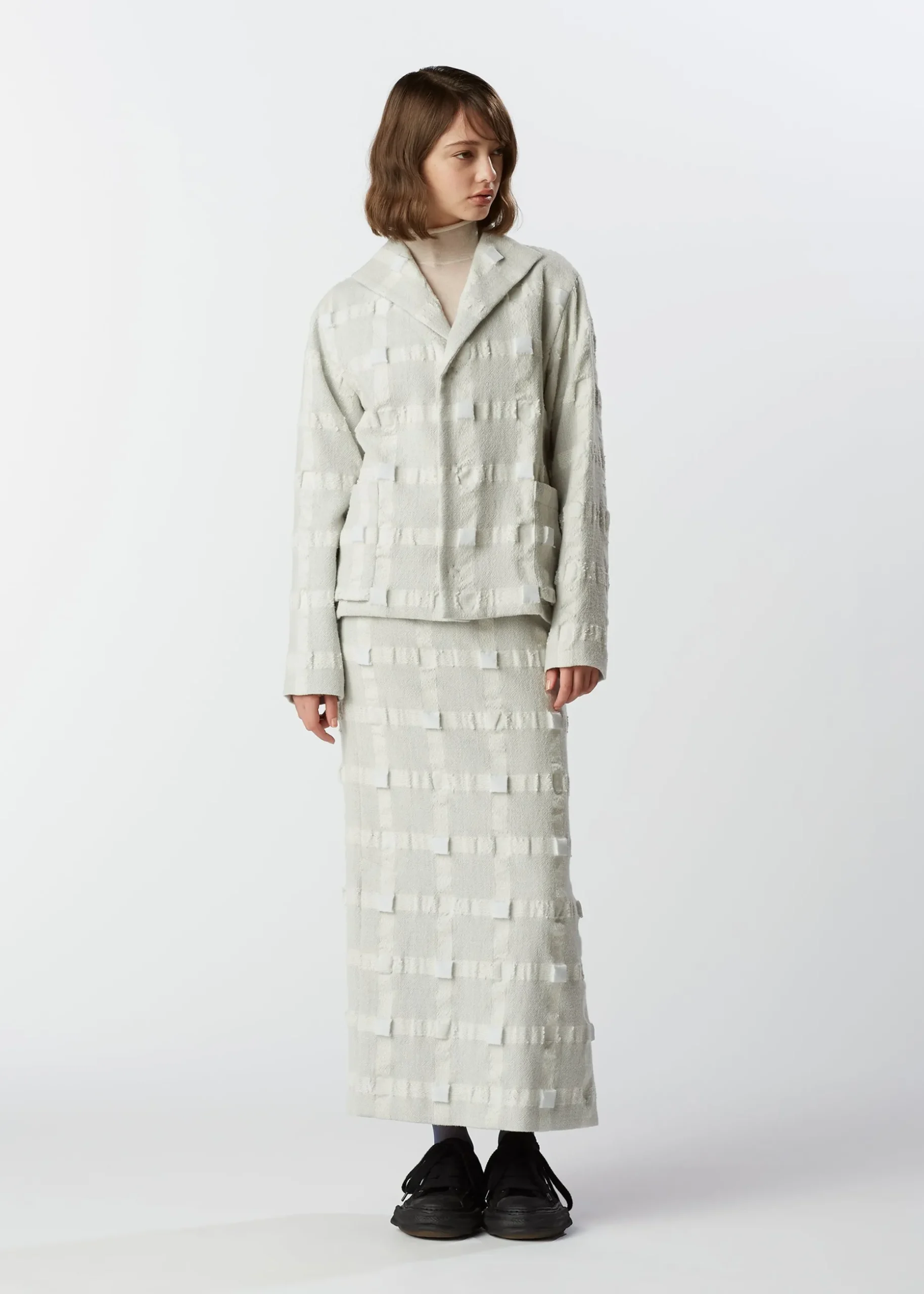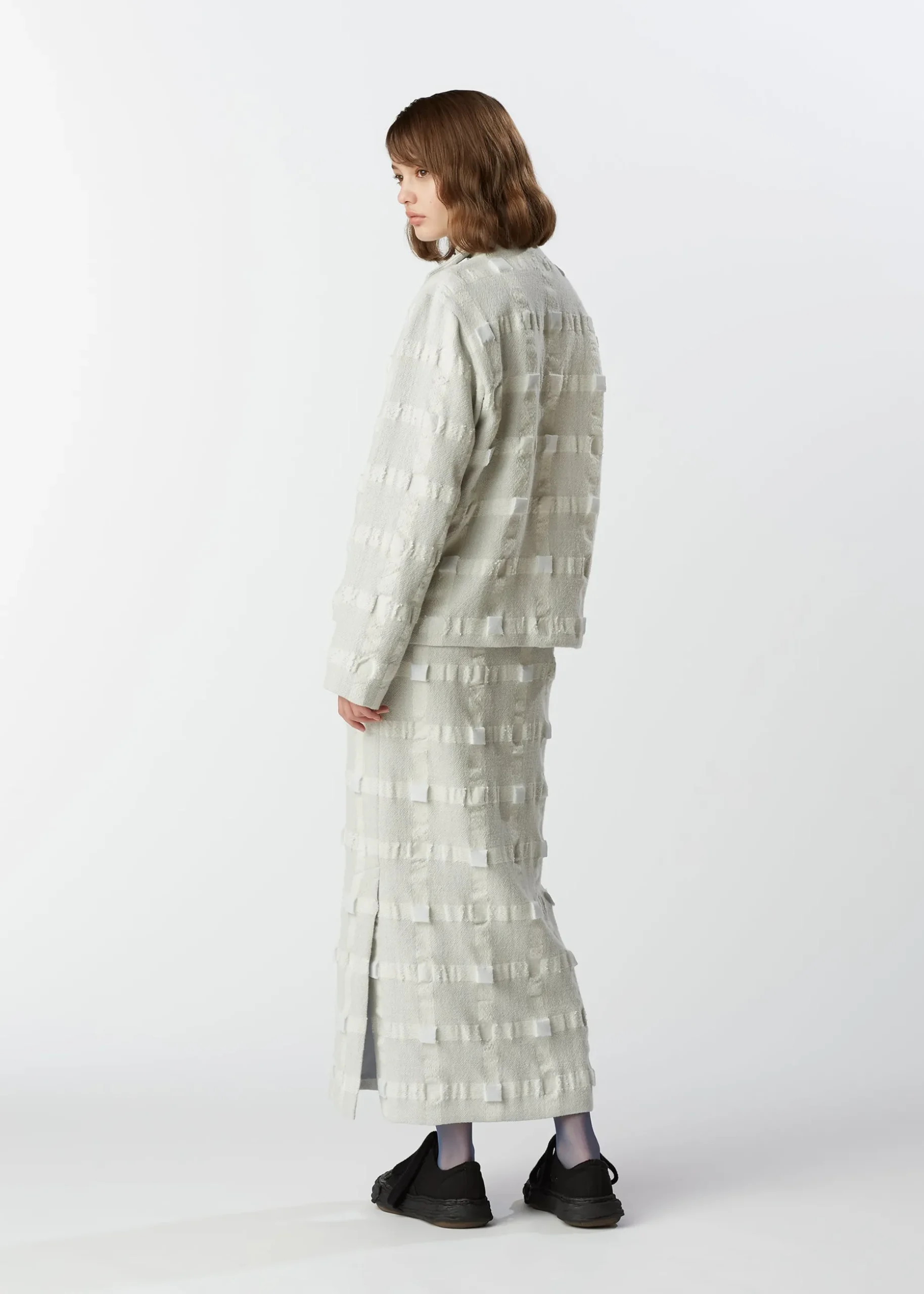 This jacket uses a three-dimensional textile that is made of wool and recycled polyester in a lattice pattern, triple woven, and then filled into a cube shape.