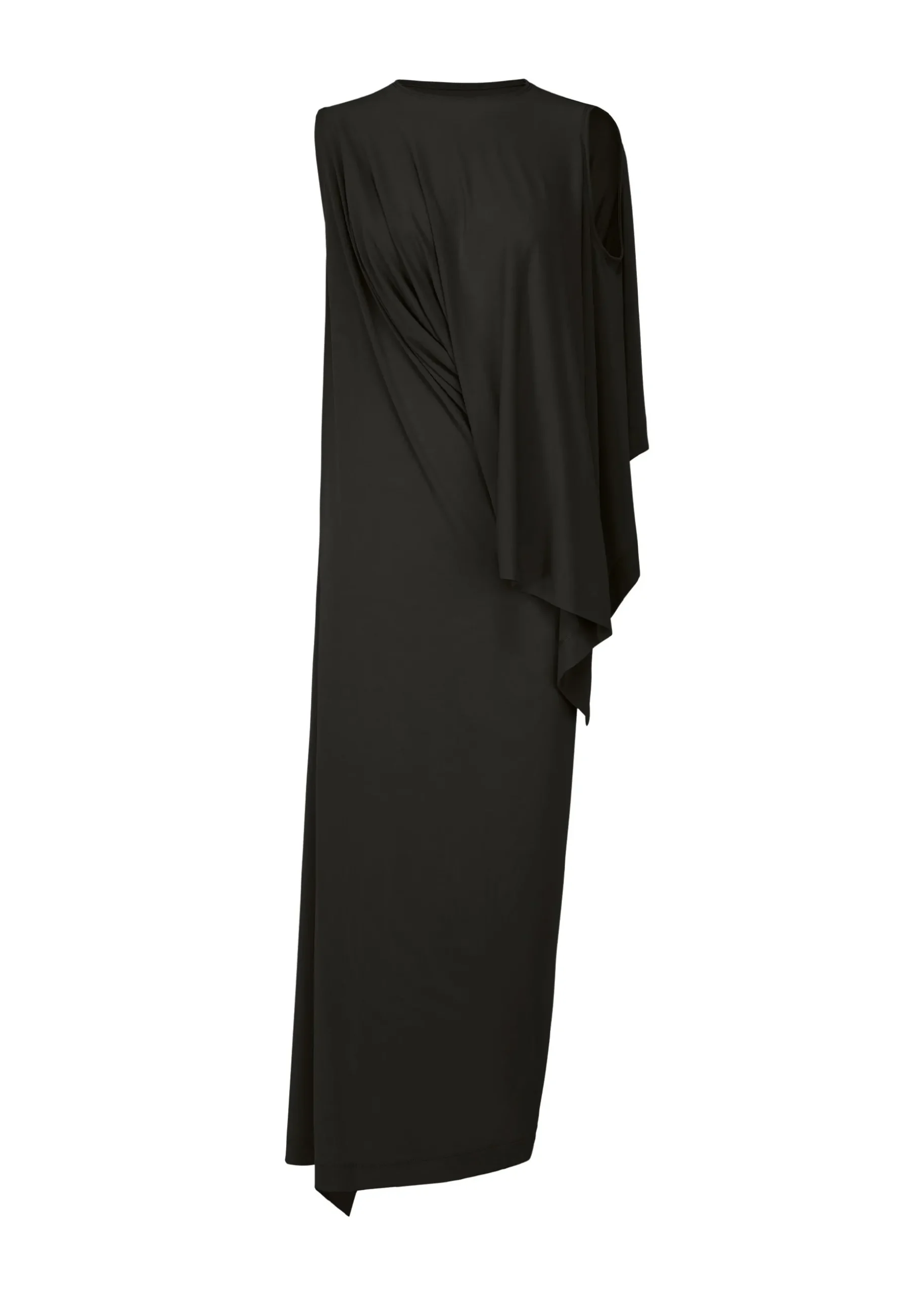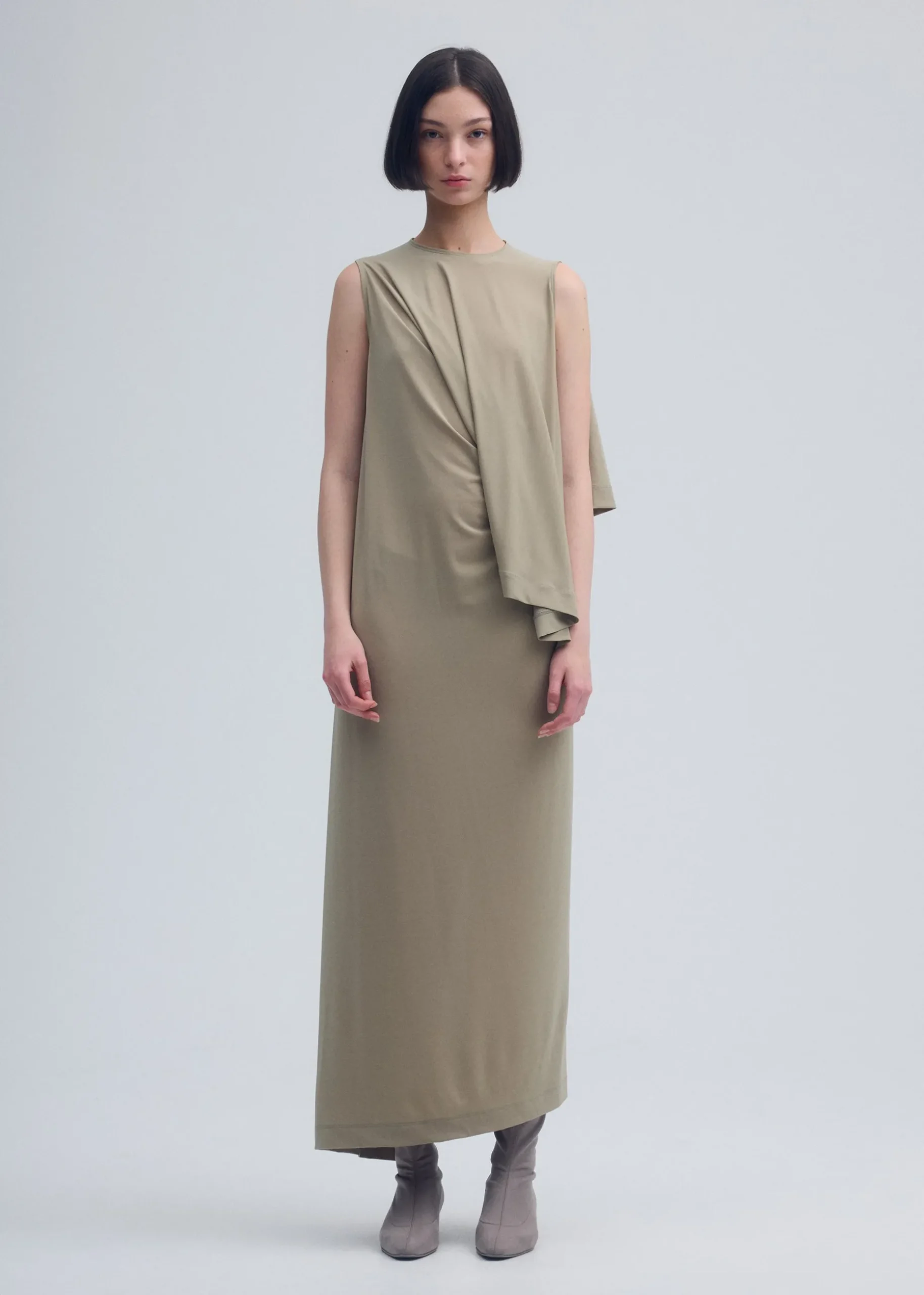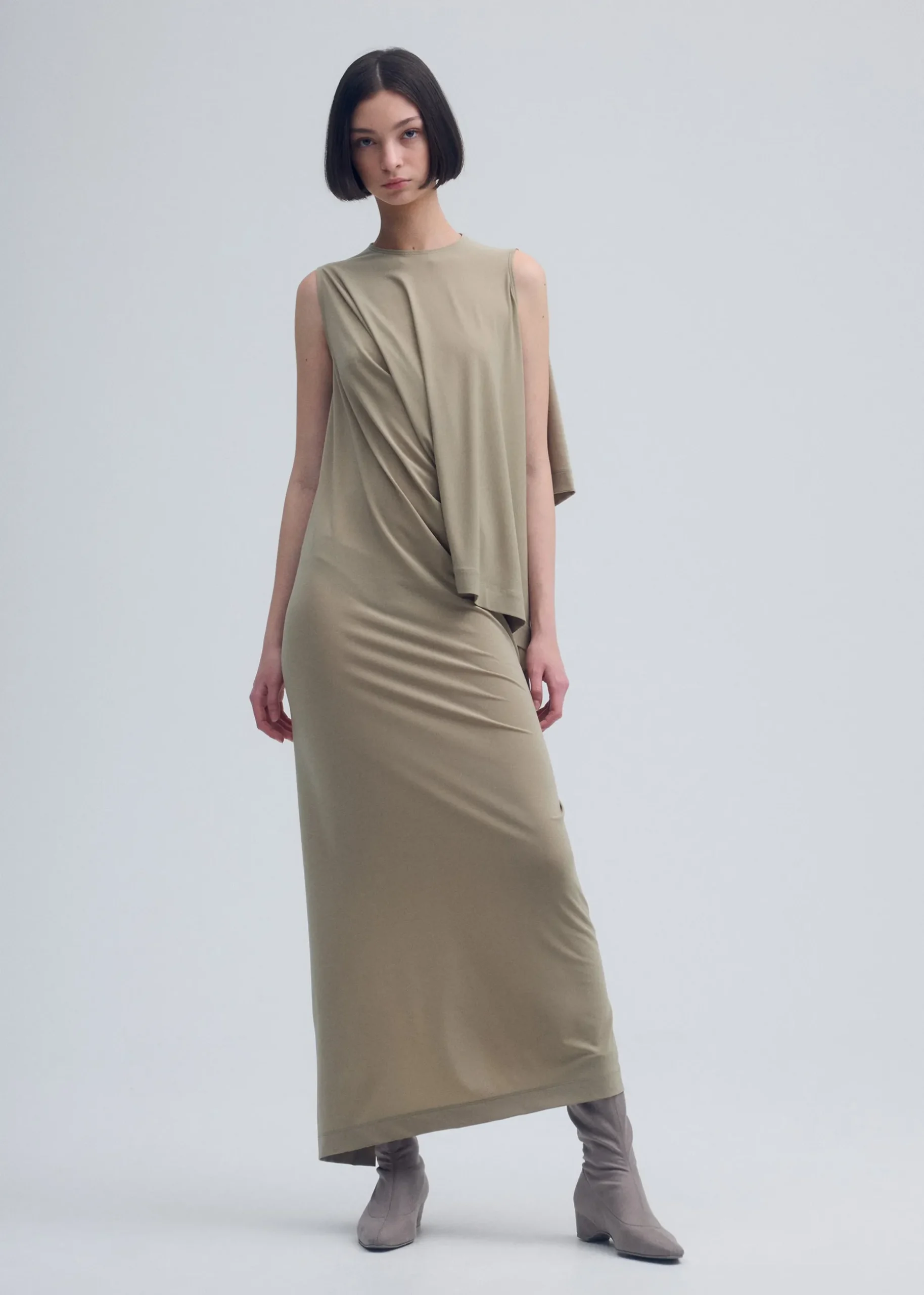 This sleeveless jersey dress is characterized by its flowy, draped design.