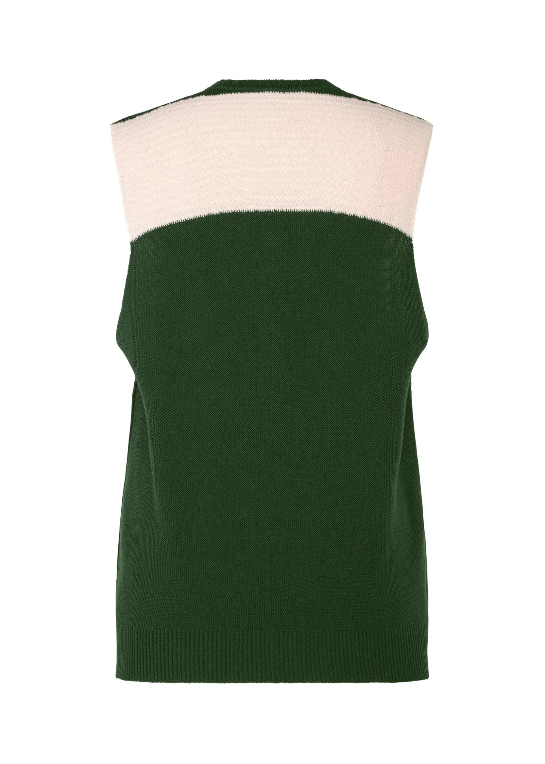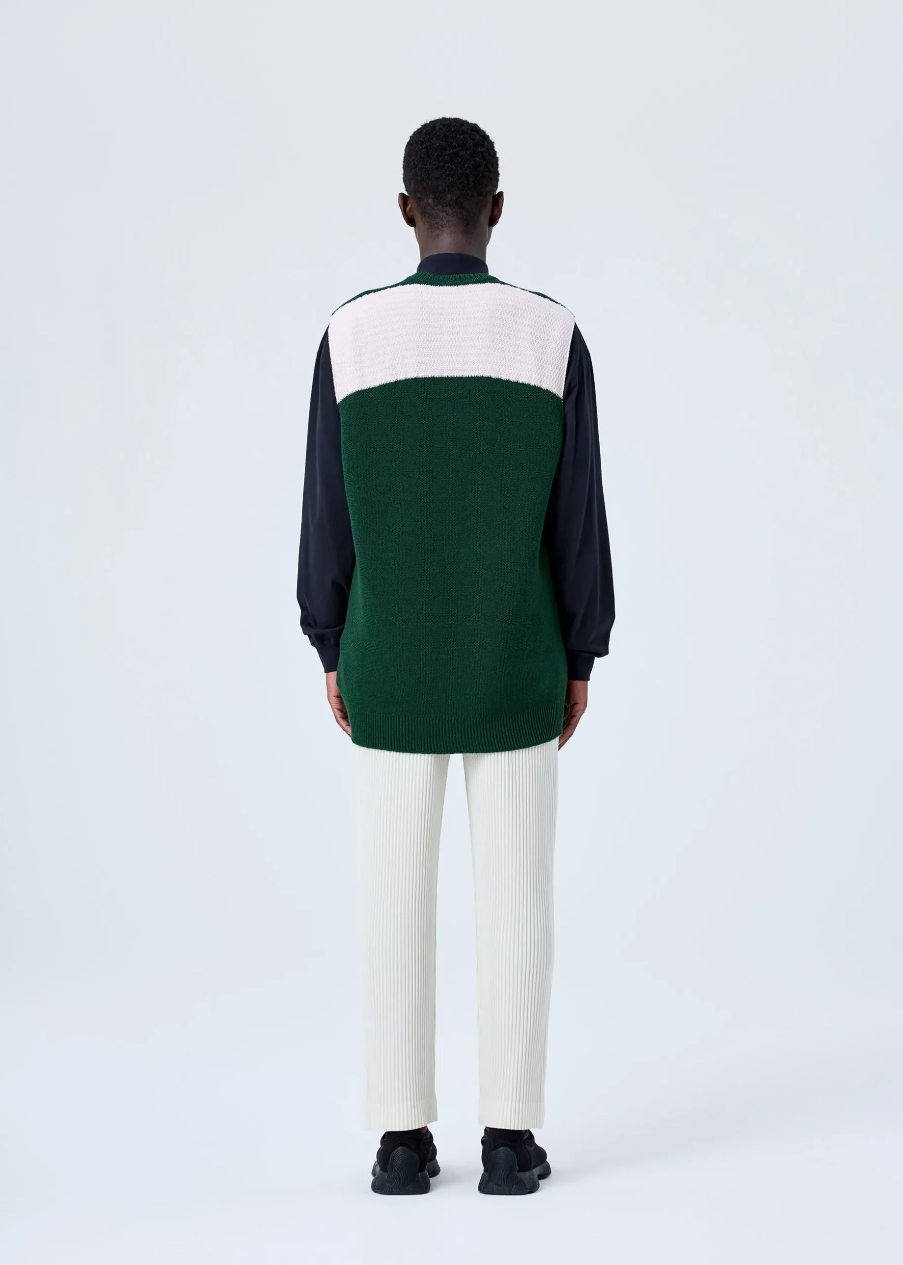 This three-dimensional round-neck knit vest features lines drawn across the knitted fabric. The lines of designer/artist Ronan Bouroullec’s drawings are boldly expressed by alternating the stitches and color scheme. The vest is characterized by its relaxed silhouette.