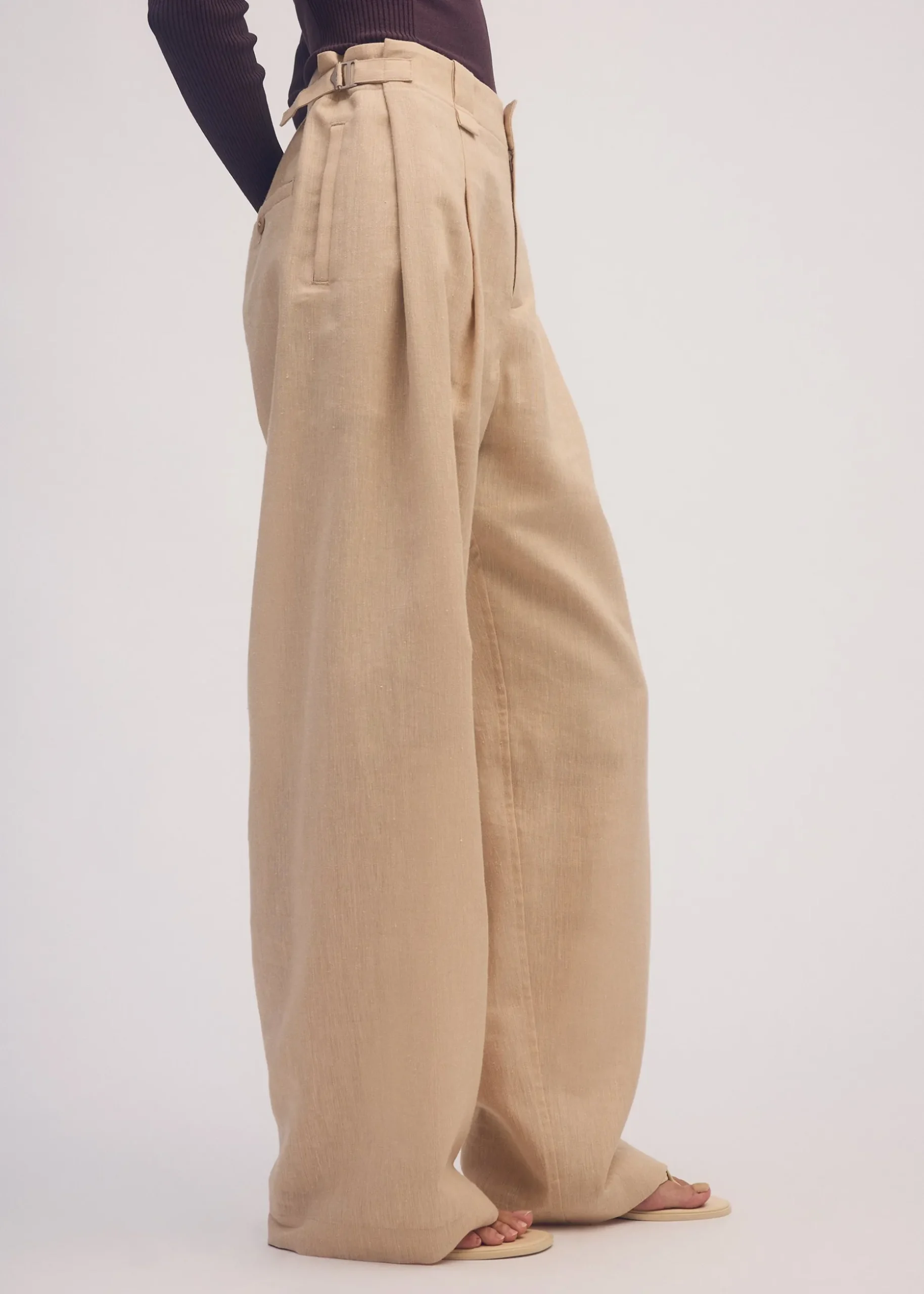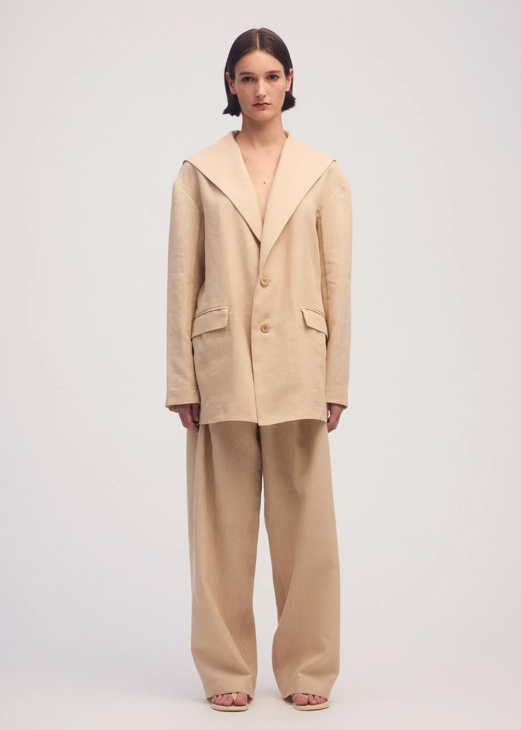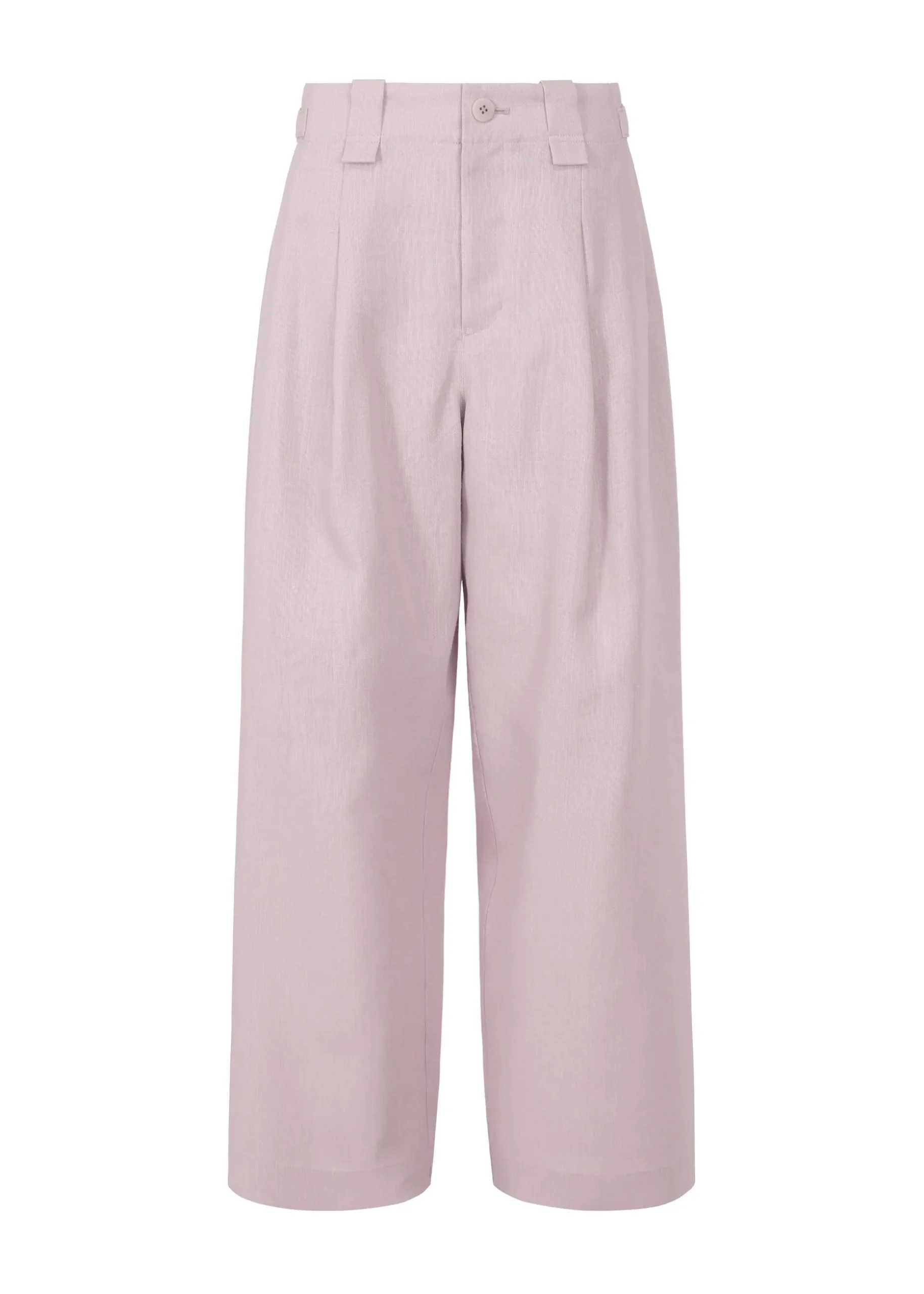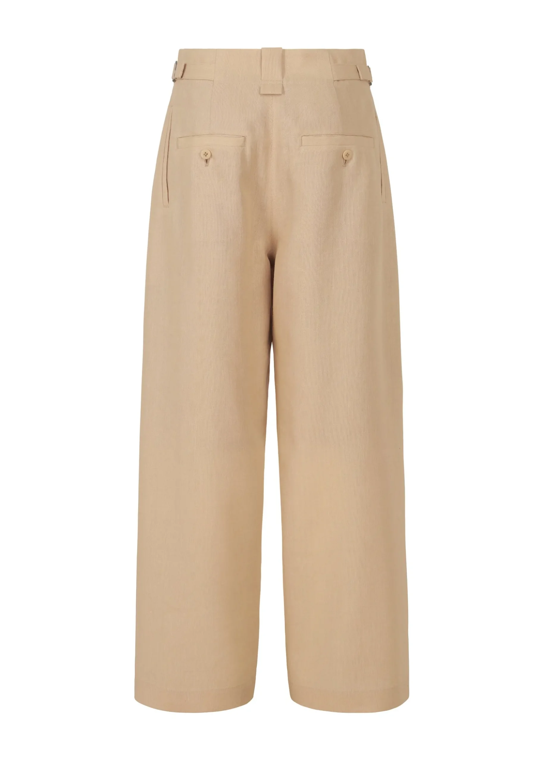 These pants are characterized by their material that combines hemp’s distinctive tautness and strength with the warmth of mohair and wool. They are made using custom-order spun thread, with hemp for the warp and mohair and wool for the weft. The yarn-dyeing process creates subtle variations in color between the warp and weft, resulting in a beautiful hue with a sense of depth.