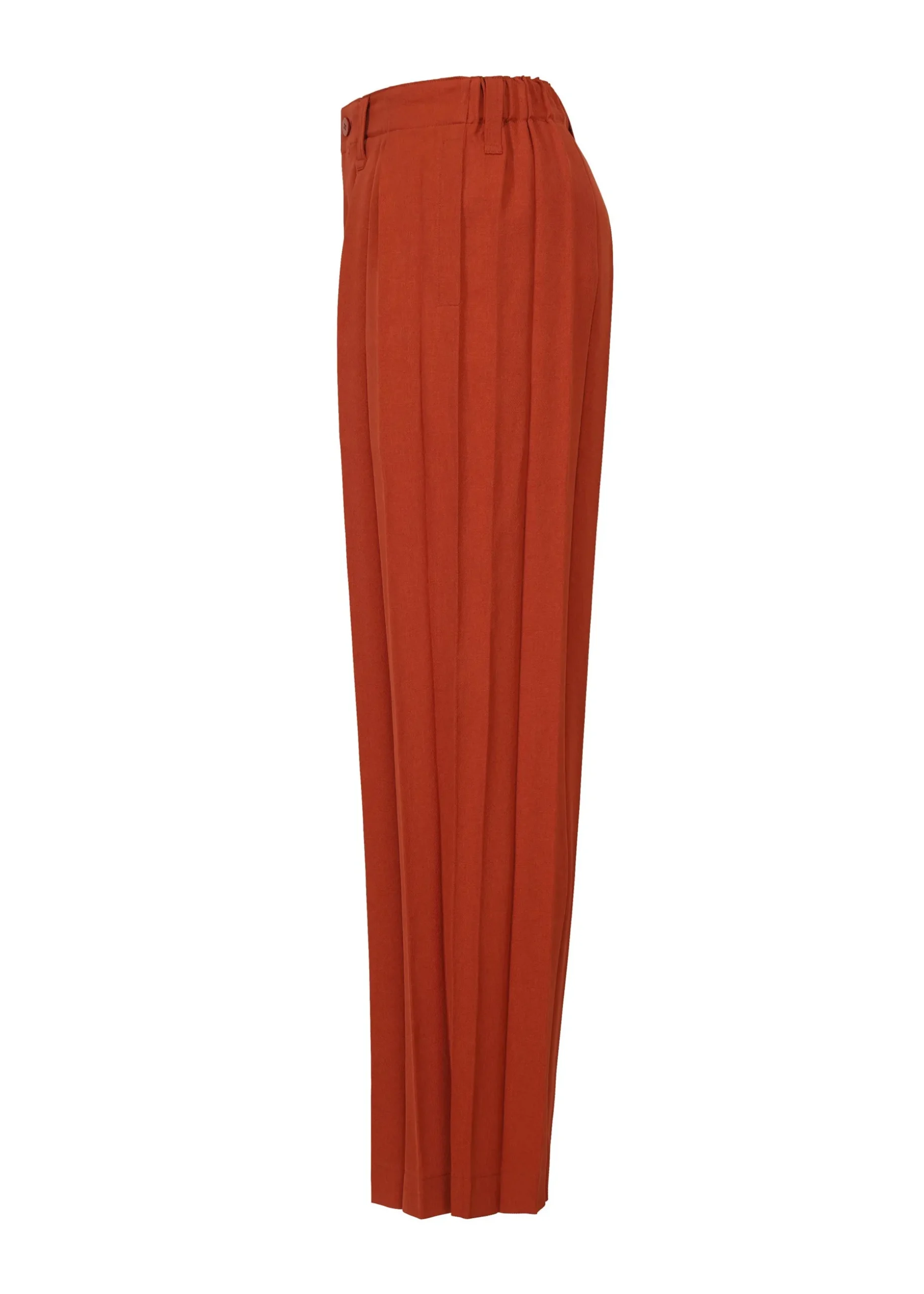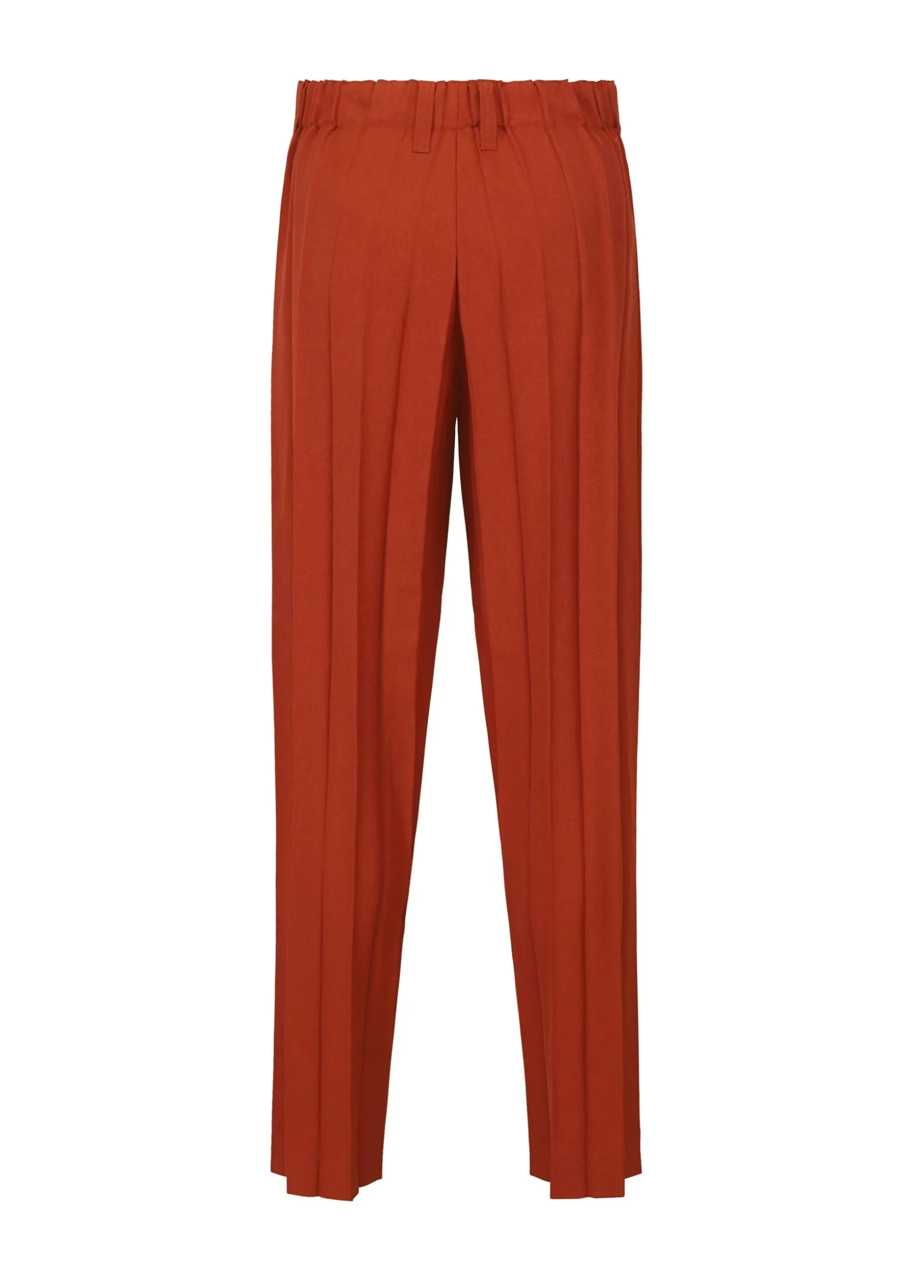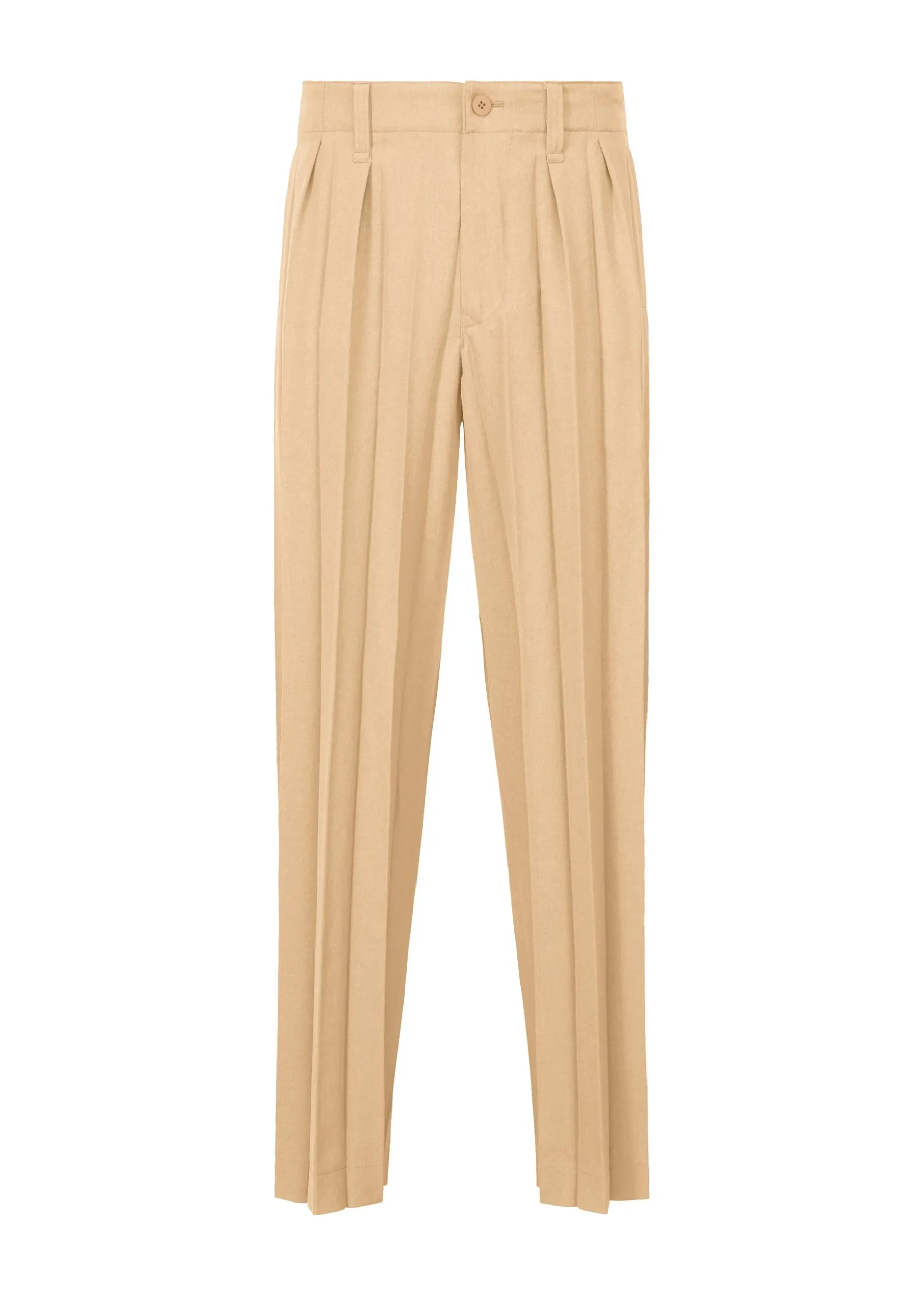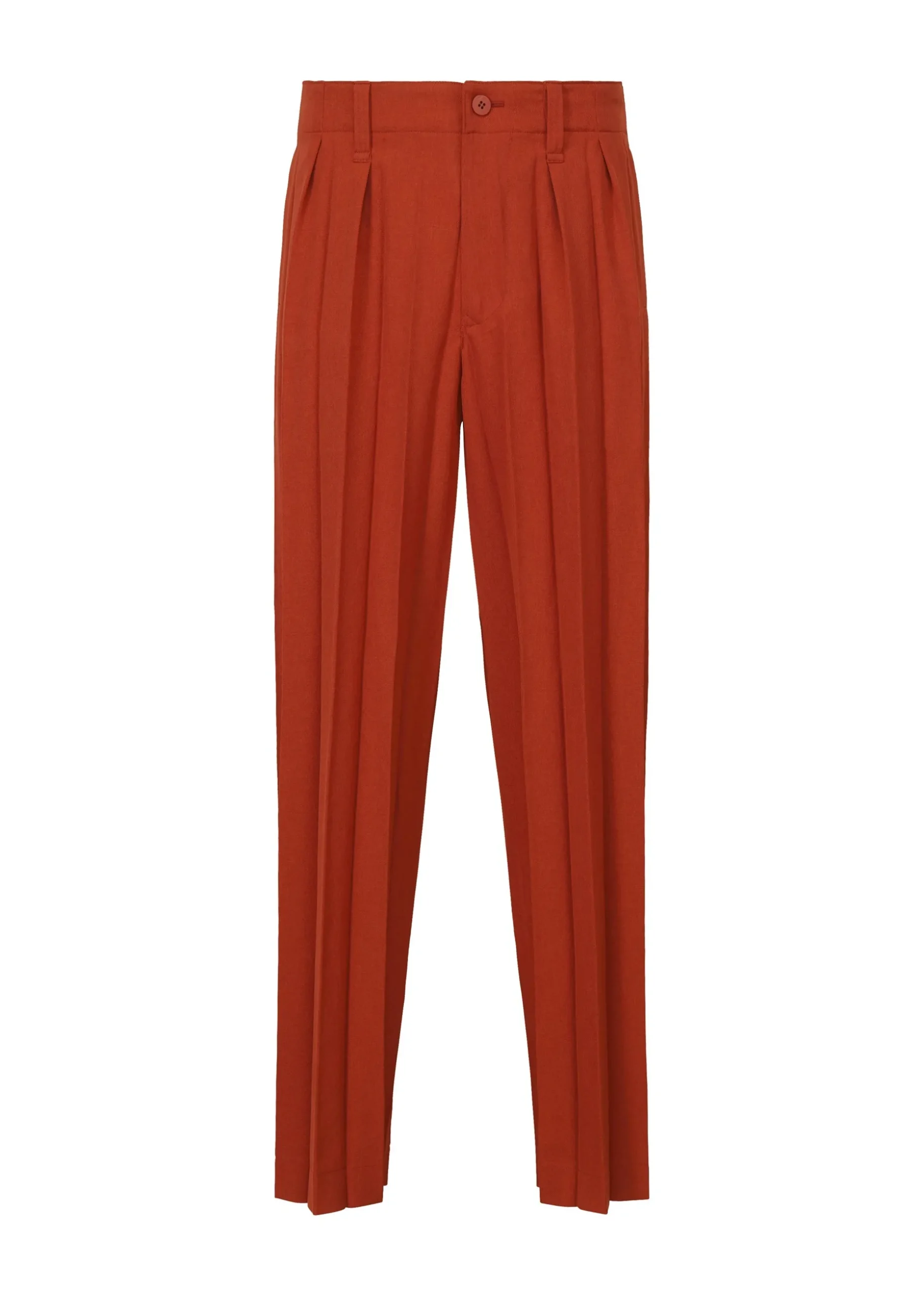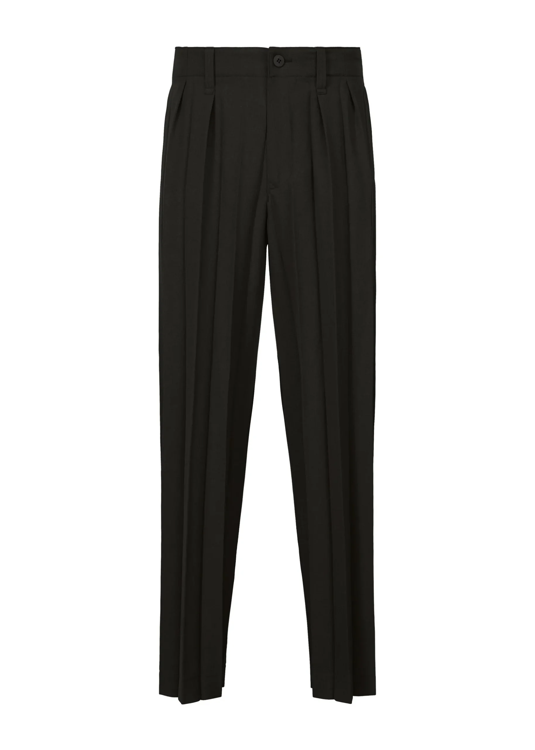 These straight pants are made from glossy material with wide accordion pleats. They have pockets on both sides, belt loops at the waist, and a button-fly design.