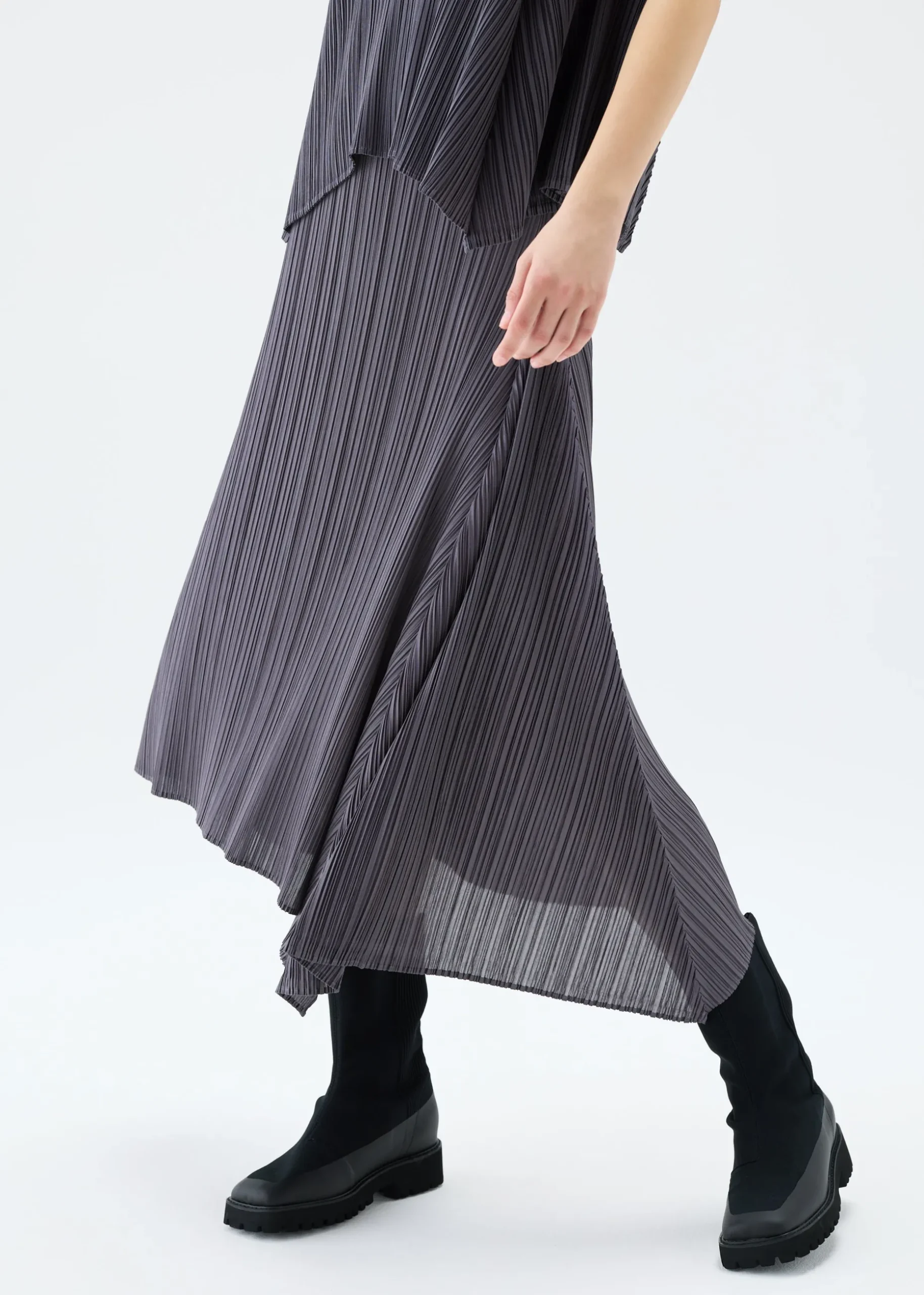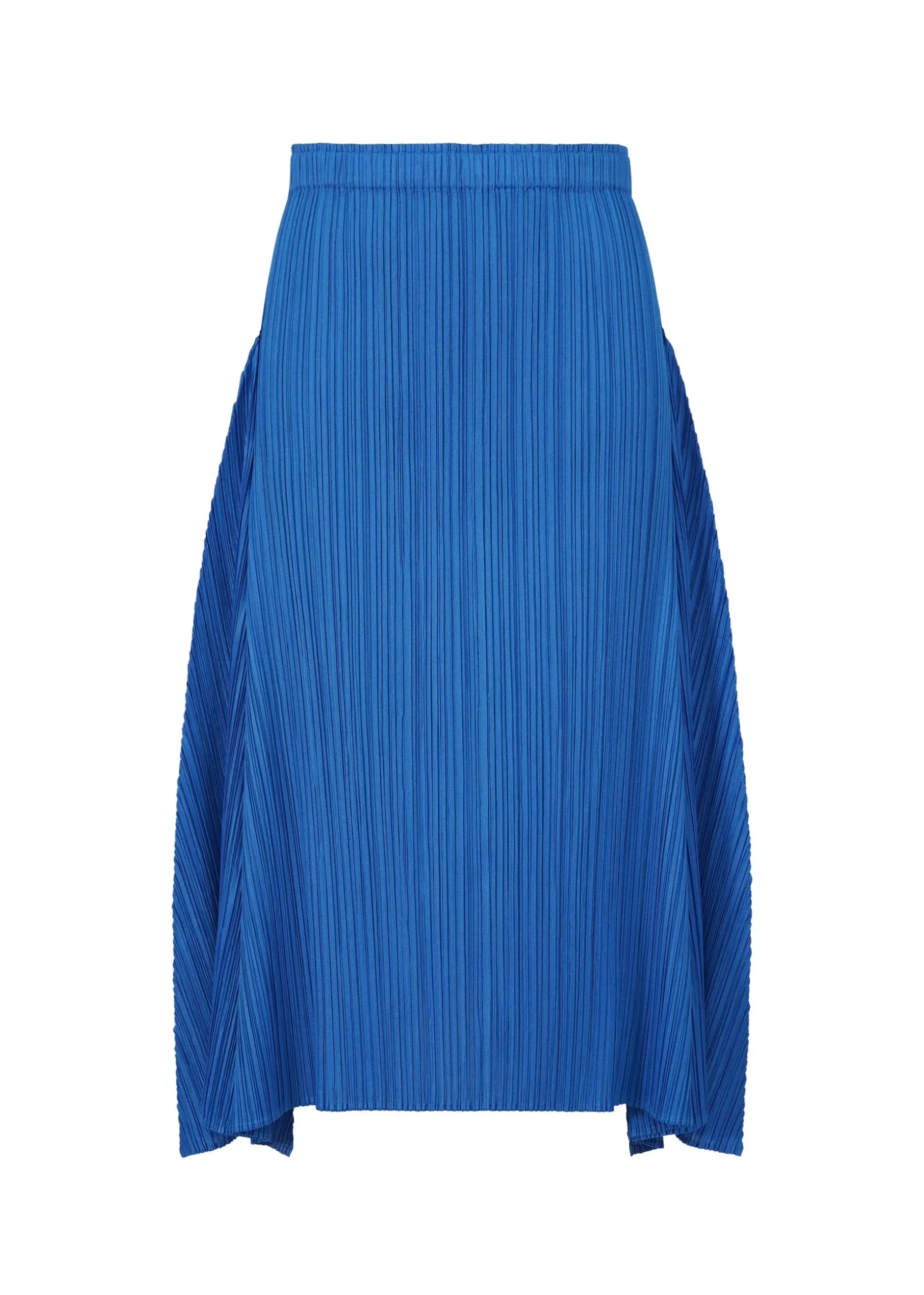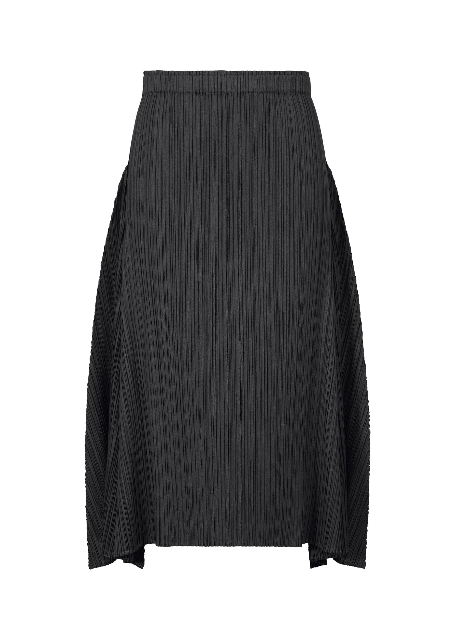 This skirt is made via garment-making with a minimum amount of cutting and sewing while making full use of the garment pleating technique. It is characterized by its flared silhouette created by not cutting off the fabric. It is available in basic colors that are easy to style in outfits.