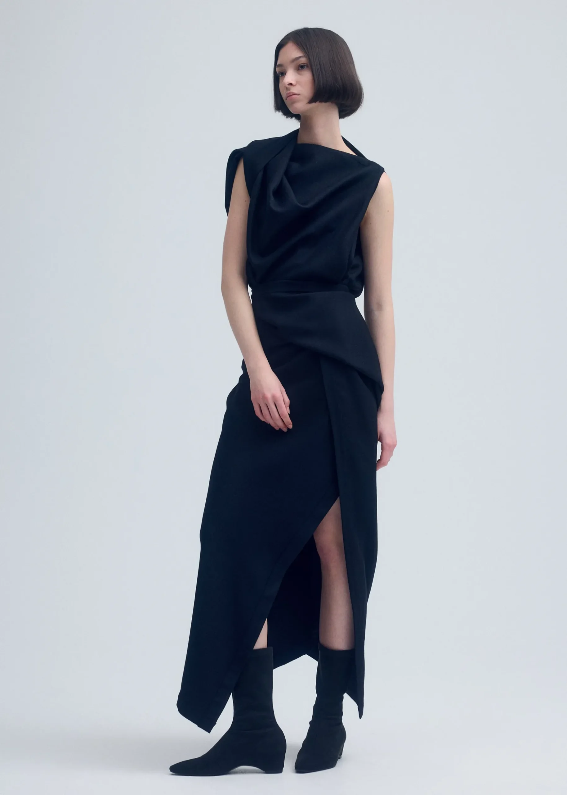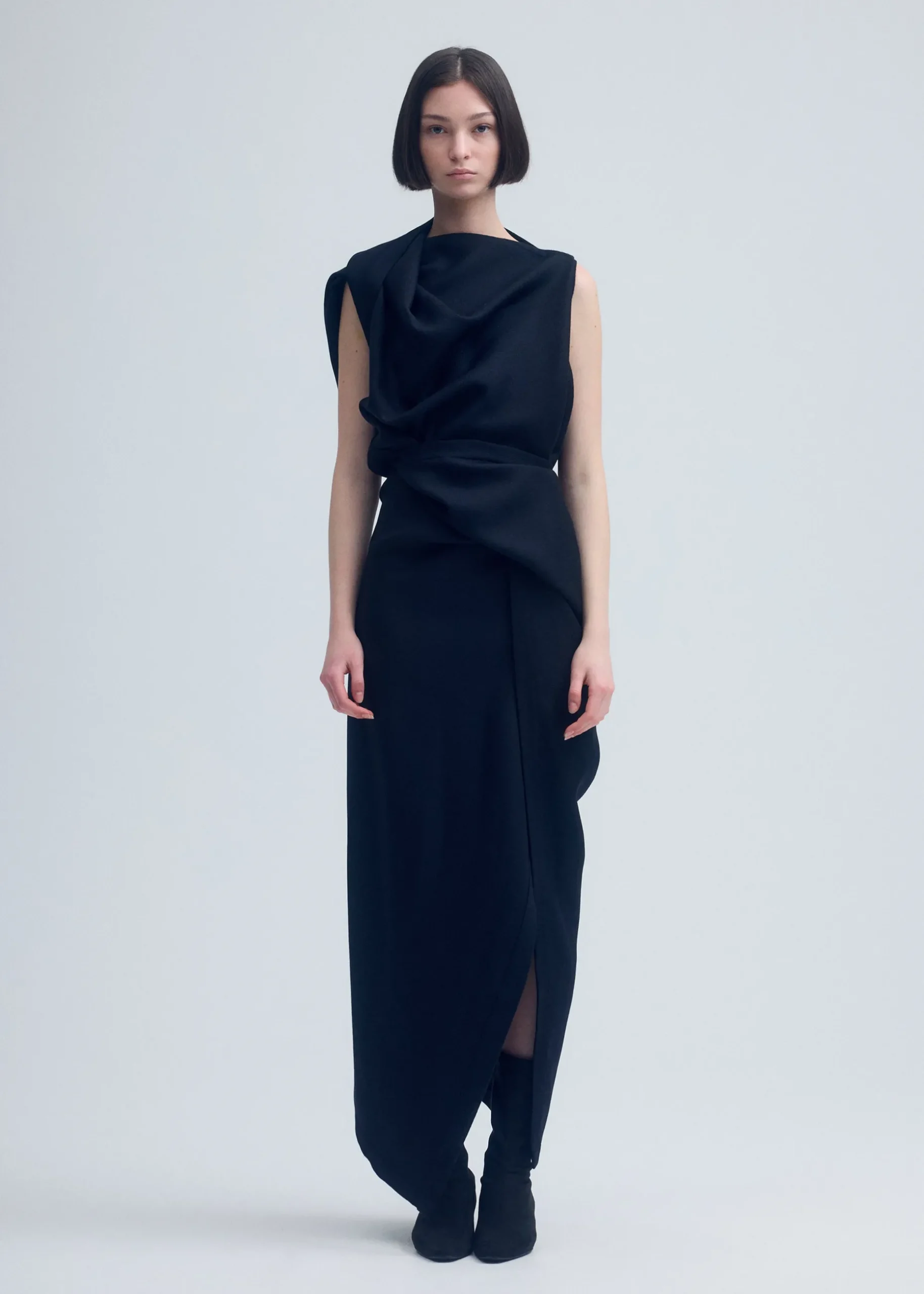 This dress is characterized by its design that makes you look enclothed in vivid colors. It is made from 100% wool georgette material, which has a moderately plump feel and lovely coloring. The material undergoes processing to reduce surface fuzz, resulting in a subtle sheen that works in concert with the dress’s draped design to bring out the deep, shadowy color tones. The design, featuring voluminous thick fabric, makes the dress recommended for special occasions.