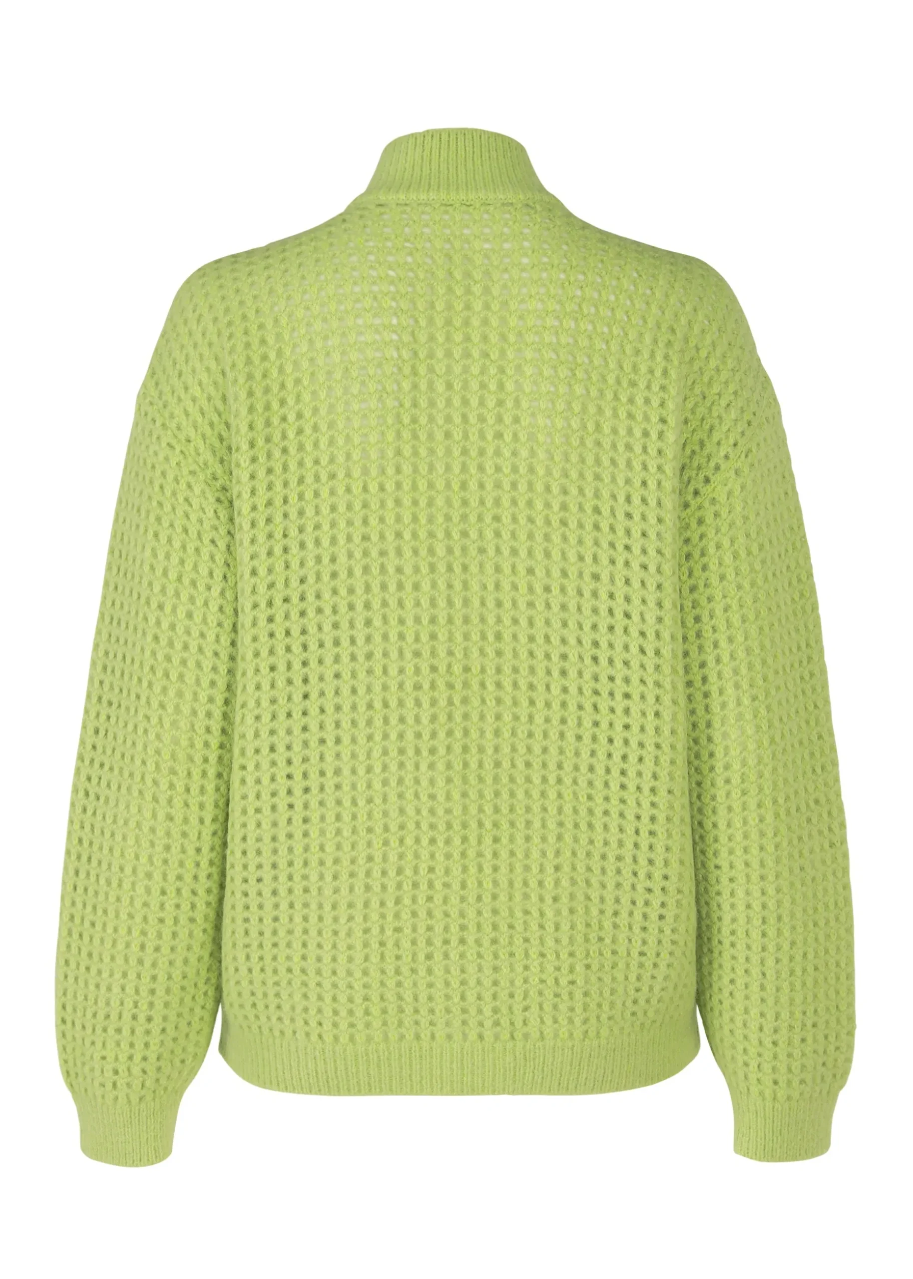 A low gauge cardigan featuring a mesh-like knitted fabric. Made with rare Thule baby alpaca from Peru. The long bristles are brushed, giving it a hairy, light and soft texture. In addition, by knitting together recycled polyester stretch yarn, we have created a moderate amount of kickback and firmness.