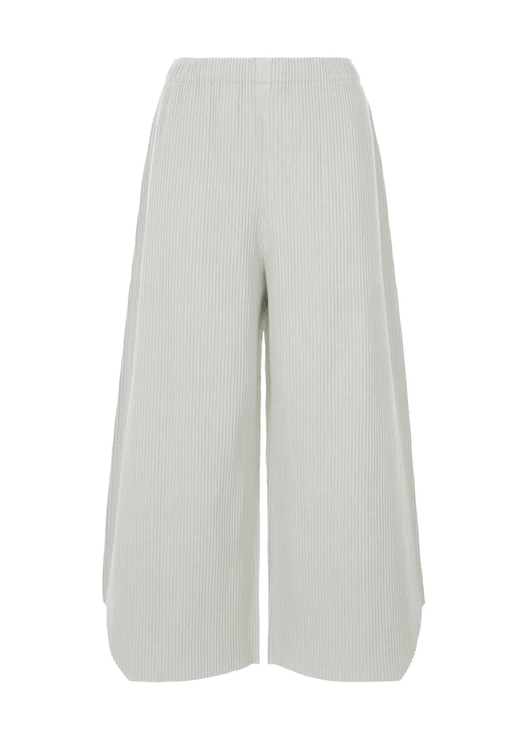 Fine knit pleated pants are made from a knit made of thin, soft yarn with stretch properties and are pleated for a lightweight and soft feel. The design of the hem with rounded corners gives it a sharp impression with the image of a jewel. There are pockets on both sides.