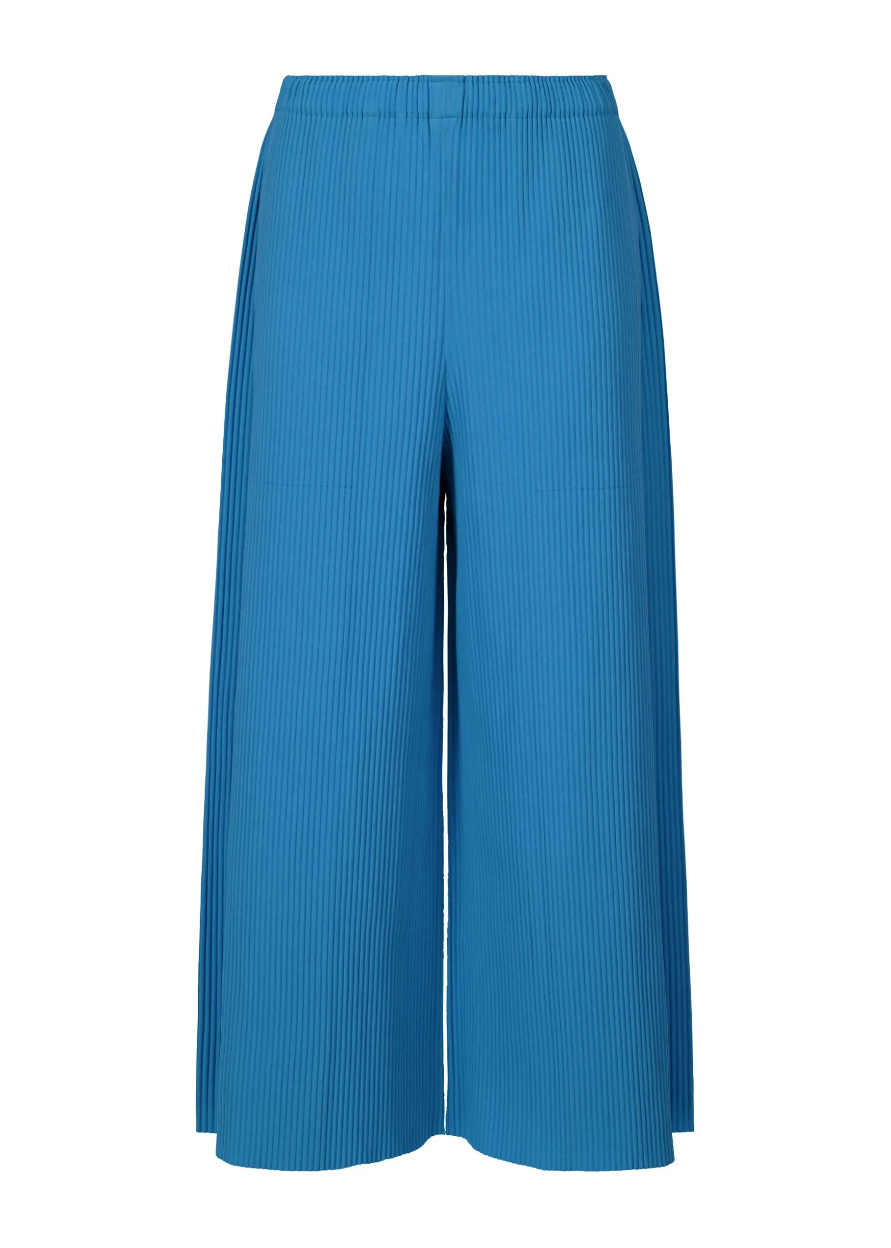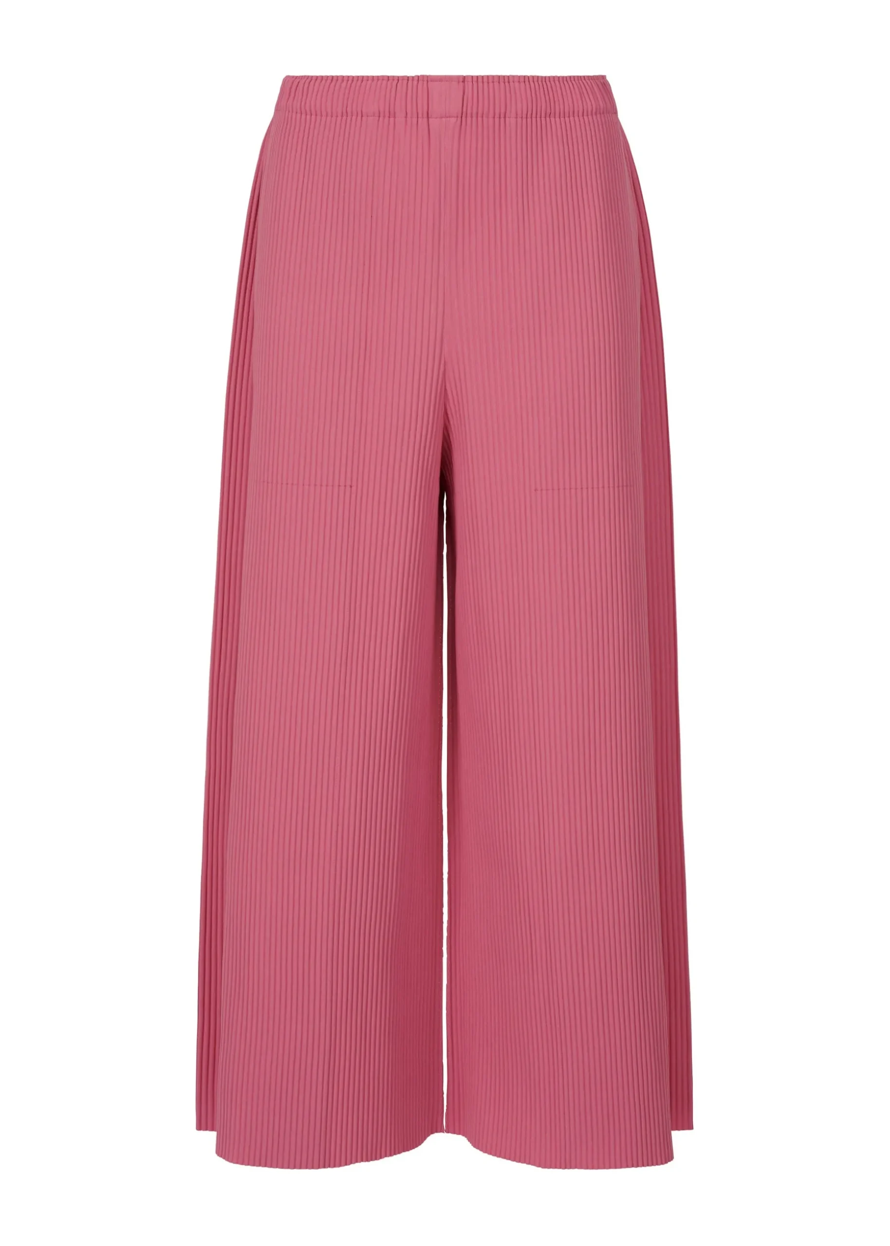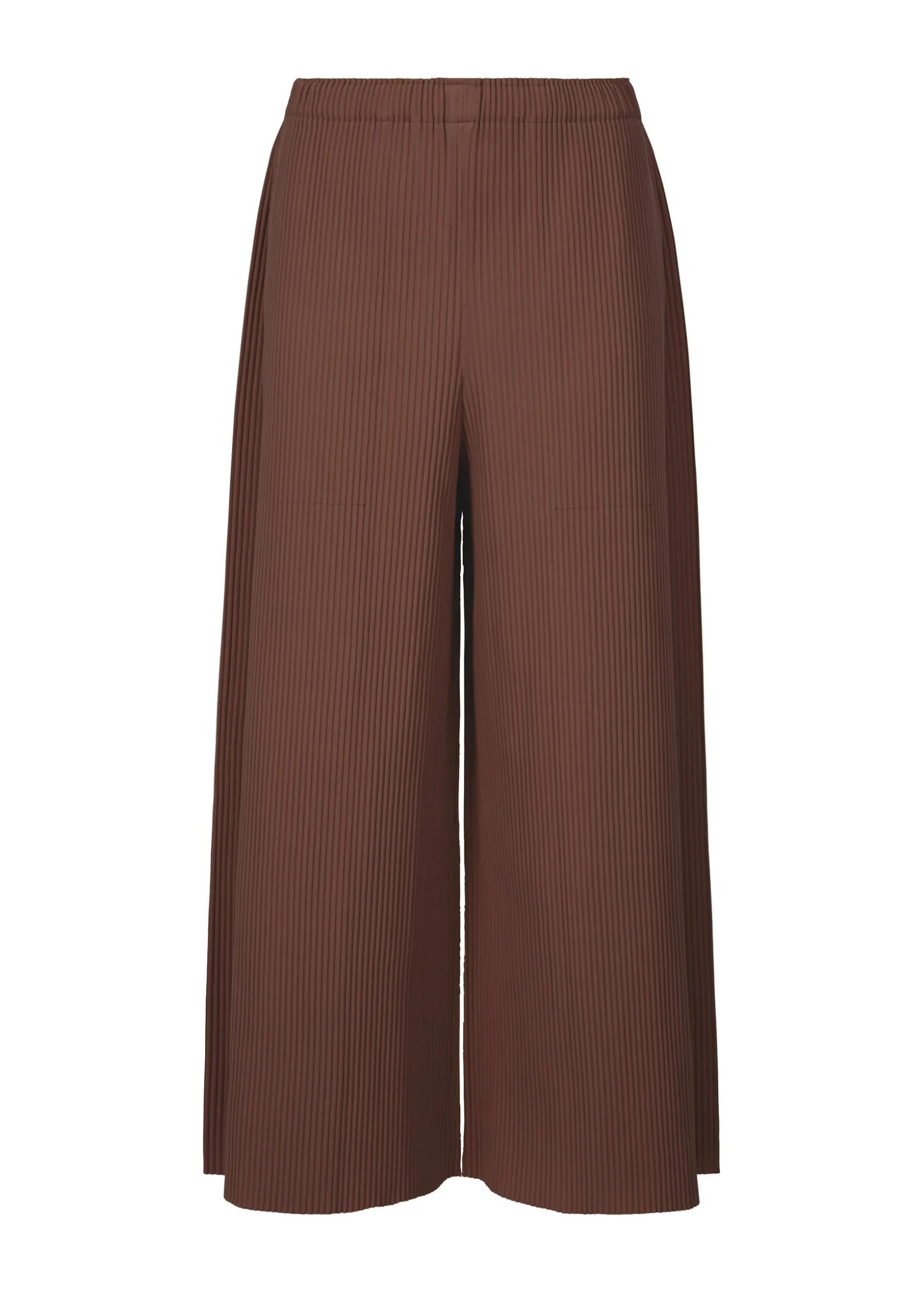 These fine knit, pleated, wide pants are characterized by their lightweight, soft feel and feature pleats applied to knit material made with stretchy, thin, soft yarn. There are pockets on both sides.
