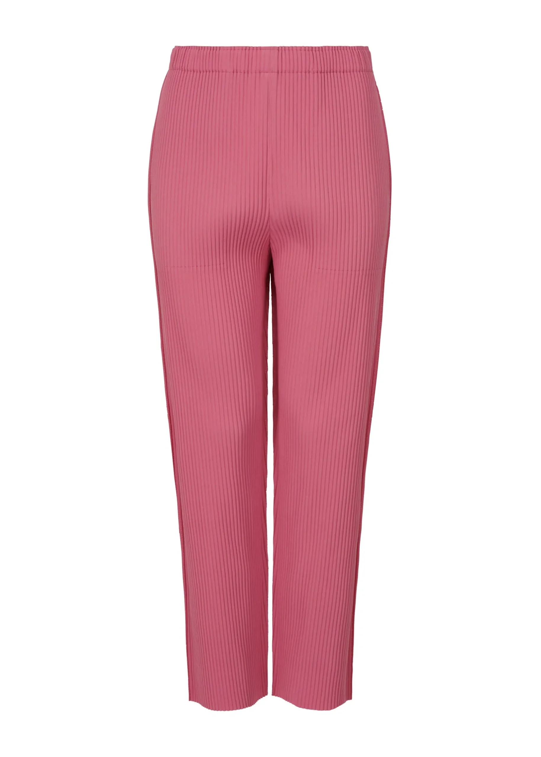 These fine knit, pleated, straight pants are characterized by their lightweight, soft feel and feature pleats applied to knit material made with stretchy, thin, soft yarn. There are pockets on both sides.