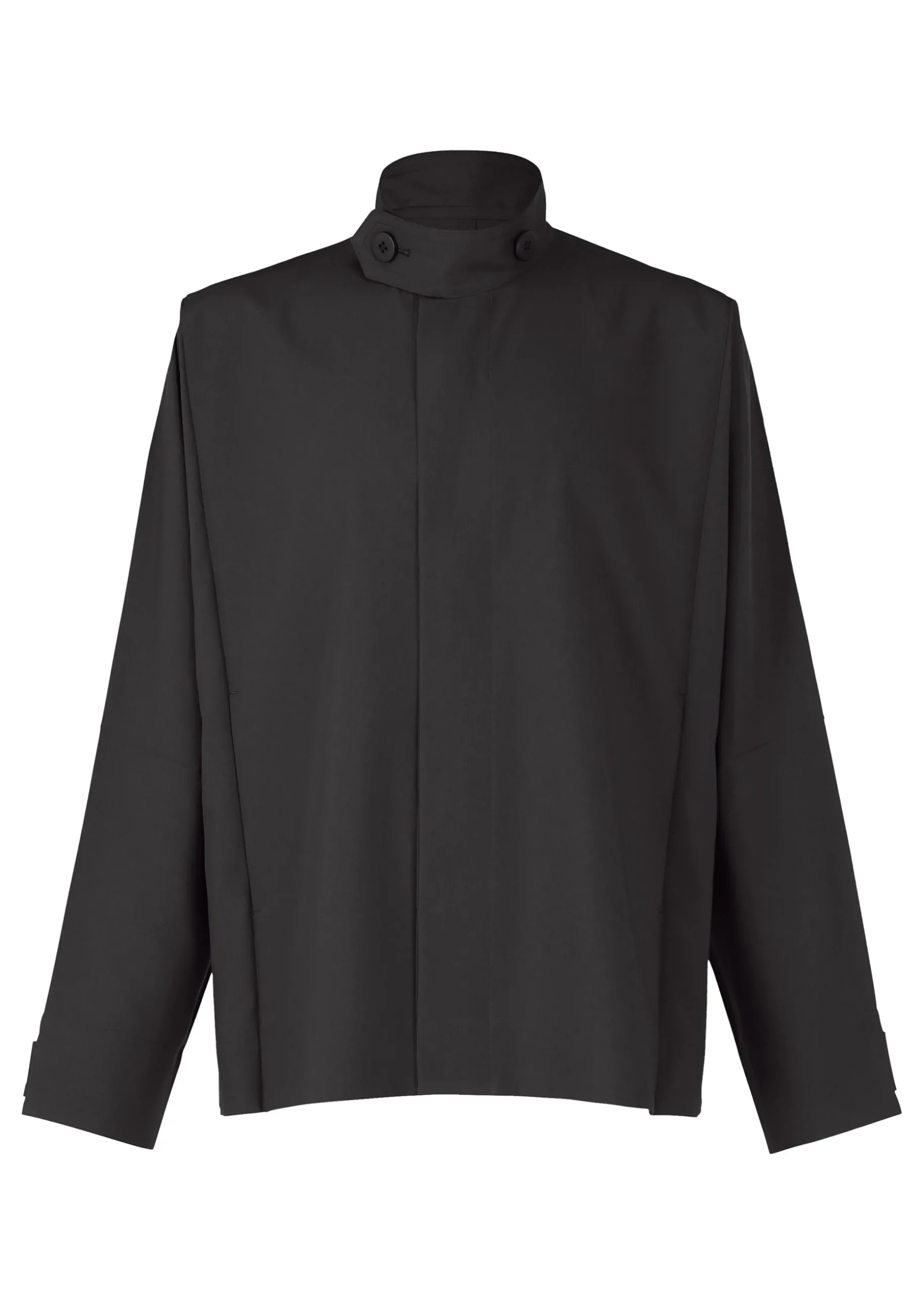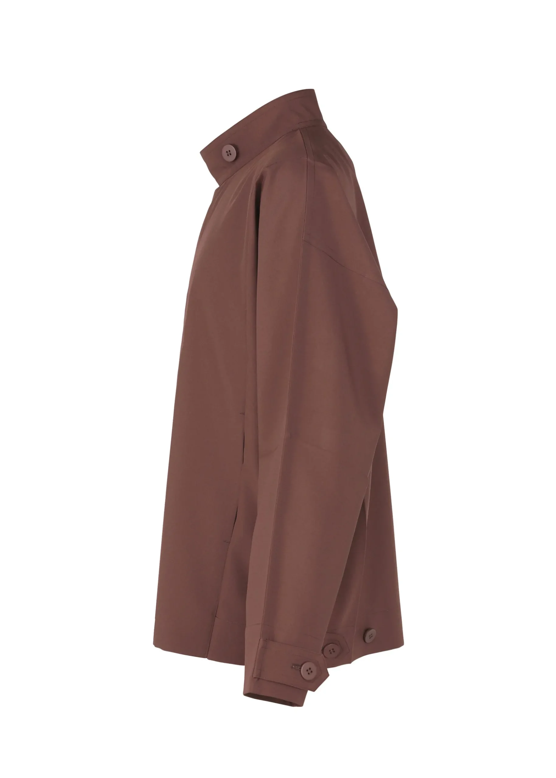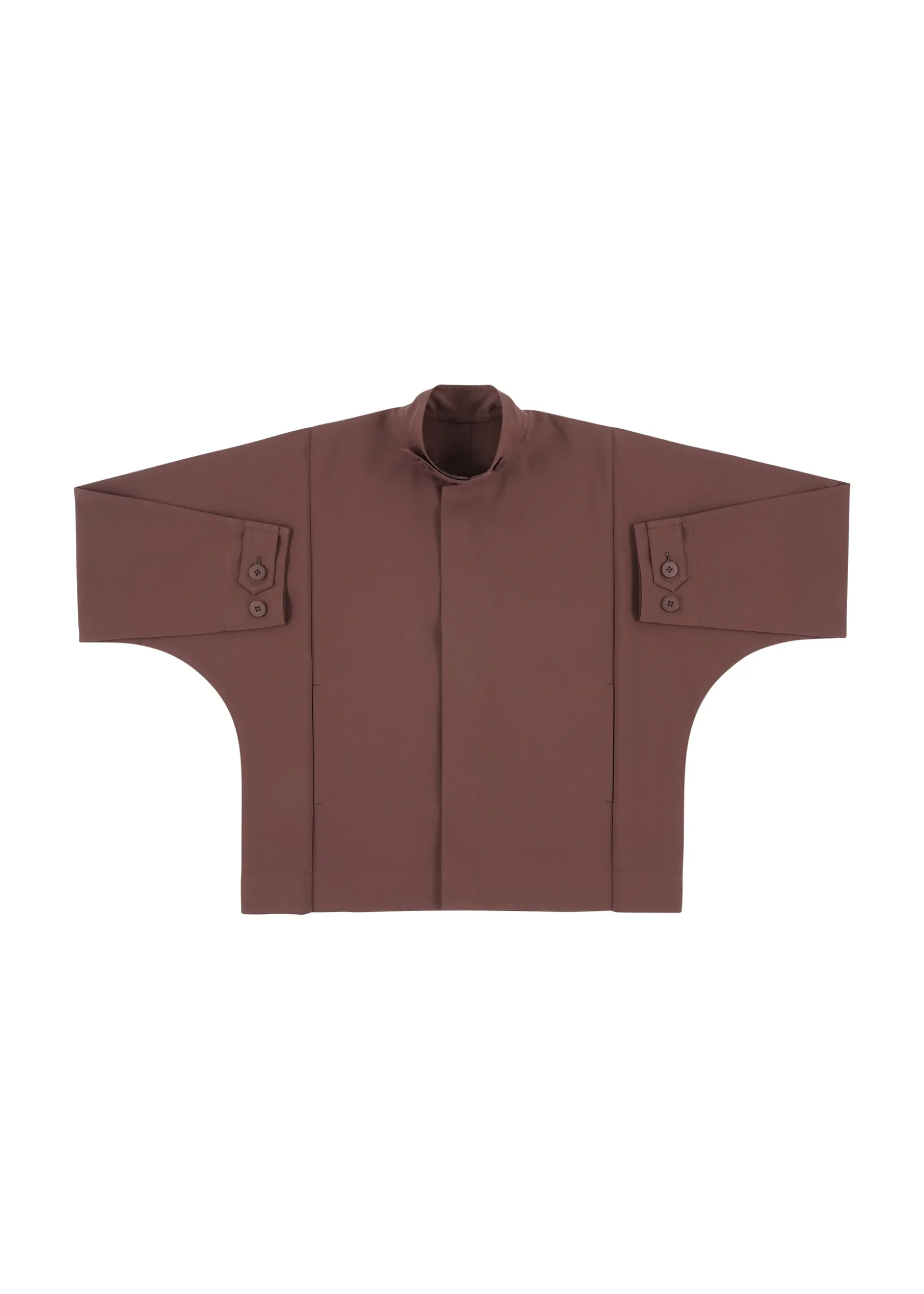 This jacket has a straight, tailored fit with a high buttoned collar, dolman sleeves, and two side pockets. It has buttons at the hems to create a cinched shape if desired. The coat can be folded to fit inside the pocket at the back of the hem for compact carrying.