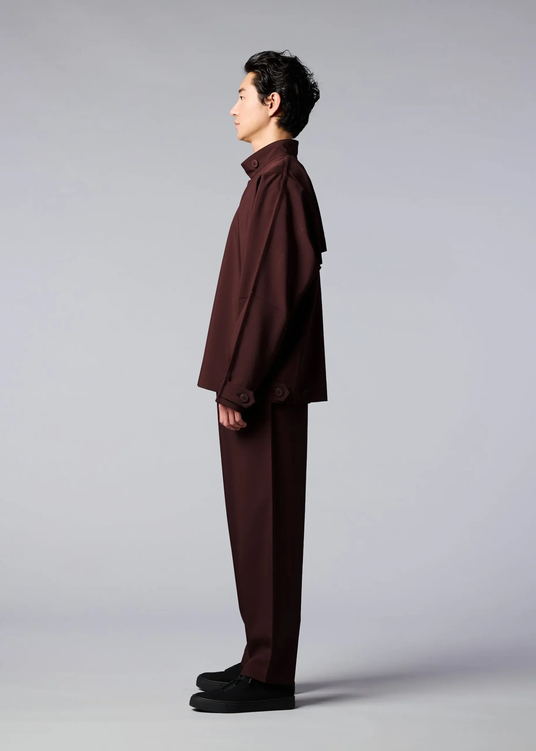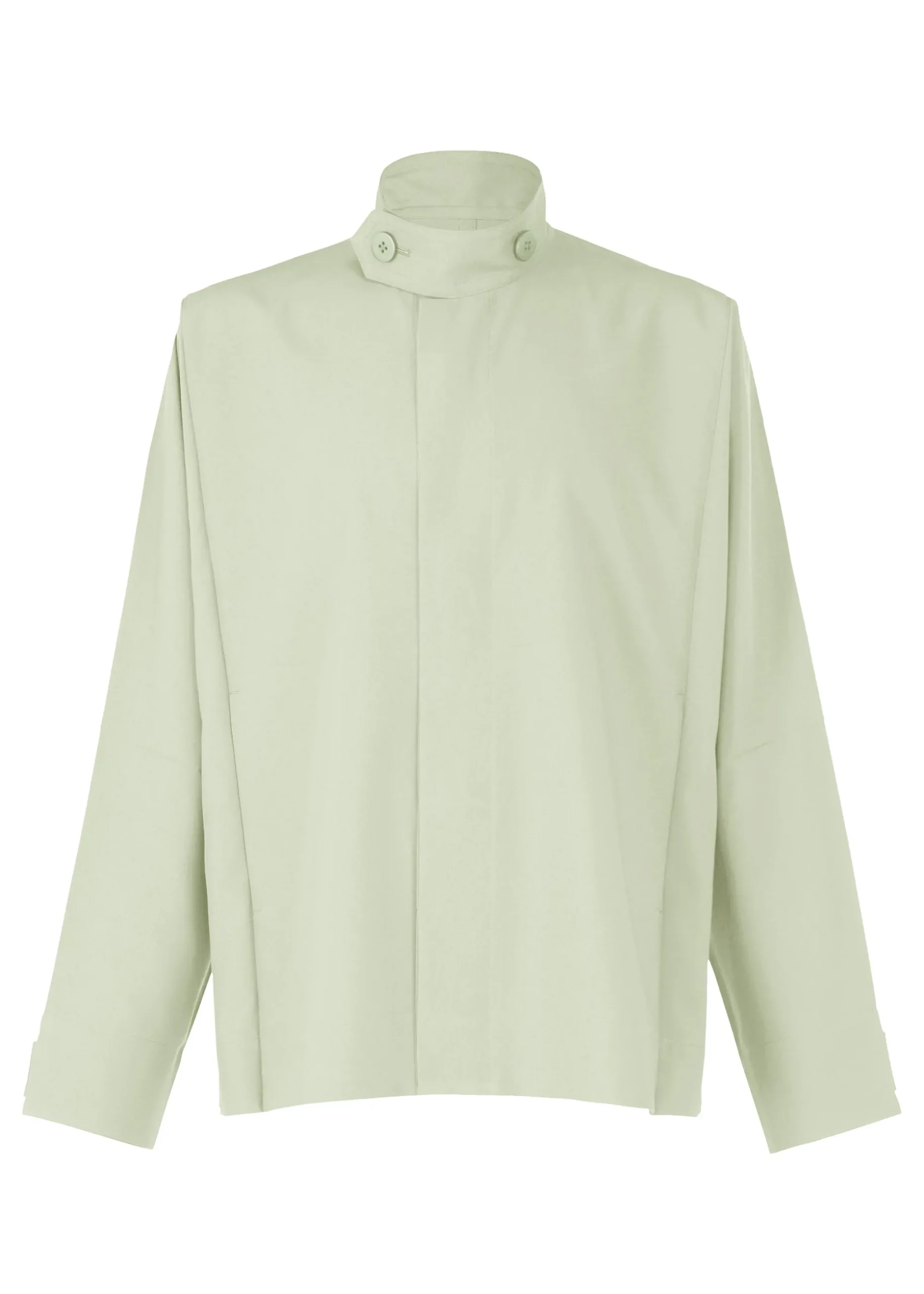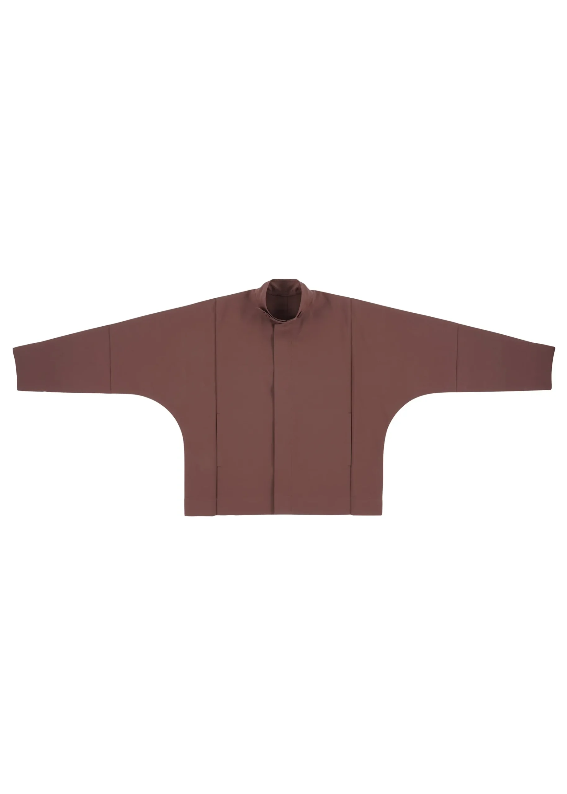 This jacket has a straight, tailored fit with a high buttoned collar, dolman sleeves, and two side pockets. It has buttons at the hems to create a cinched shape if desired. The coat can be folded to fit inside the pocket at the back of the hem for compact carrying.