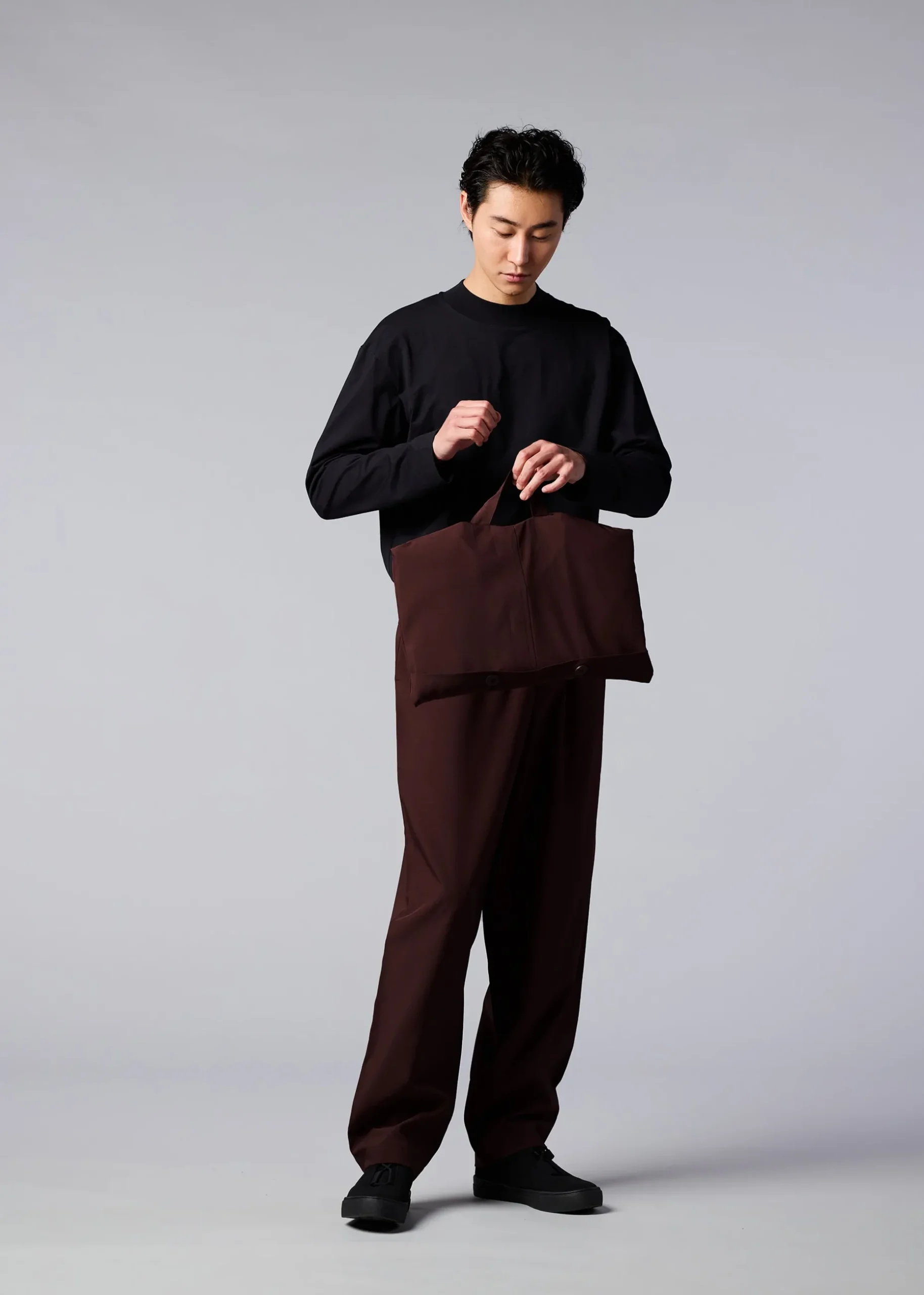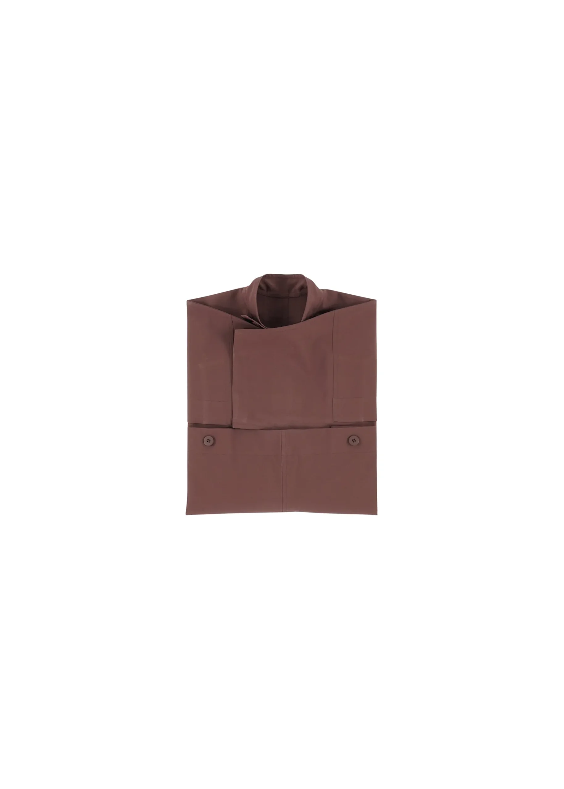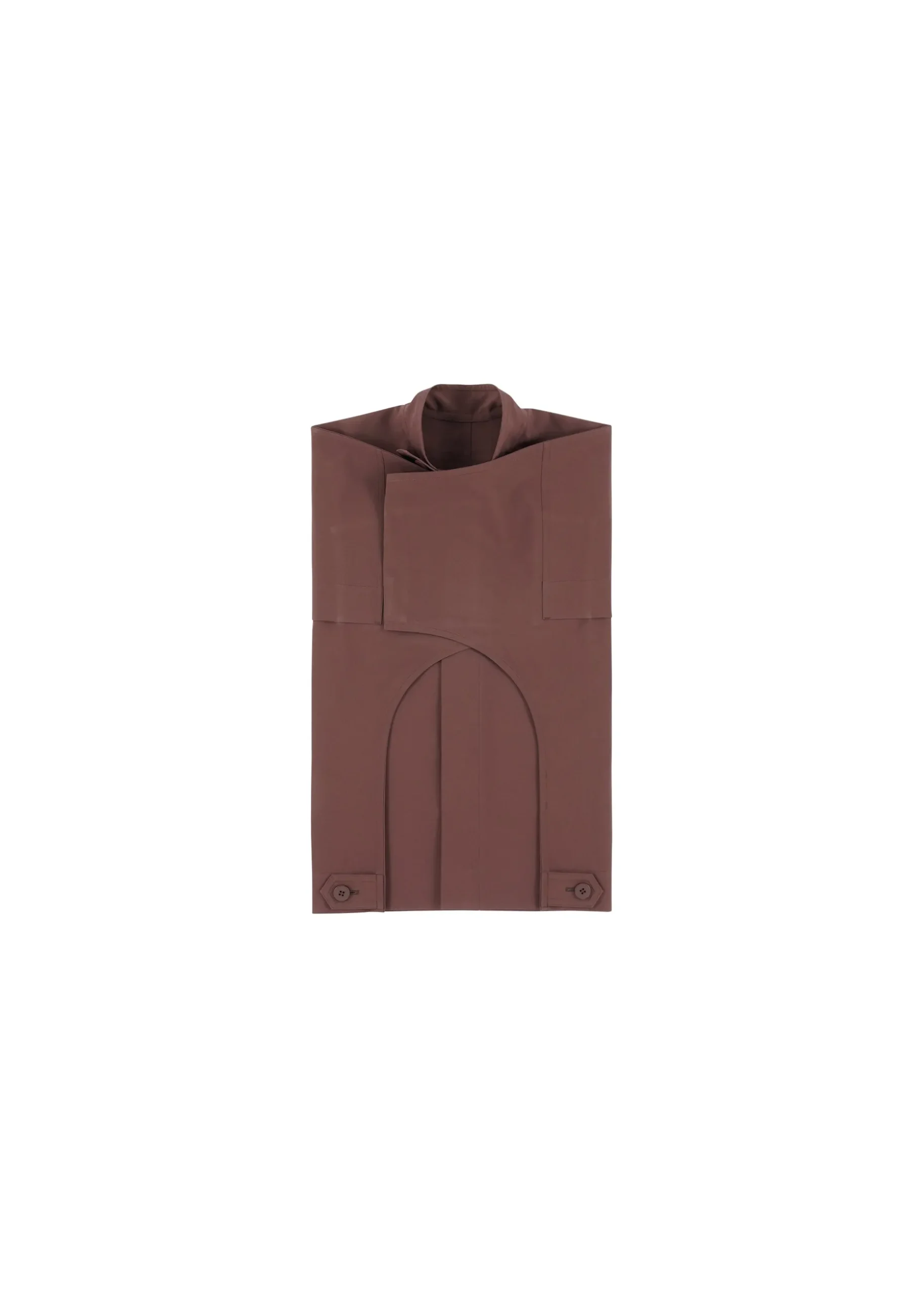 FLAT is crafted from plant-derived polyester yarn, ensuring wrinkle resistance. This innovative design explores the transformation of three-dimensional shapes into flat surfaces through pressed lines, which can be conveniently folded into a pocket within the hem for easy storage. When worn, FLAT highlights structural edges while conforming to the body’s natural contours.