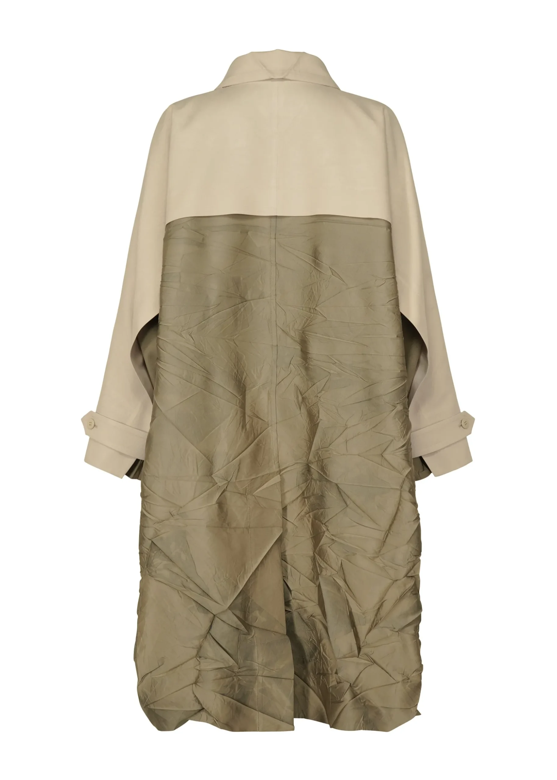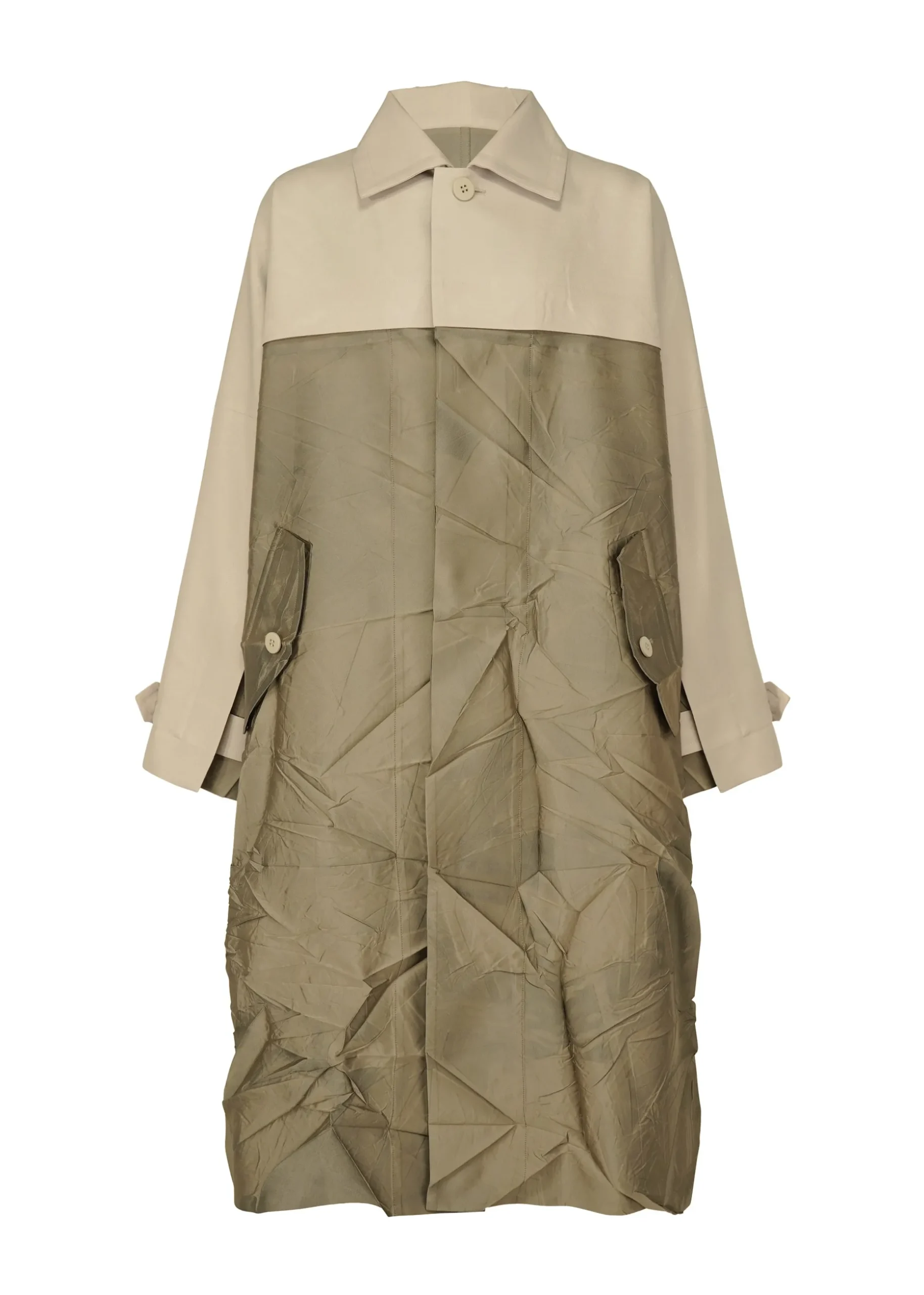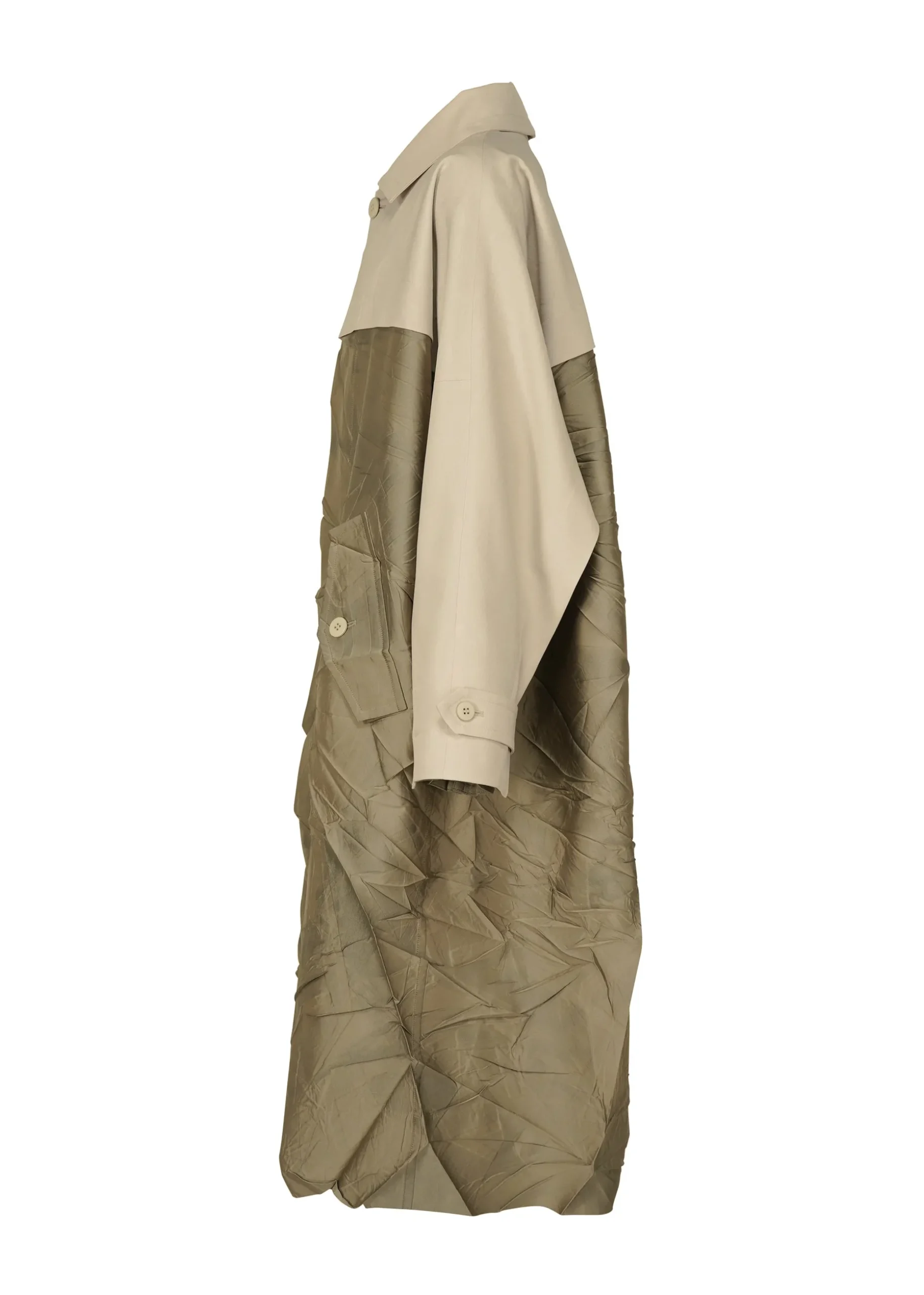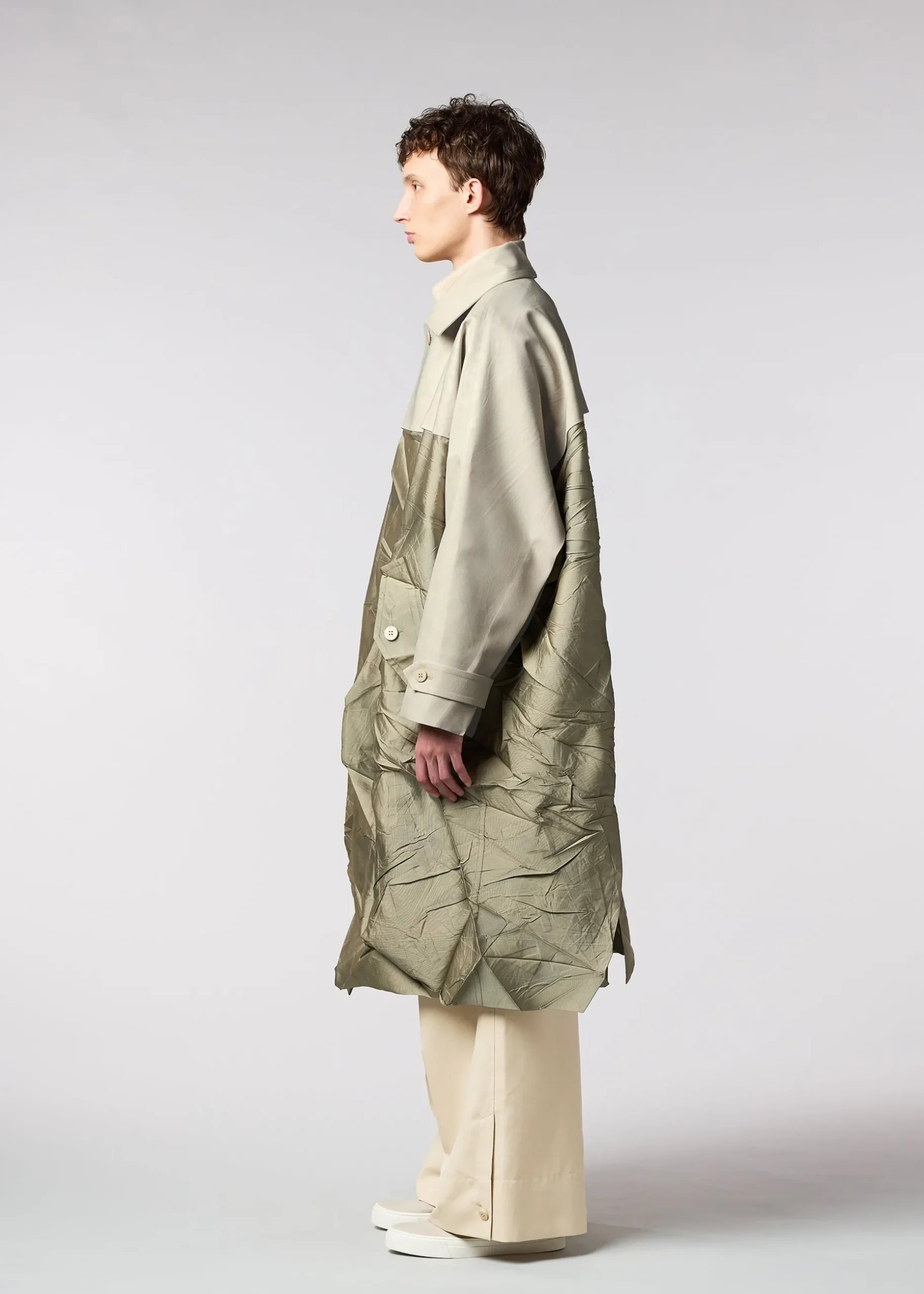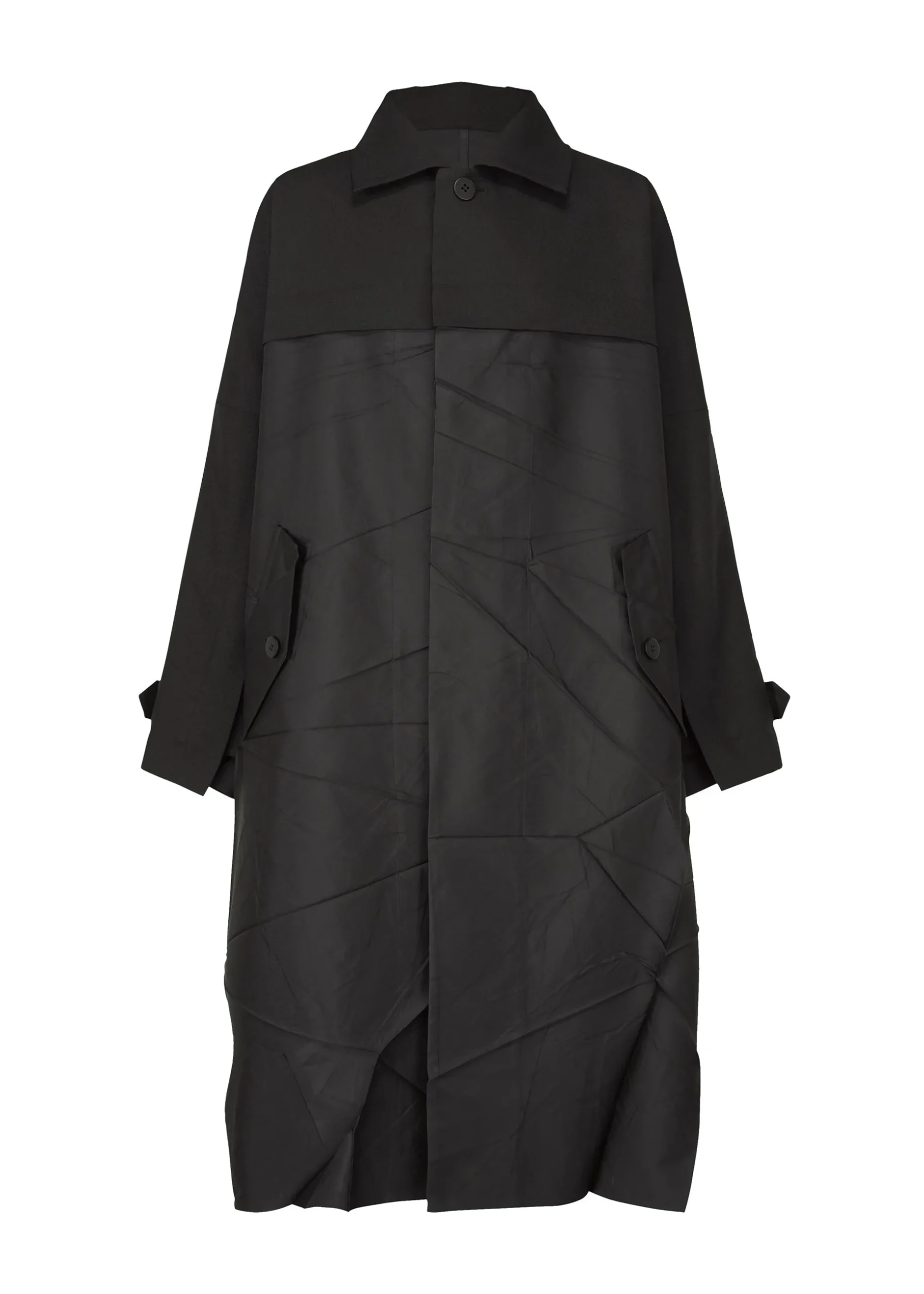 A coat that features a contrast between matte, flat areas and shiny, randomly wrinkled areas. The other parts are folded randomly to fit inside the flat upper body, and the shape is created by pressing.
