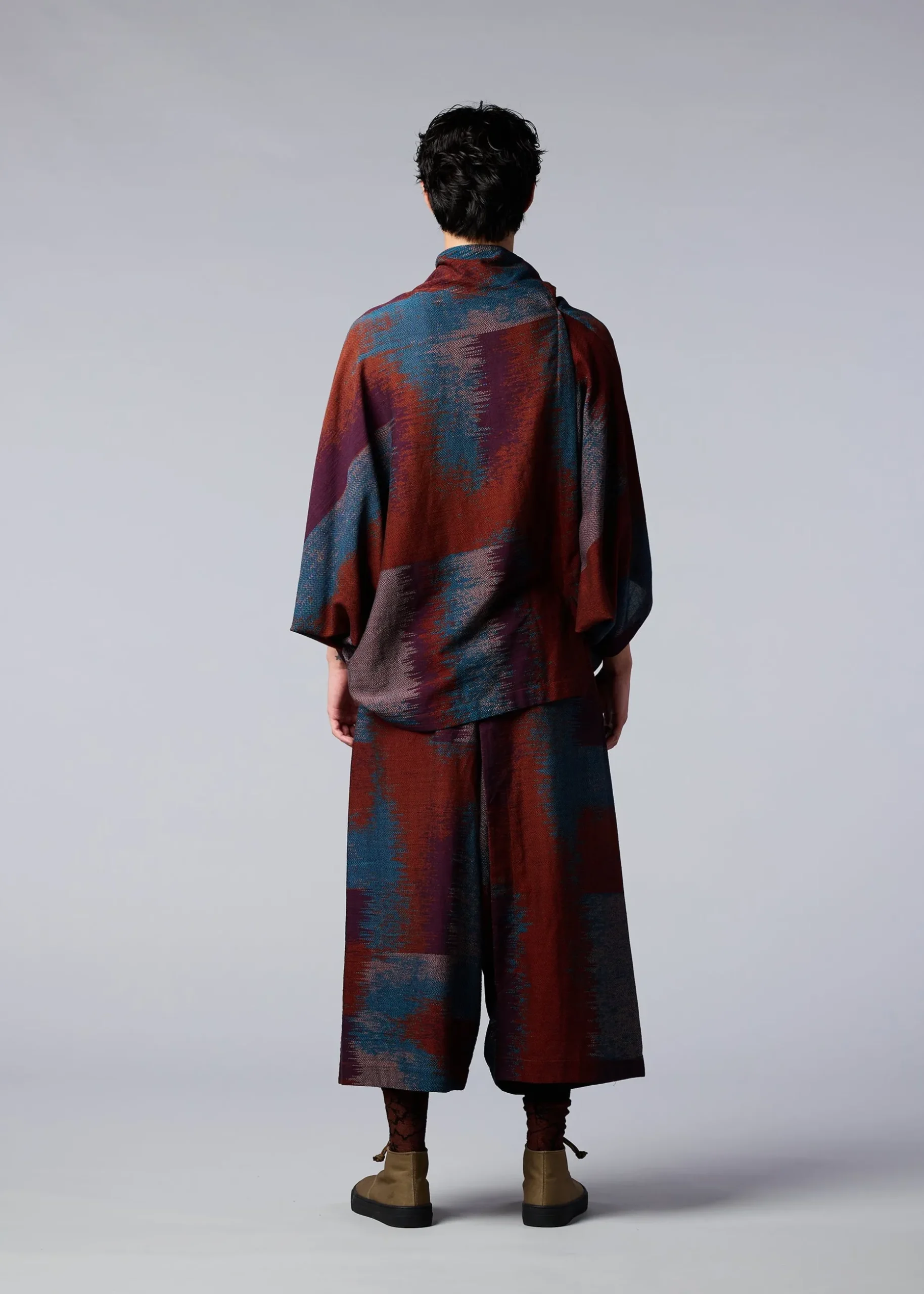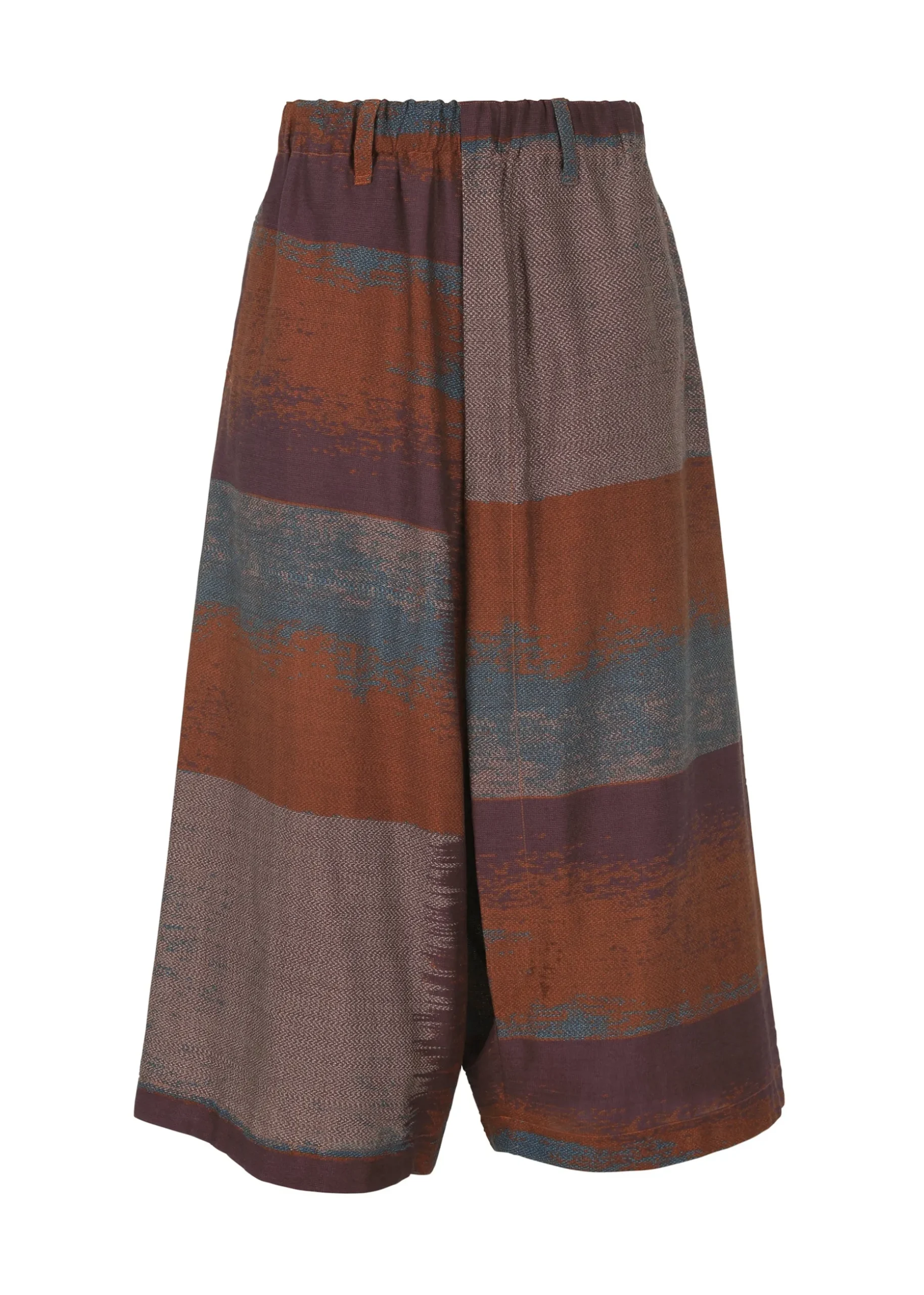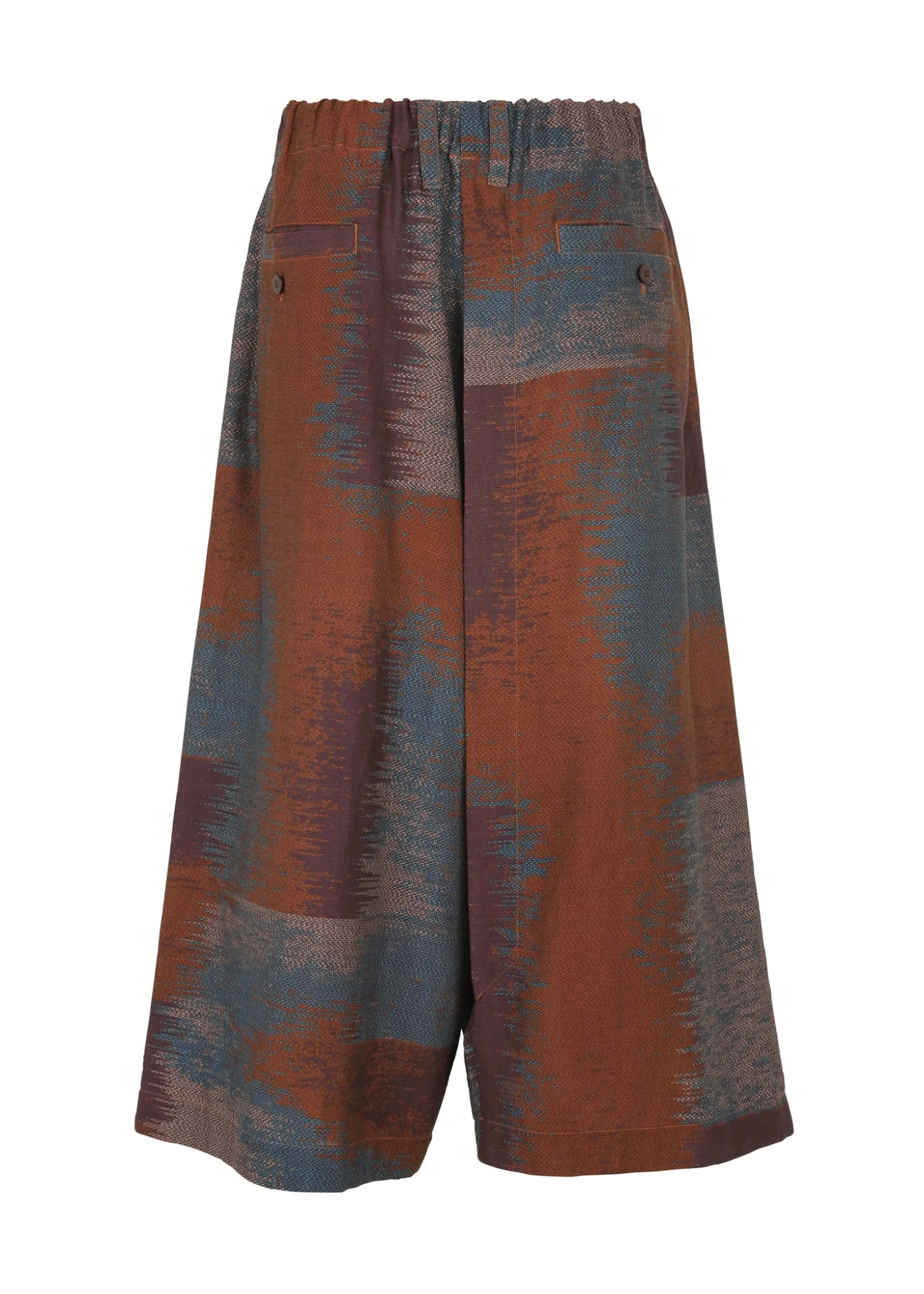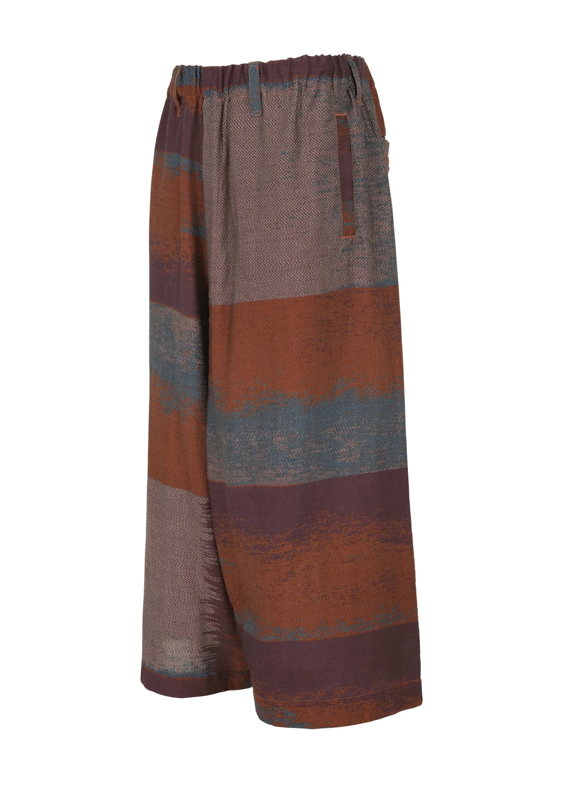 These pants are transformed from a single flat piece of cloth by pulling the cord threaded through the cloth. The design is characterized by the shirring created by gathering the cord. The rise can be adjusted by pulling the cord at the waist. The pants are made from 100% plant-derived nylon.