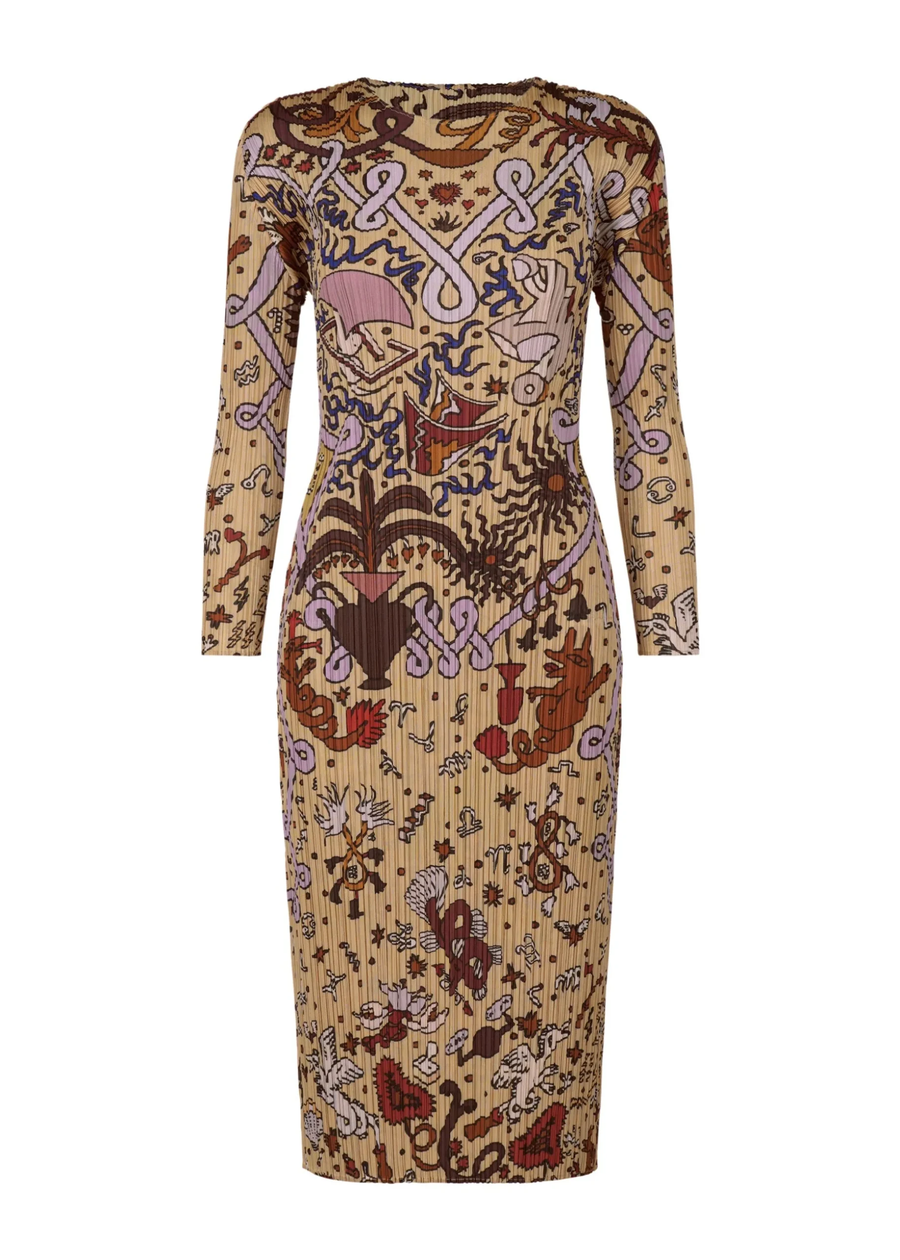 This round-neck, long-sleeved dress has a print that depicts exciting imaginary scenery in outer space.