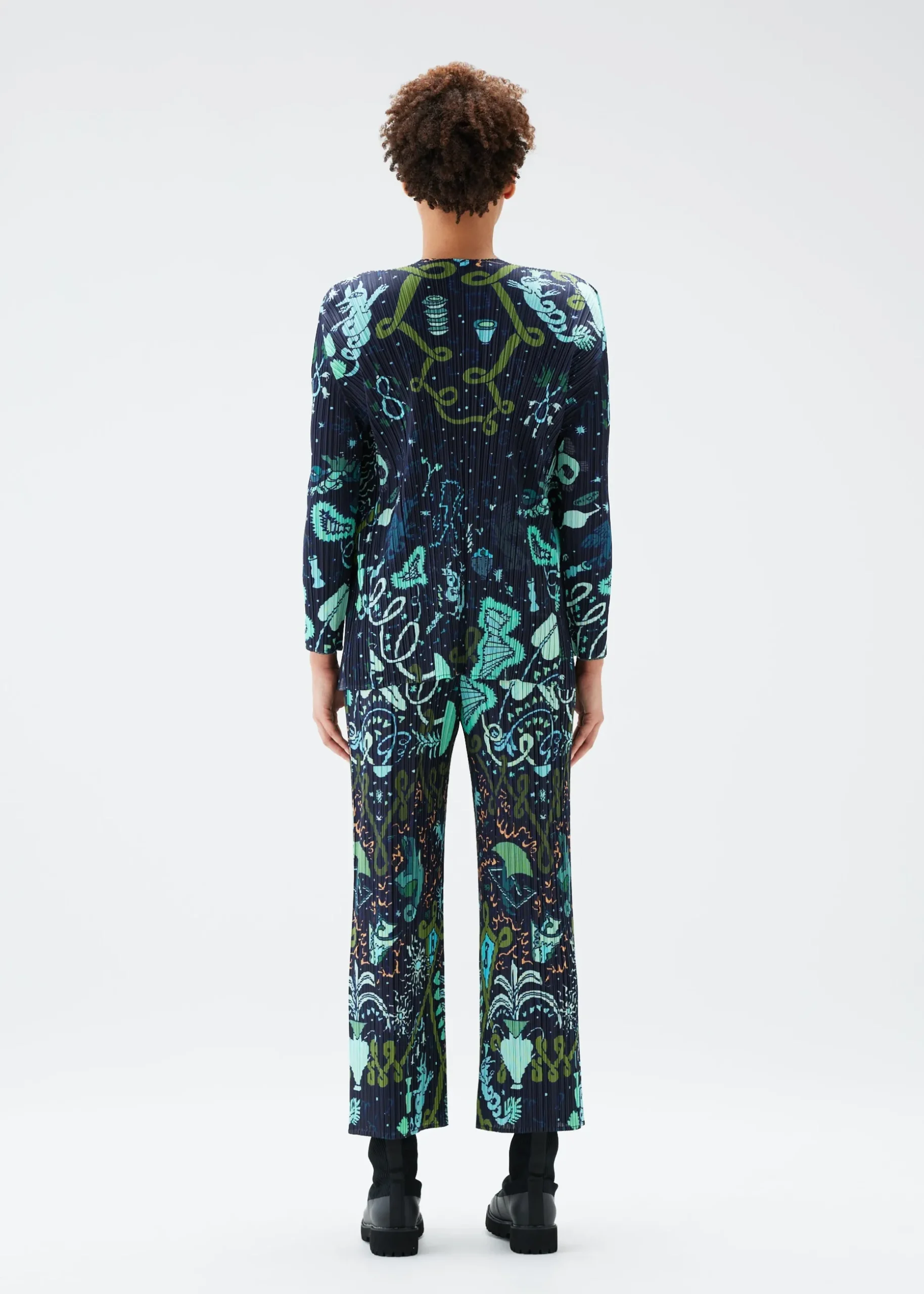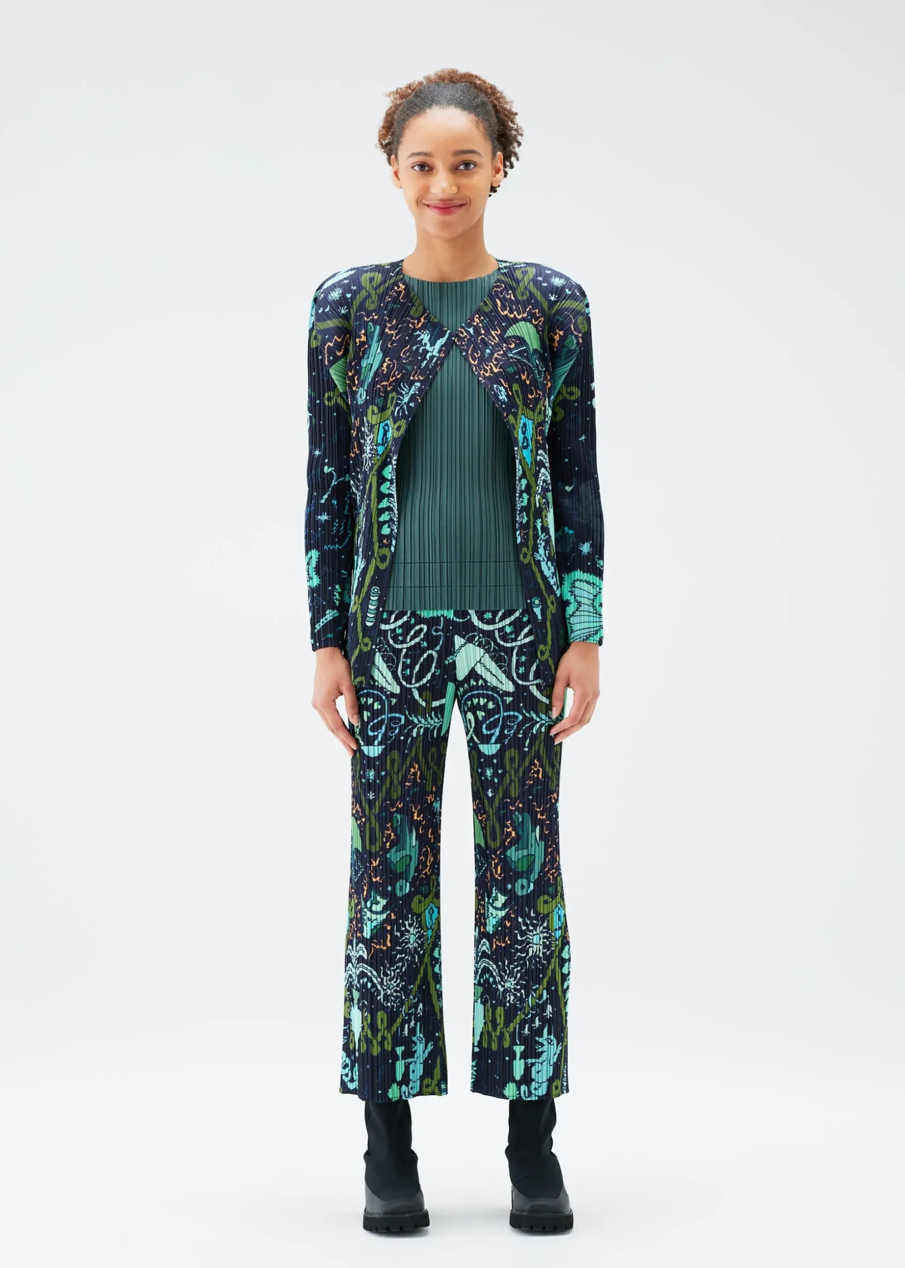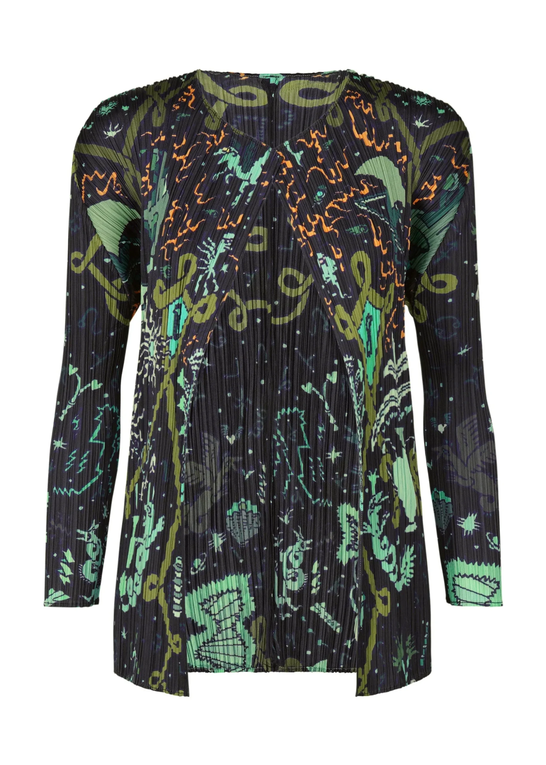 This cardigan has a print that depicts exciting imaginary scenery in outer space.