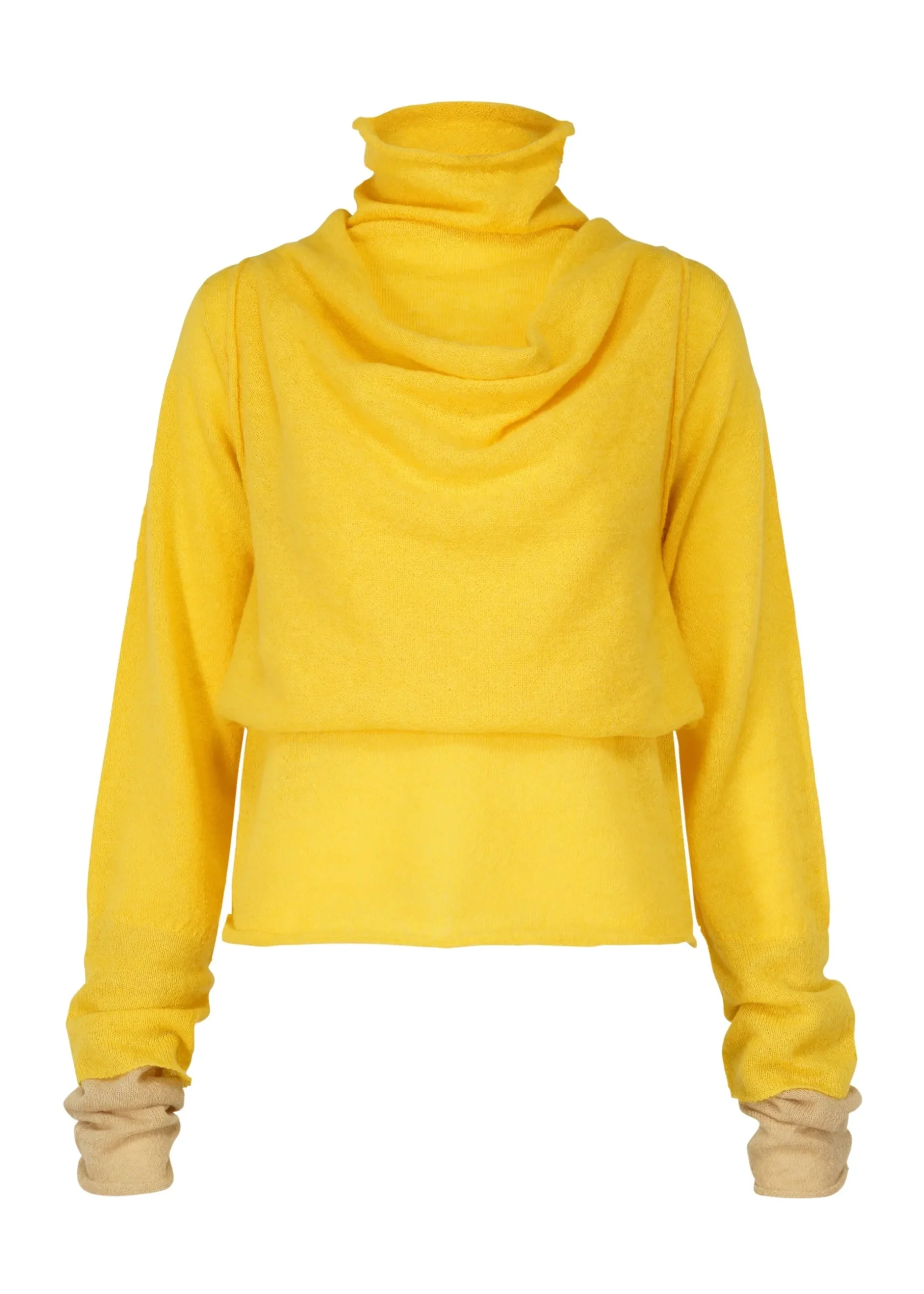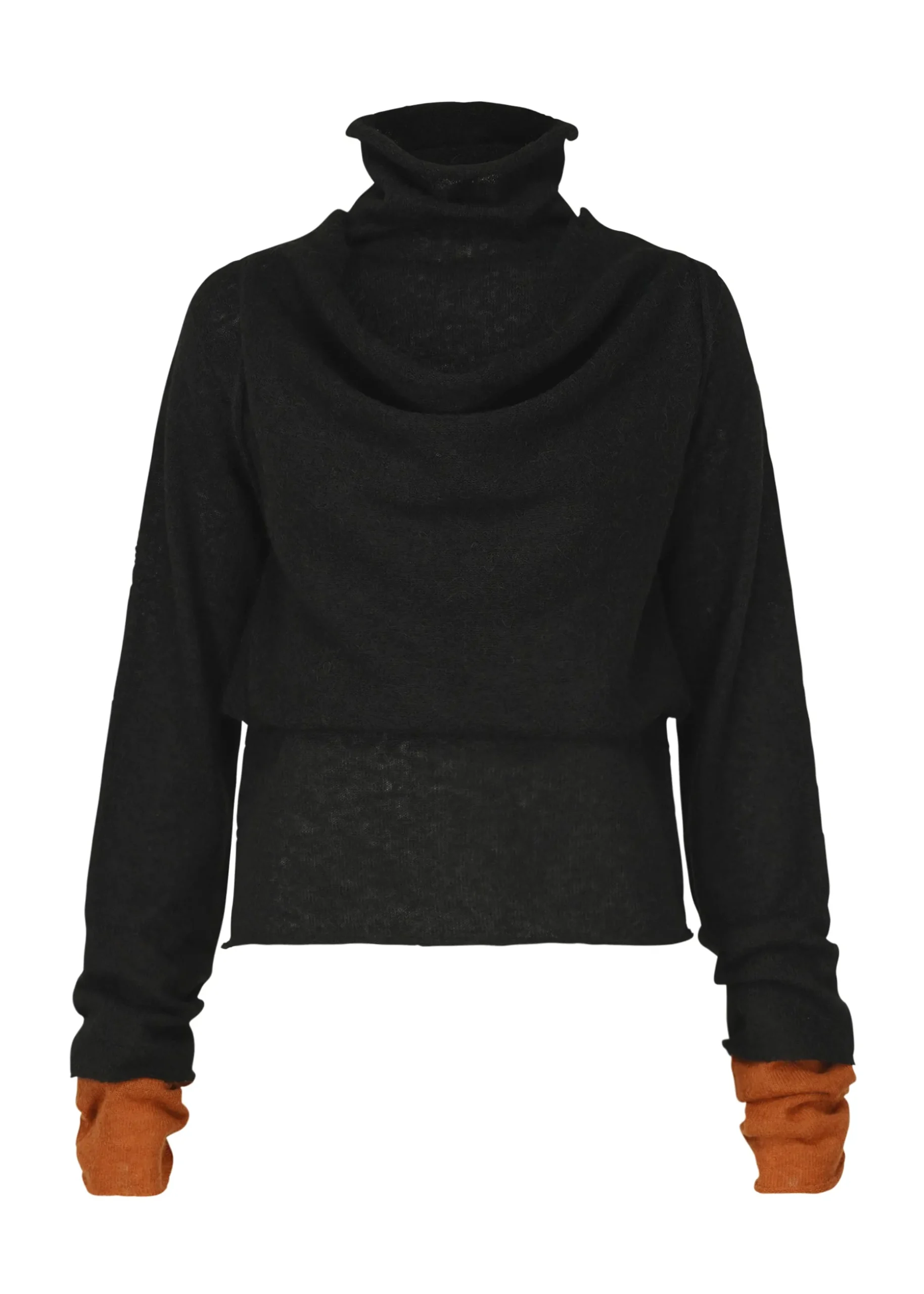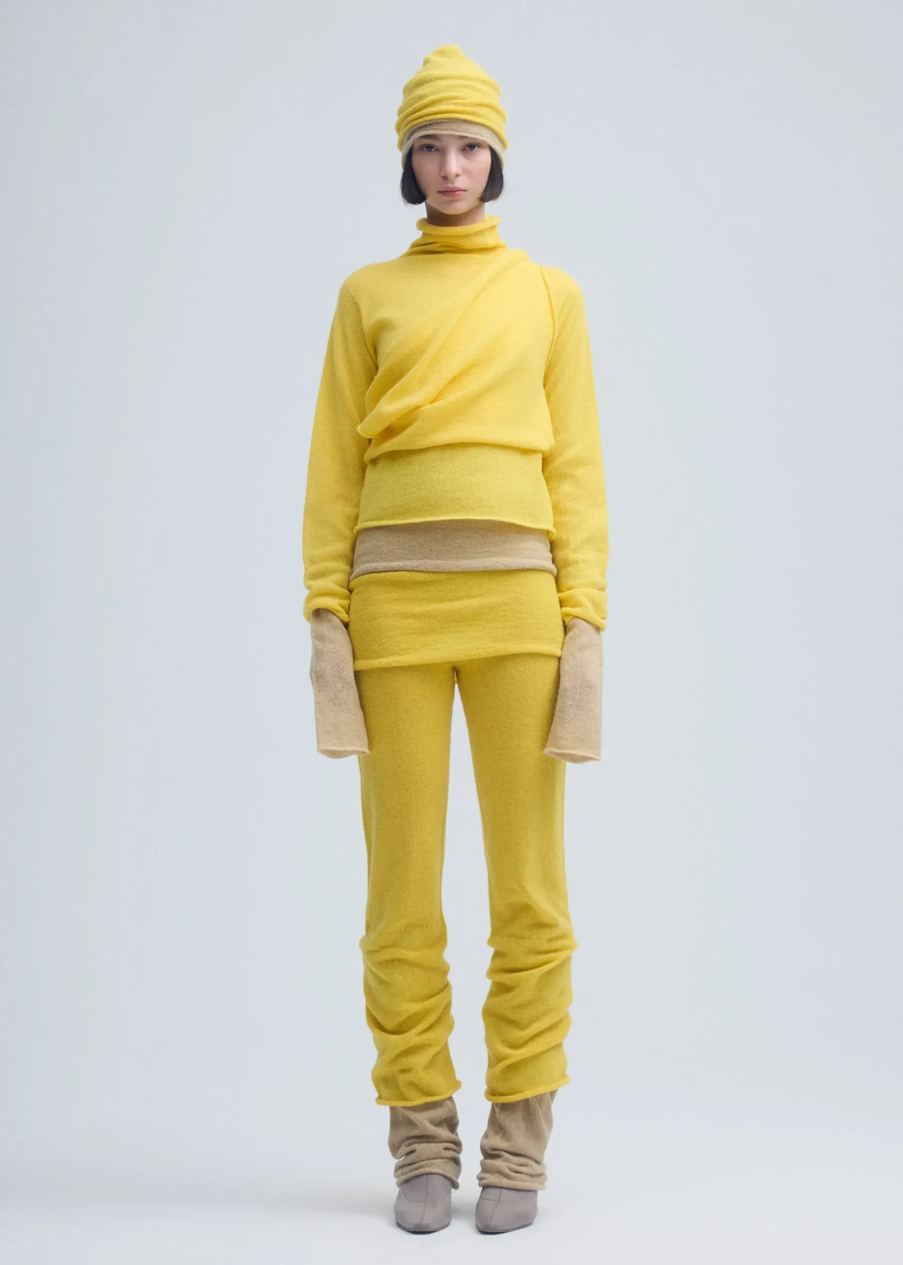 This non-sewn, long-sleeved knit top is based on the concept of layering colors and features an eye-catching dual color scheme expressed through a double-layered knit design. The design has layers of different colors and lengths stacked vertically, allowing you to enjoy a layered style with a single piece of knit clothing. The warm, soft feel of the fabric and versatile styling options make this an appealing item.