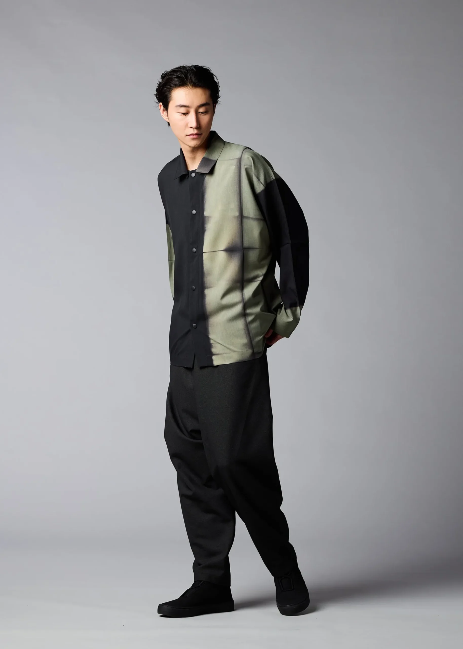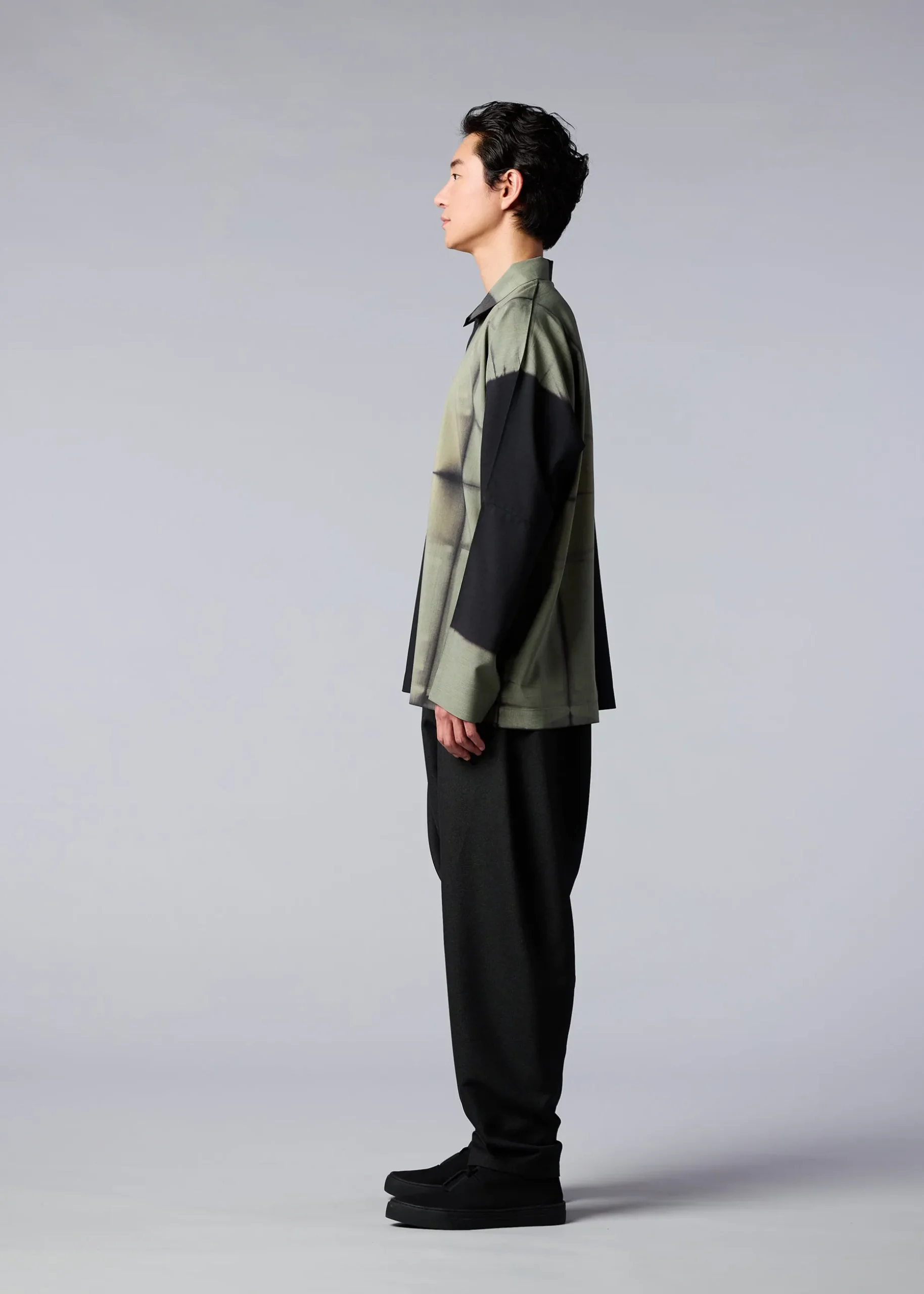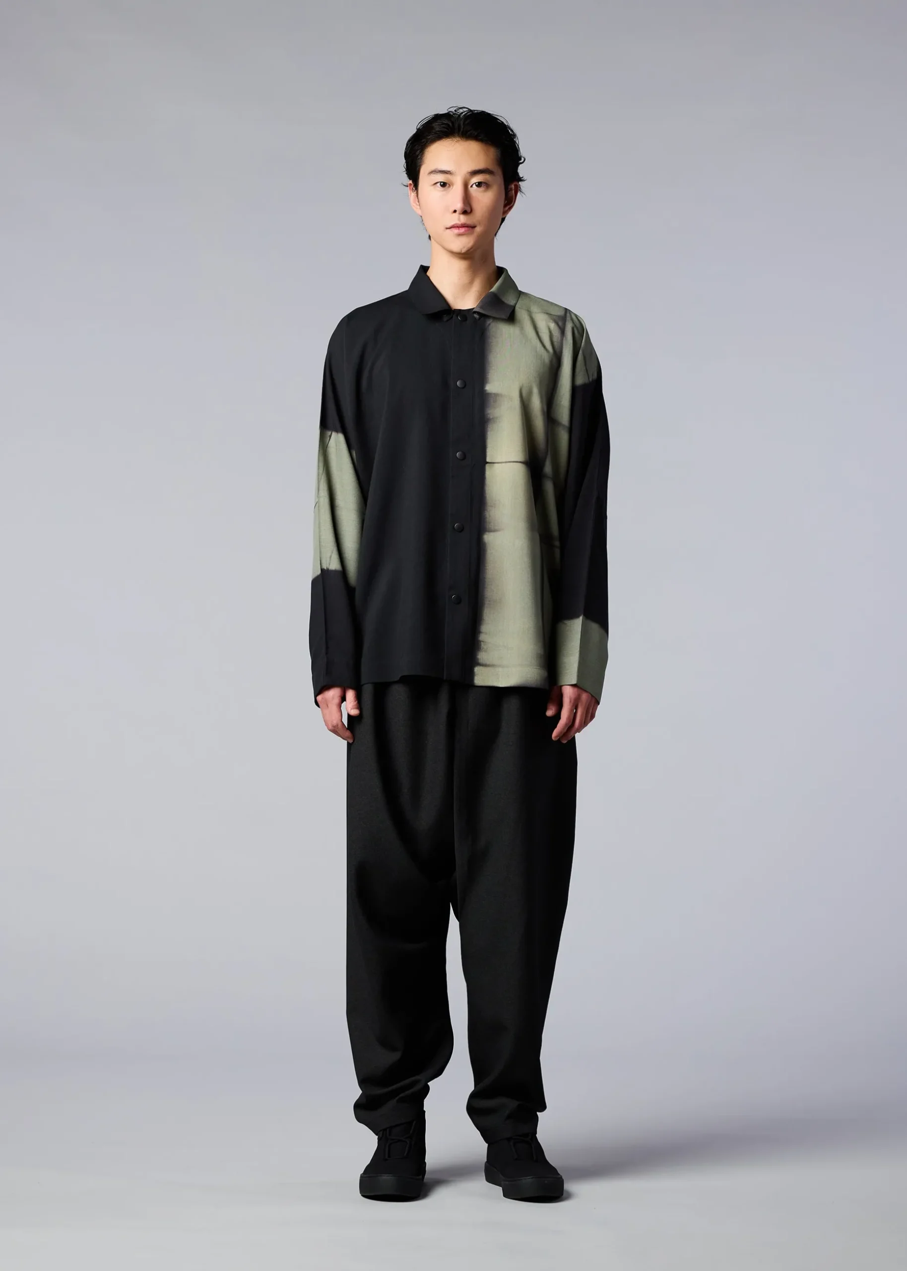 This long-sleeved, double-weave shirt has a soft feel and smooth texture. It is finished with an intricate yet powerful beautiful pattern using the Roketsu-zome dyeing technique, in which the item is dyed while separating the wax by hand. It is made with simple cuts for a linear silhouette that accentuates the pattern.
