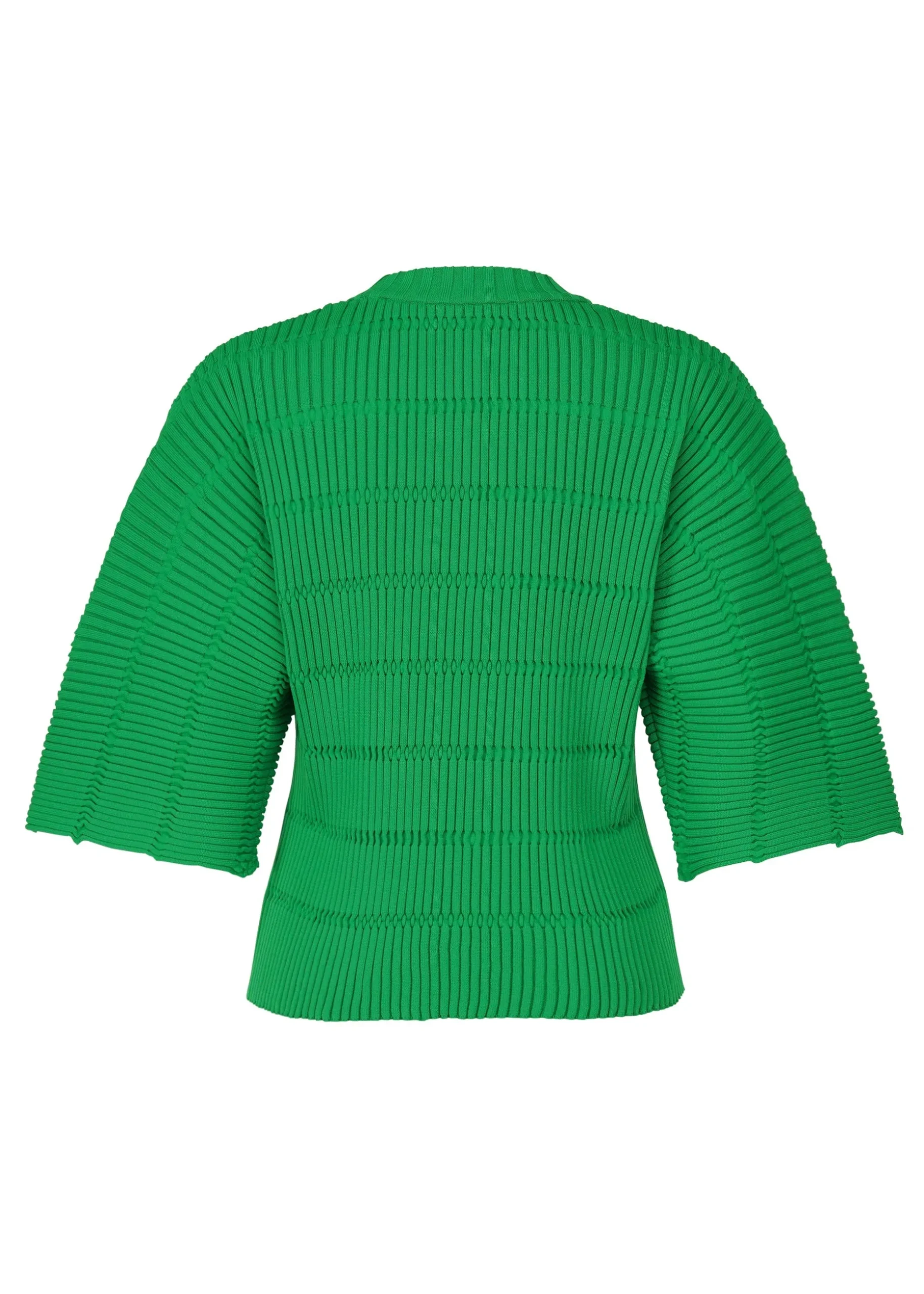 This mock-neck knit expresses regular pleats with its knitting structure. It is made with recycled polyester in pursuit of fluffy softness. It is characterized by the folded look of the front that flutters when worn.