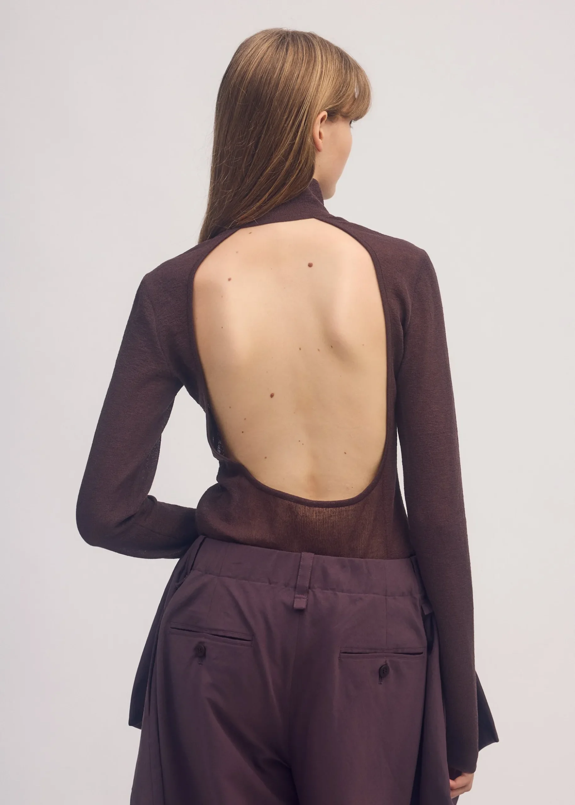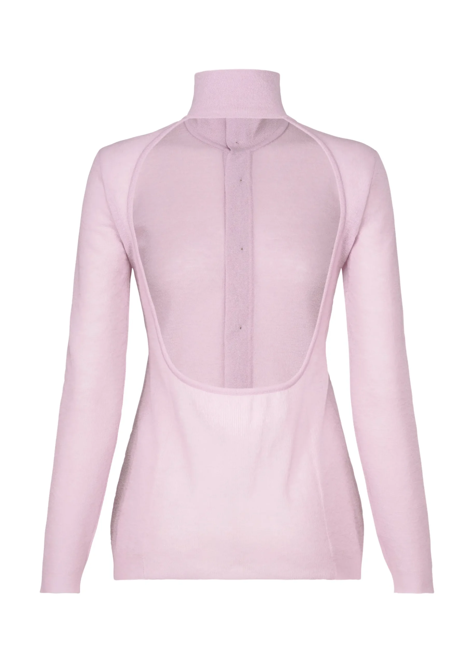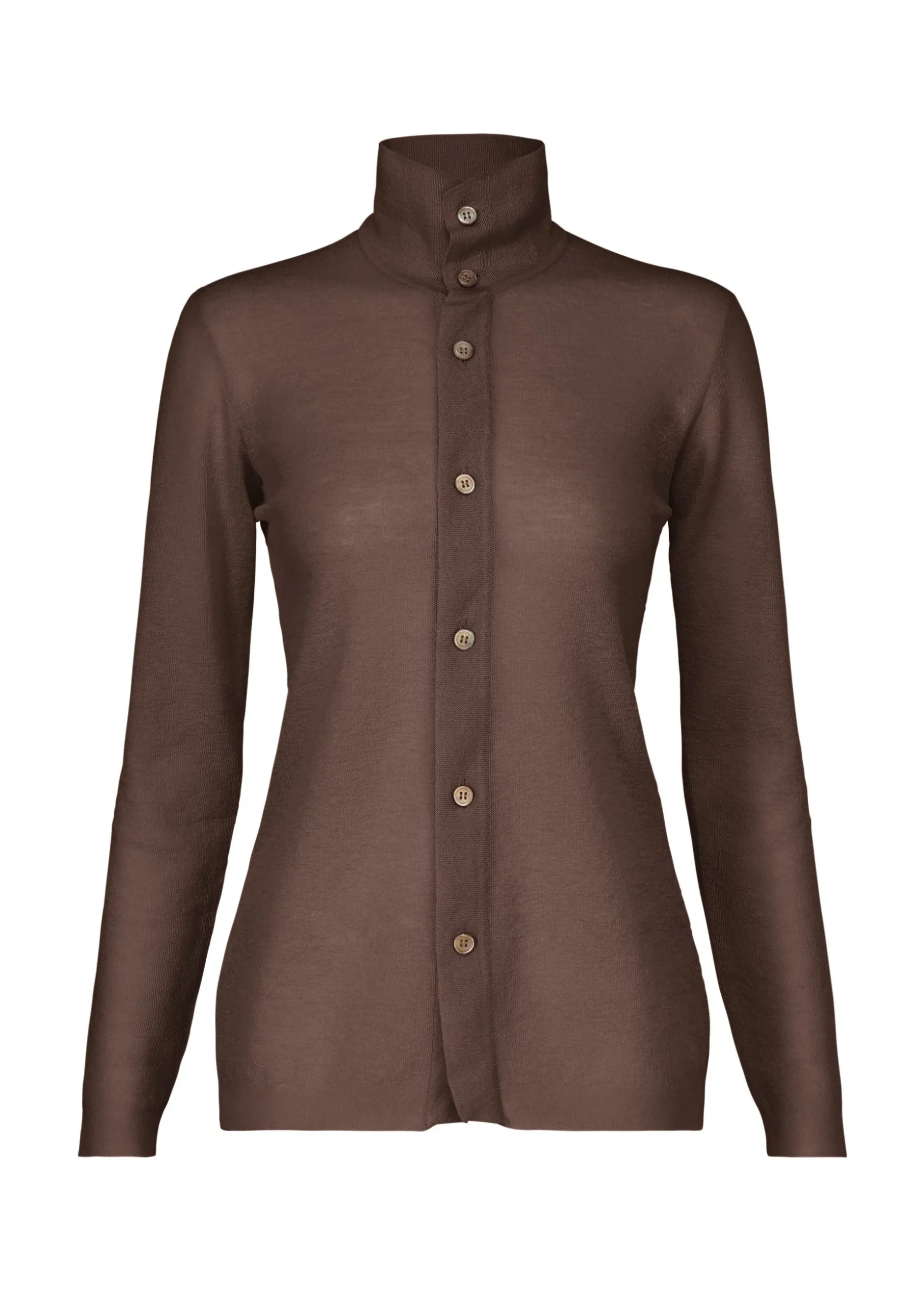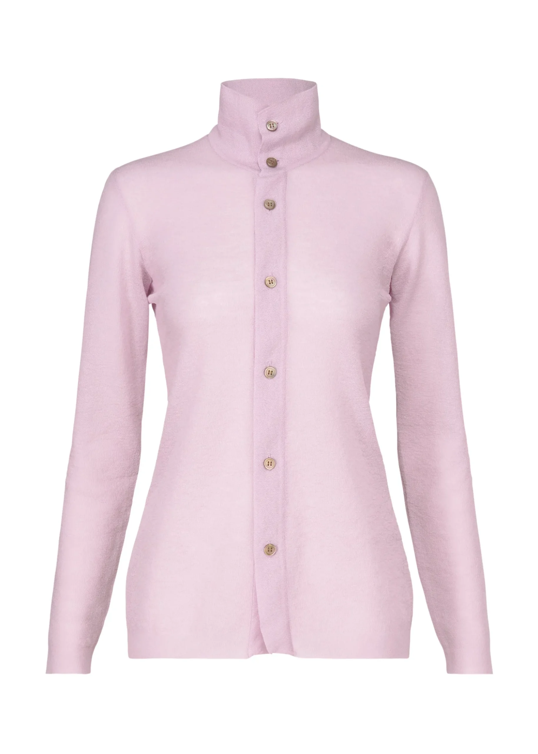 This knit shirt with a standing collar is knit in a shirt style using ramie and polyester blend thread. It has a bold design with a large opening in the back. It is characterized by its moderate sheerness due to the use of fine thread and ramie’s unique texture that is dry to the touch. The collar is made three-dimensional through knitting, with a taut feel achieved by increasing the number of threads held together and altering the knitting structures.