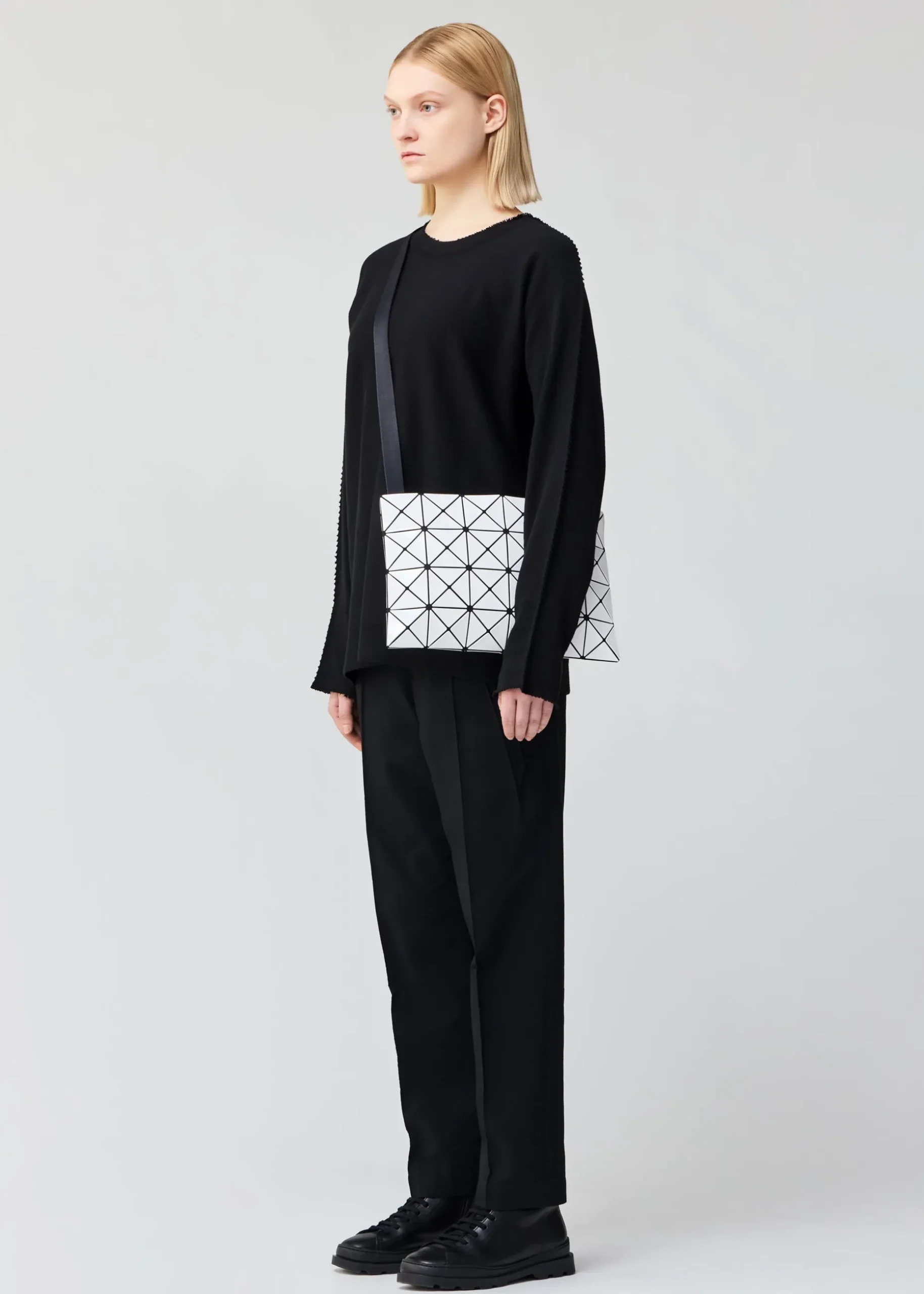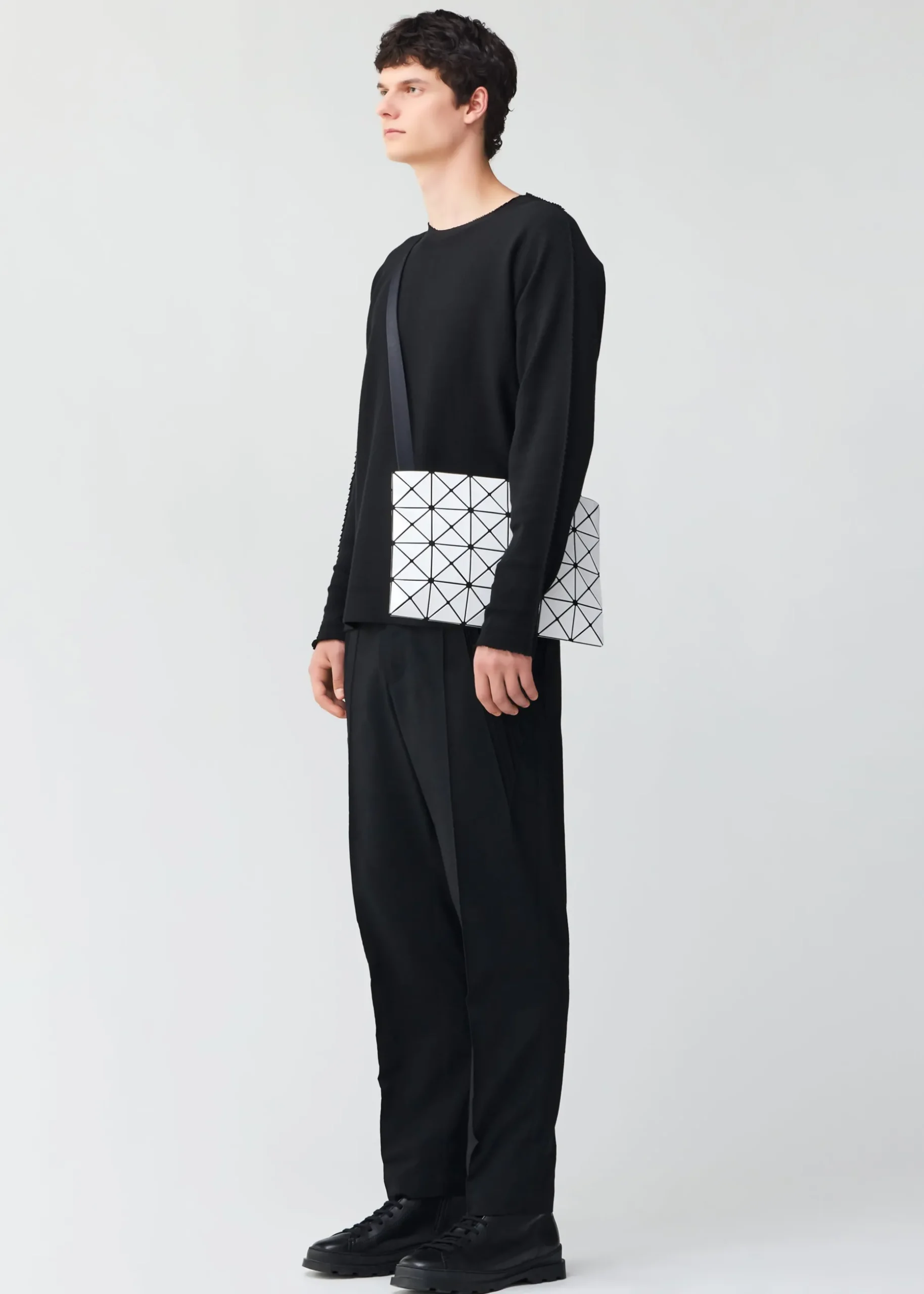 The Lucent series uses right isosceles triangle pieces. The pieces arranged regularly on the mesh fabric are designed to transform into three-dimensional shapes when you put something in them, creating beautiful shadows. This is a basic series that represents the brand. Available in 4 colors that give a calm impression and are easy to incorporate into your coordination.