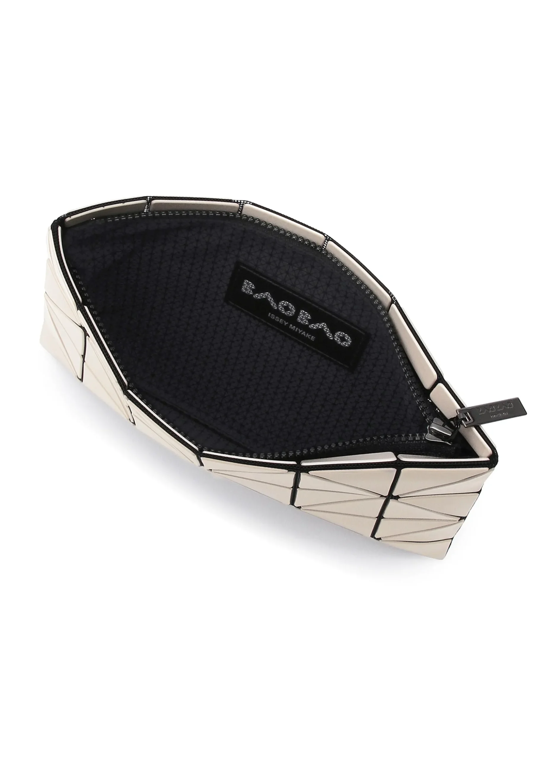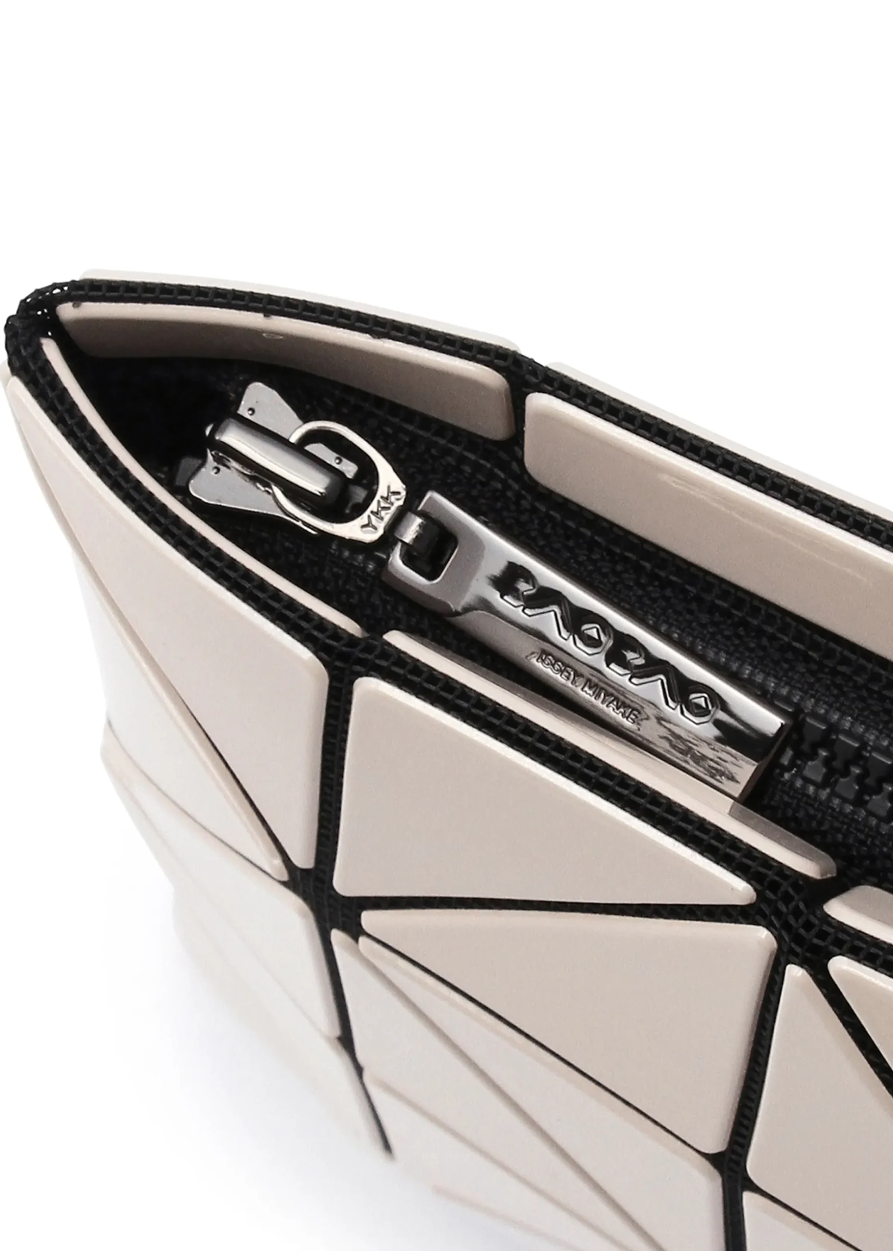 The Lucent series uses right isosceles triangle pieces. The pieces arranged regularly on the mesh fabric are designed to transform into three-dimensional shapes when you put something in them, creating beautiful shadows. This is a basic series that represents the brand. Available in 4 colors that give a calm impression and are easy to incorporate into your coordination.