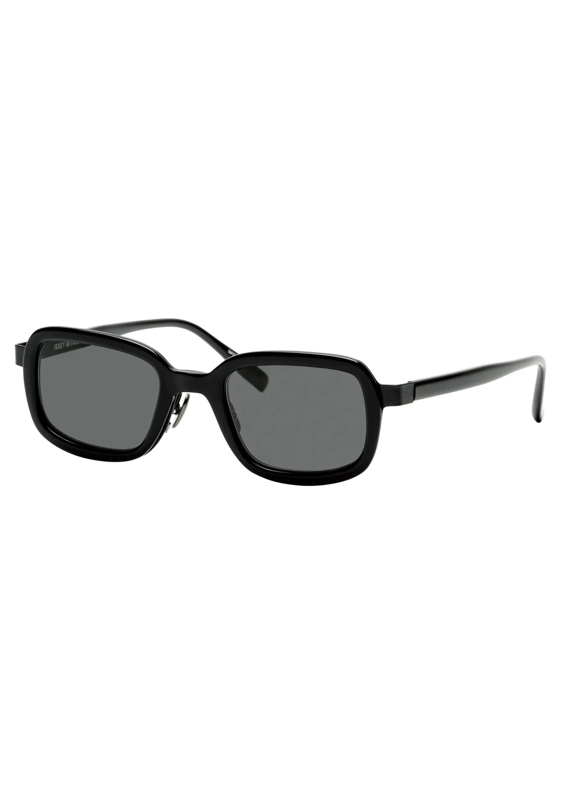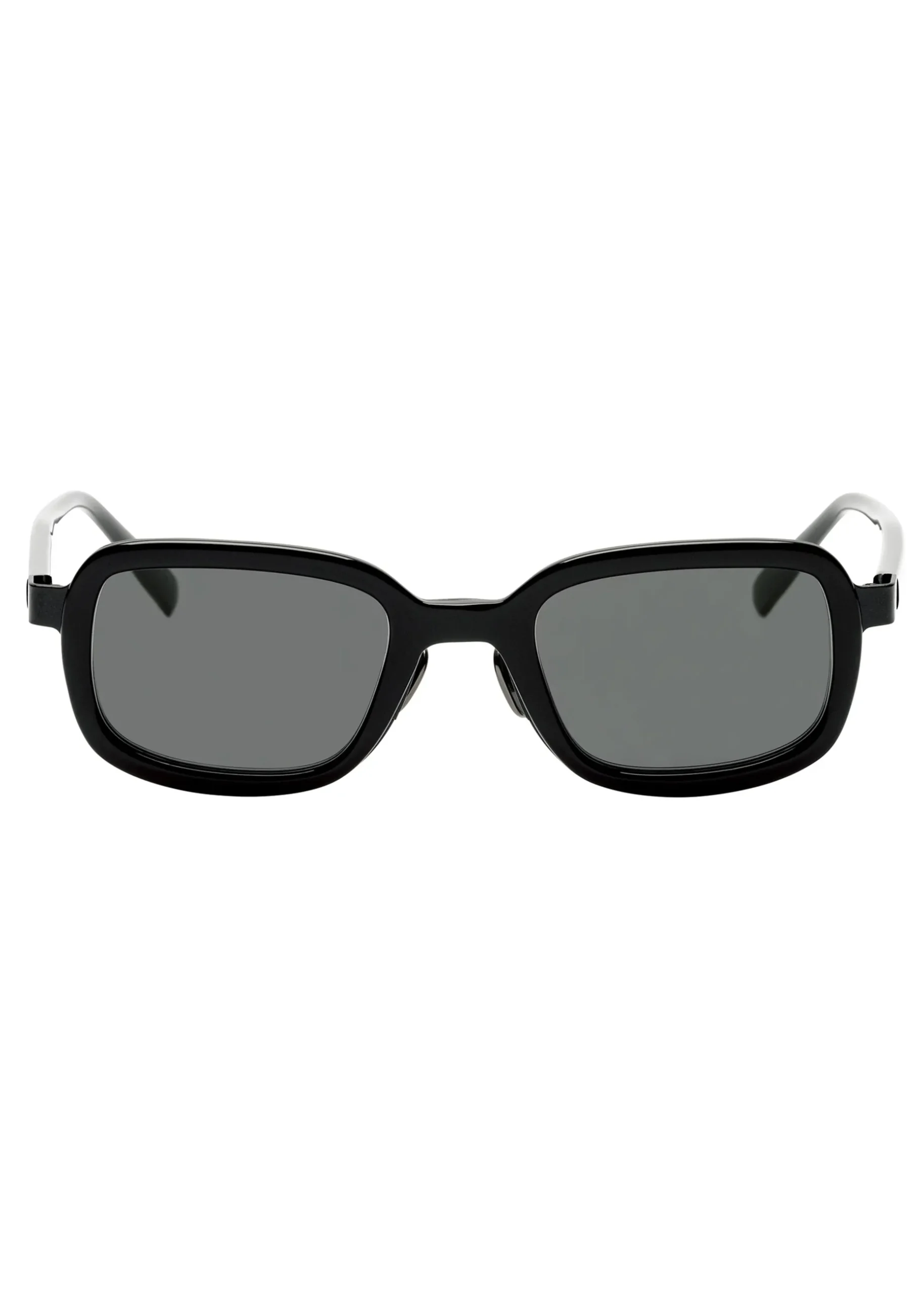 These sunglasses have a square shape, black rims, and dark grey lenses.