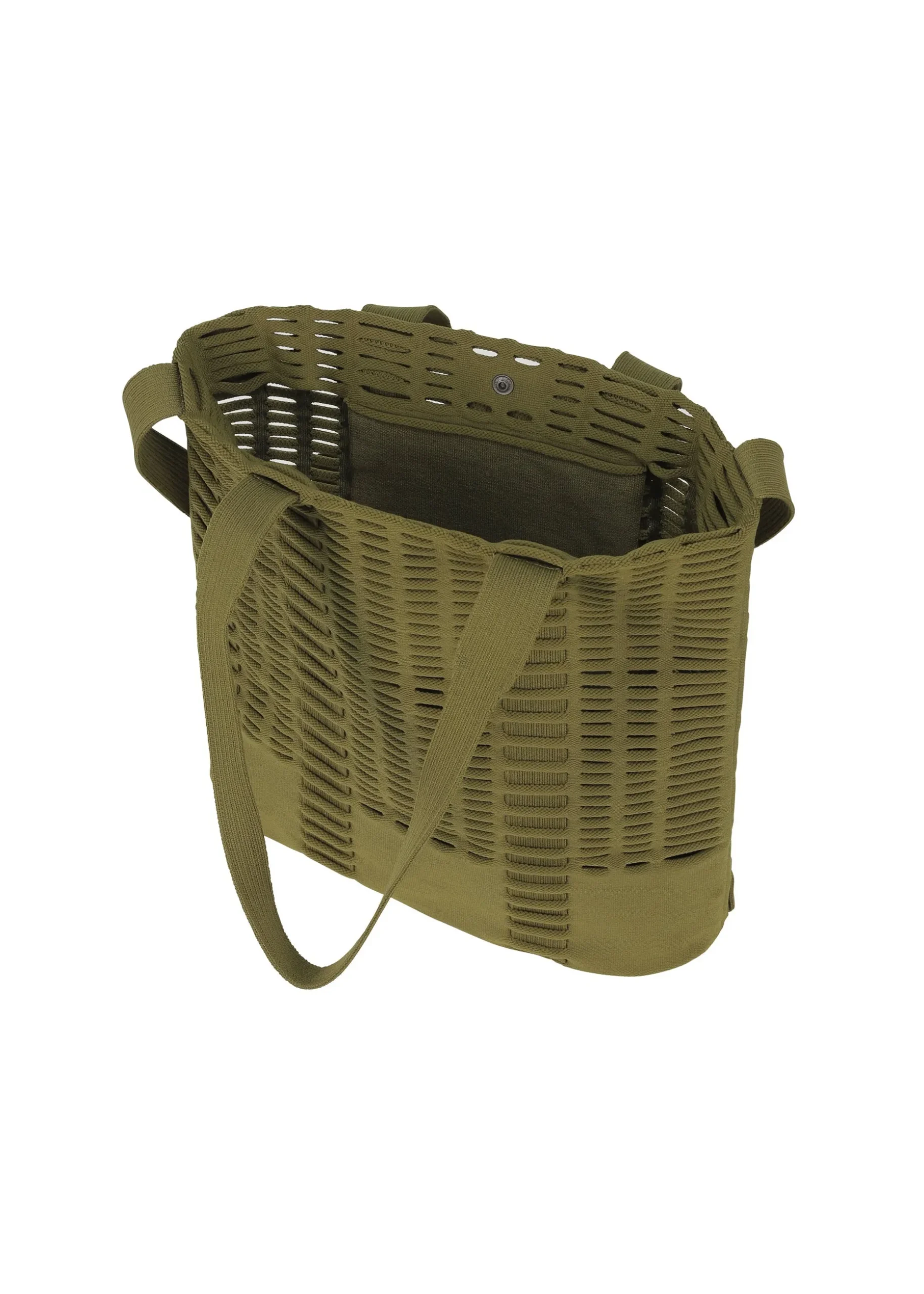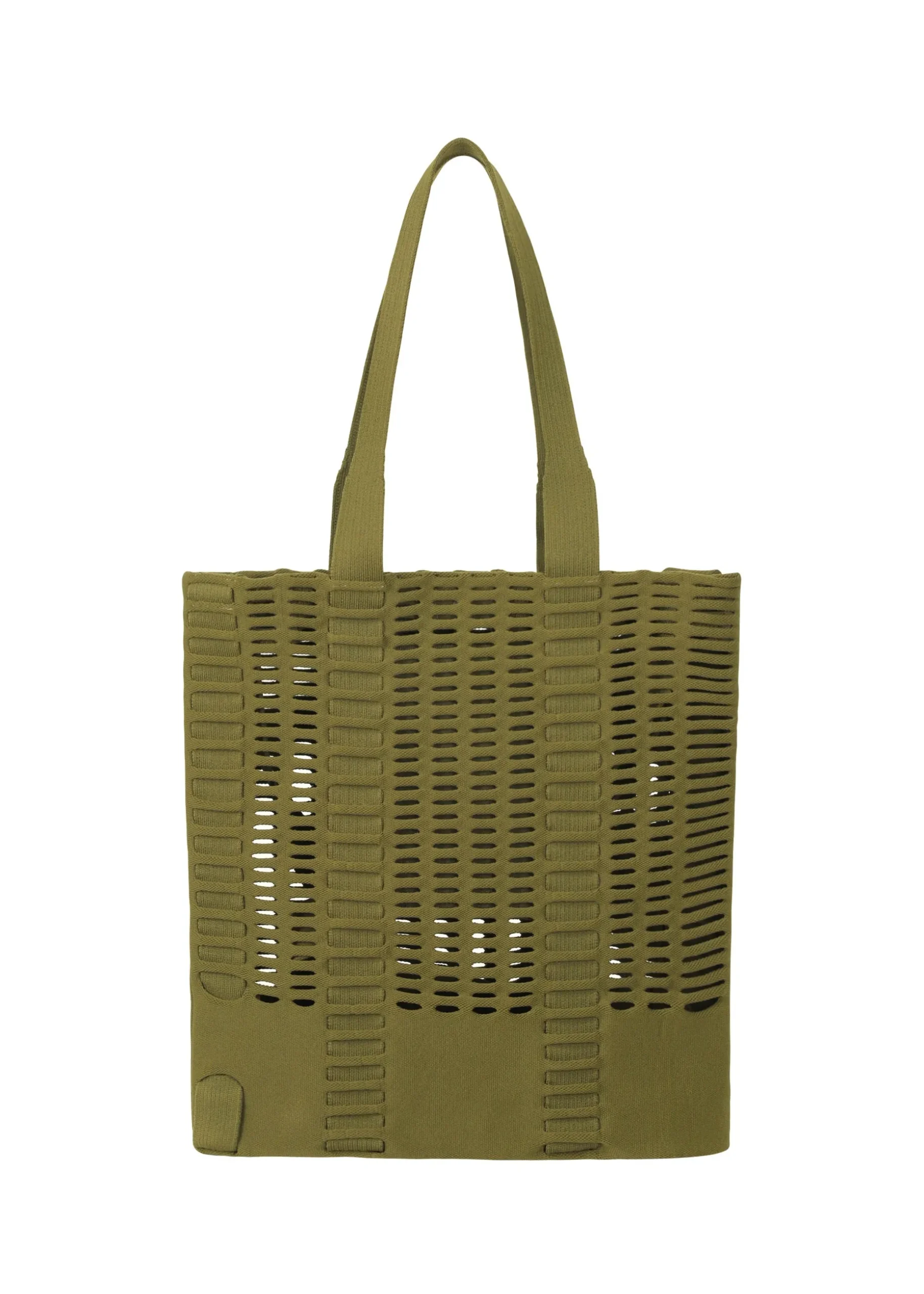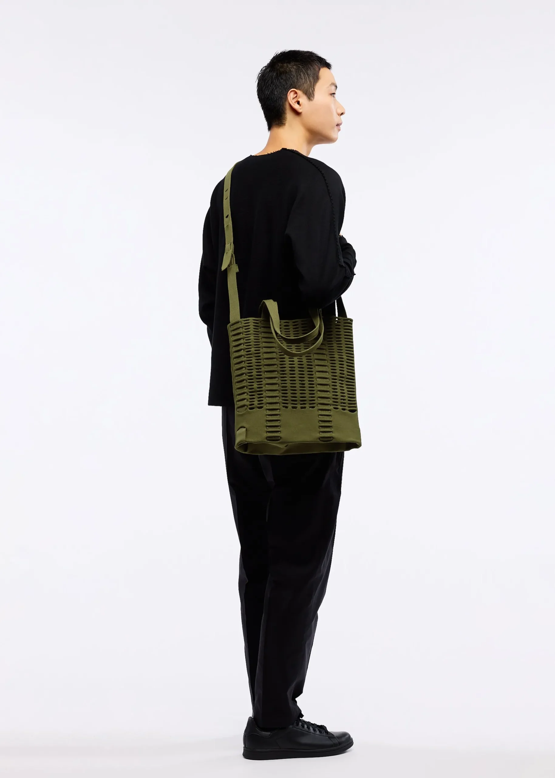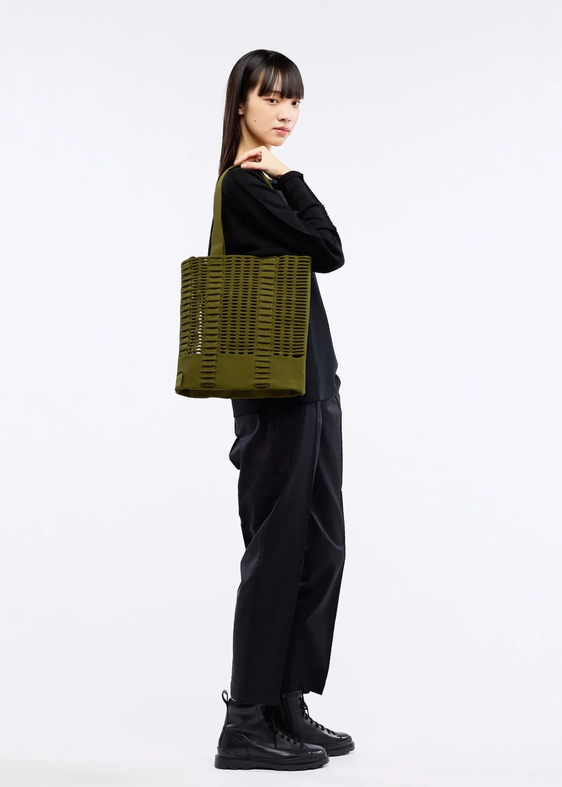 MOKKO series tote bag that is easy to use even in business situations. The fabric, which uses heat-fused thread, does not easily lose its shape and can securely store documents, PCs, and other items. There is also an inner pocket woven together with the main body. It also features a streamlined design that takes advantage of MOKKO’s unique weave, with the handle and shoulder tape passed through slits. The knitted tape is woven using the same thread as the main body, and fits perfectly to the body, and the length can be adjusted in three stages.