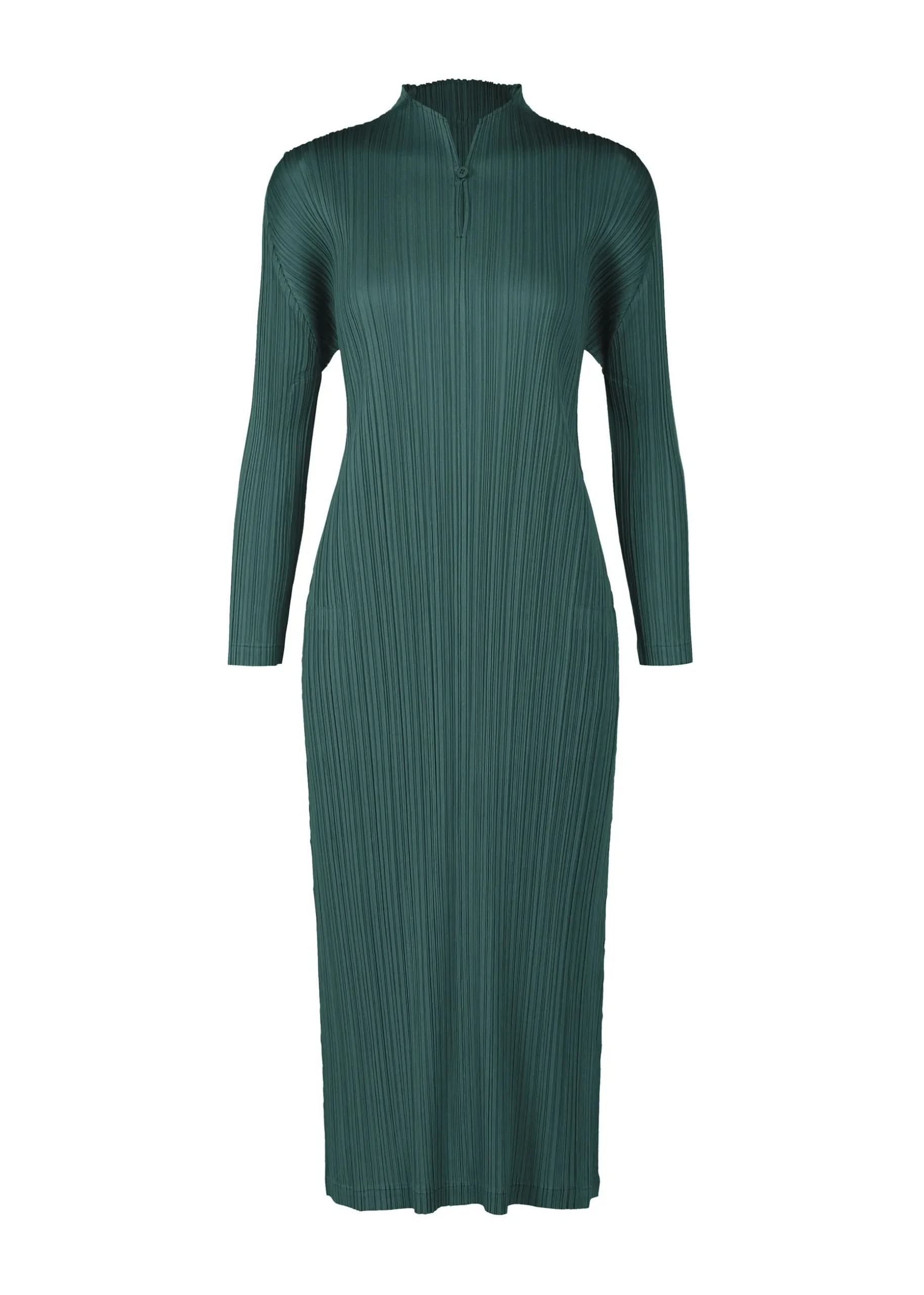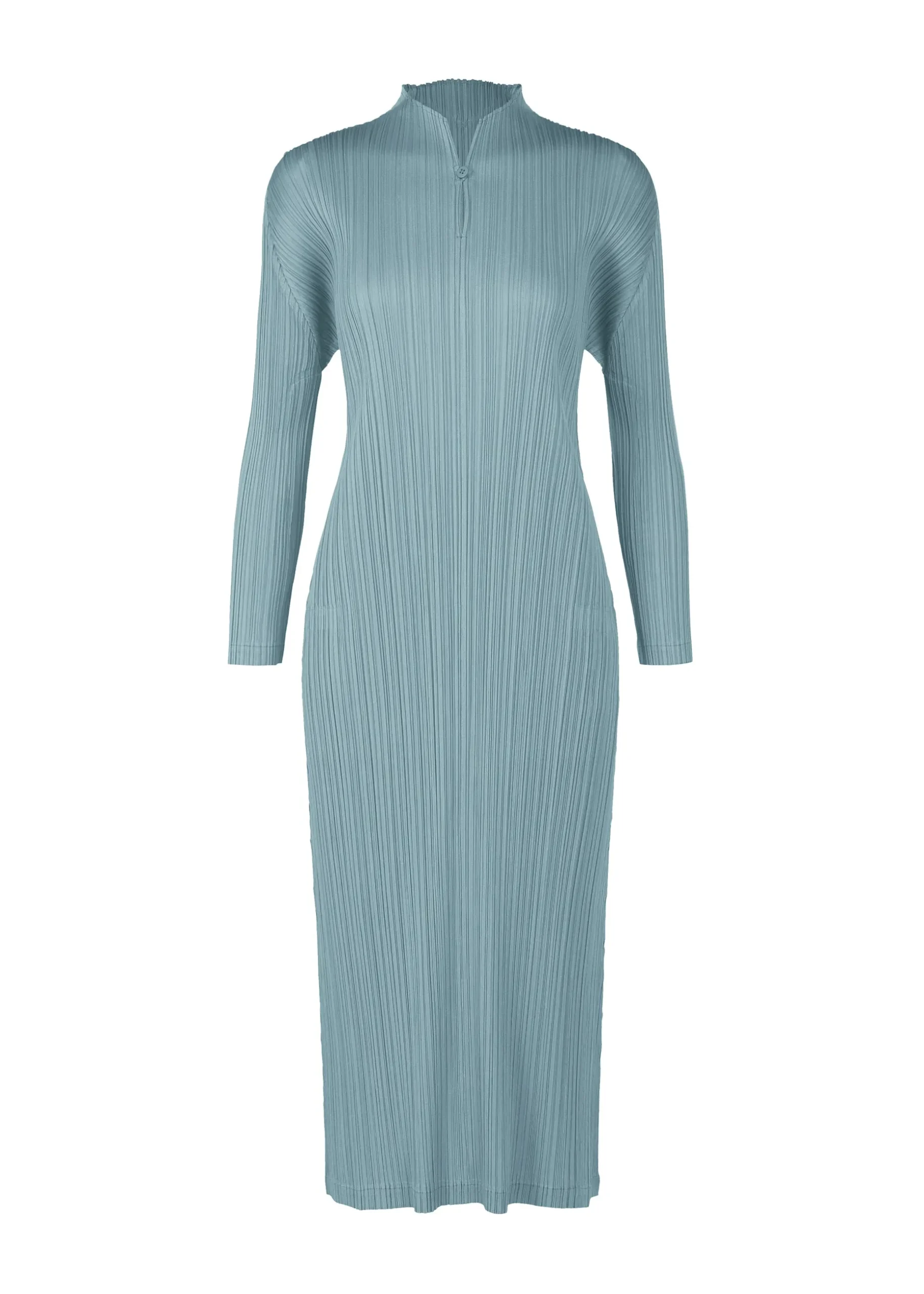 This long-sleeved dress is available in colors inspired by temperature differences that can be seen through infrared thermography cameras. Warmth is expressed with yellow and pink tones, while coolness is expressed in blue-gray and blue-green. The dress has a buttoned collar.