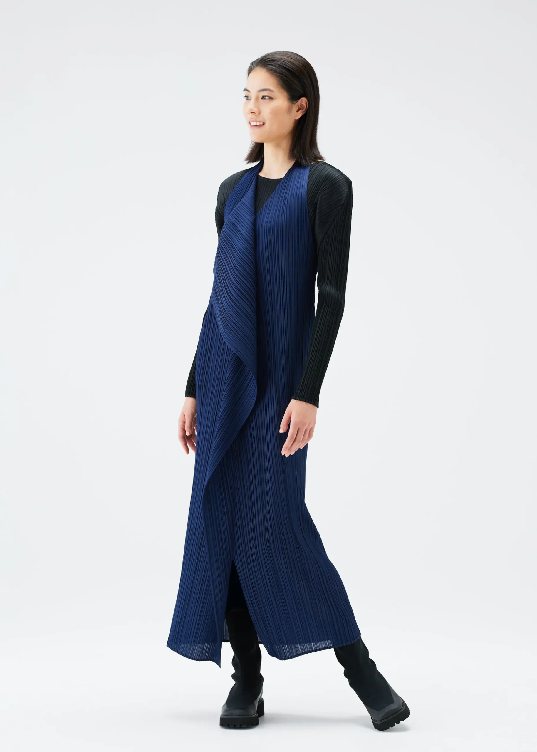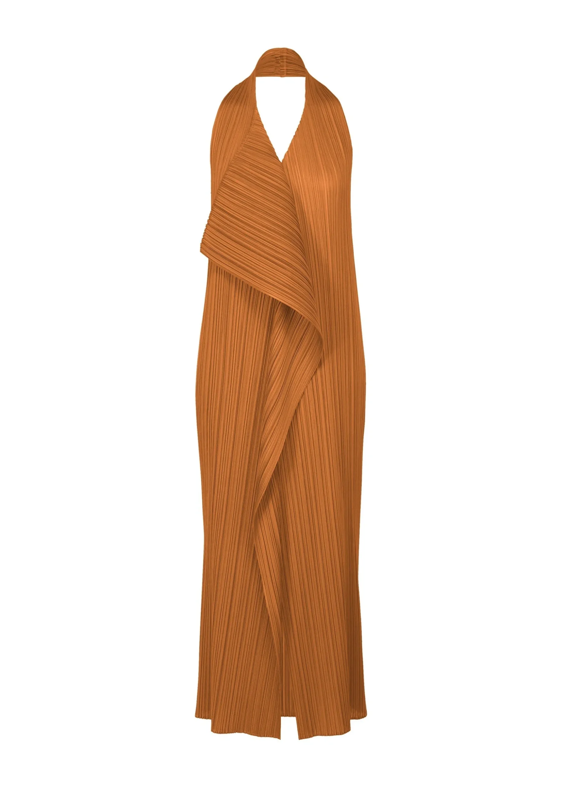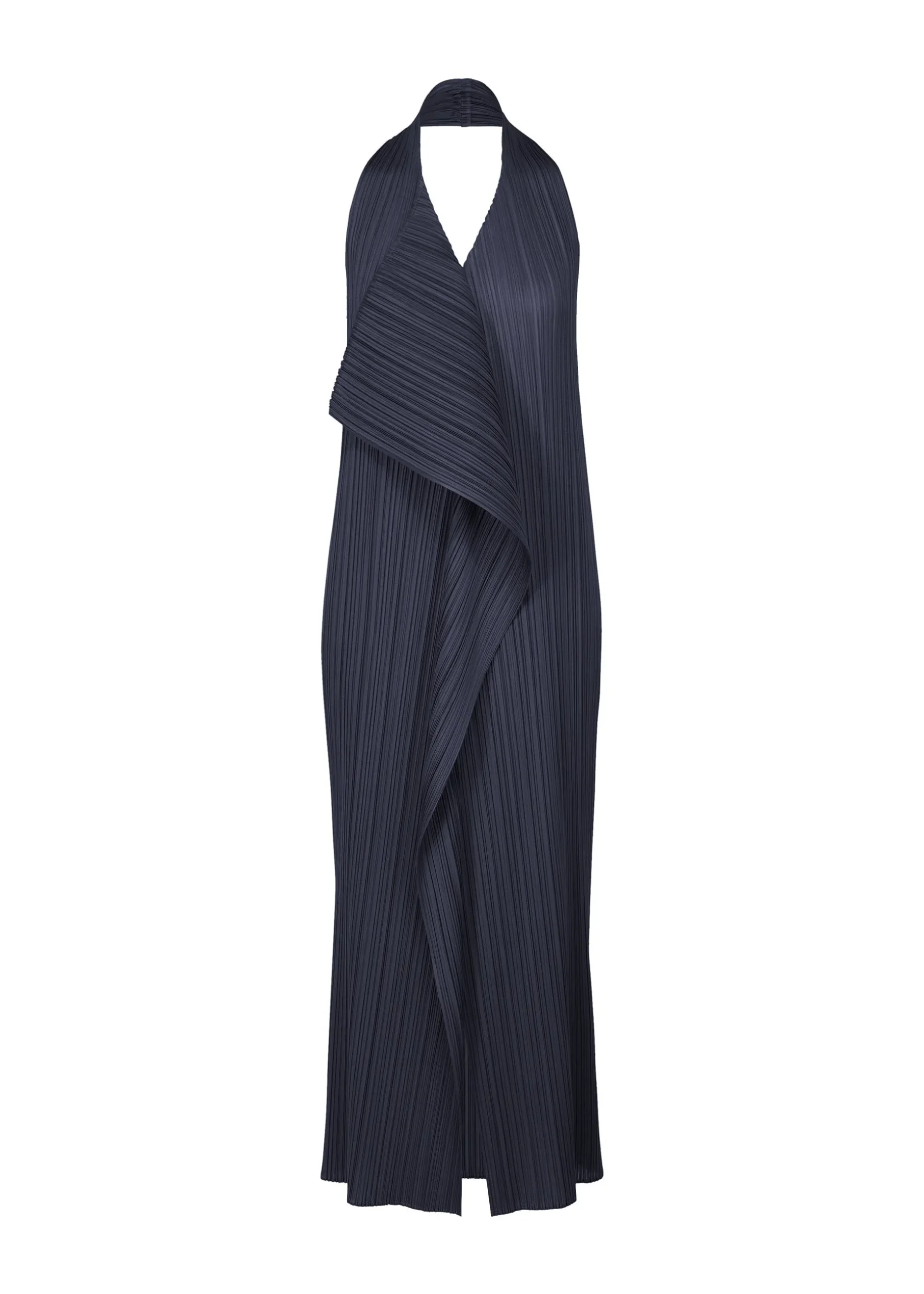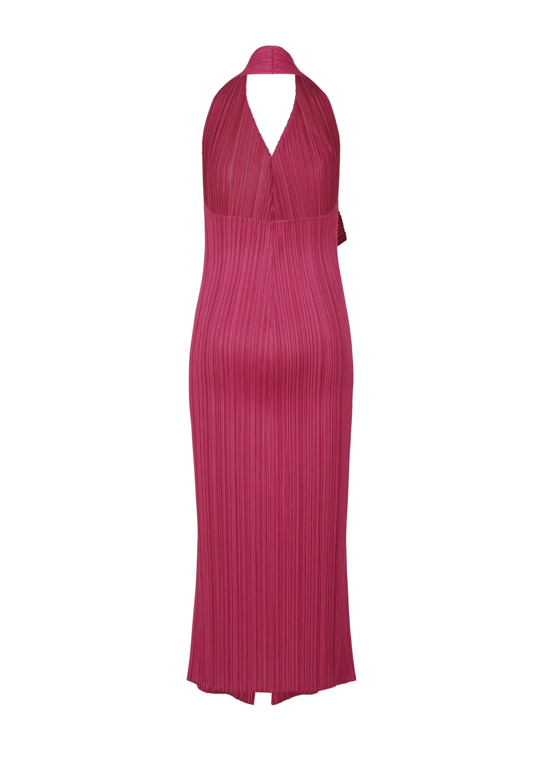 This pleated dress has a halter neck with a folded fabric detail and center slit.
