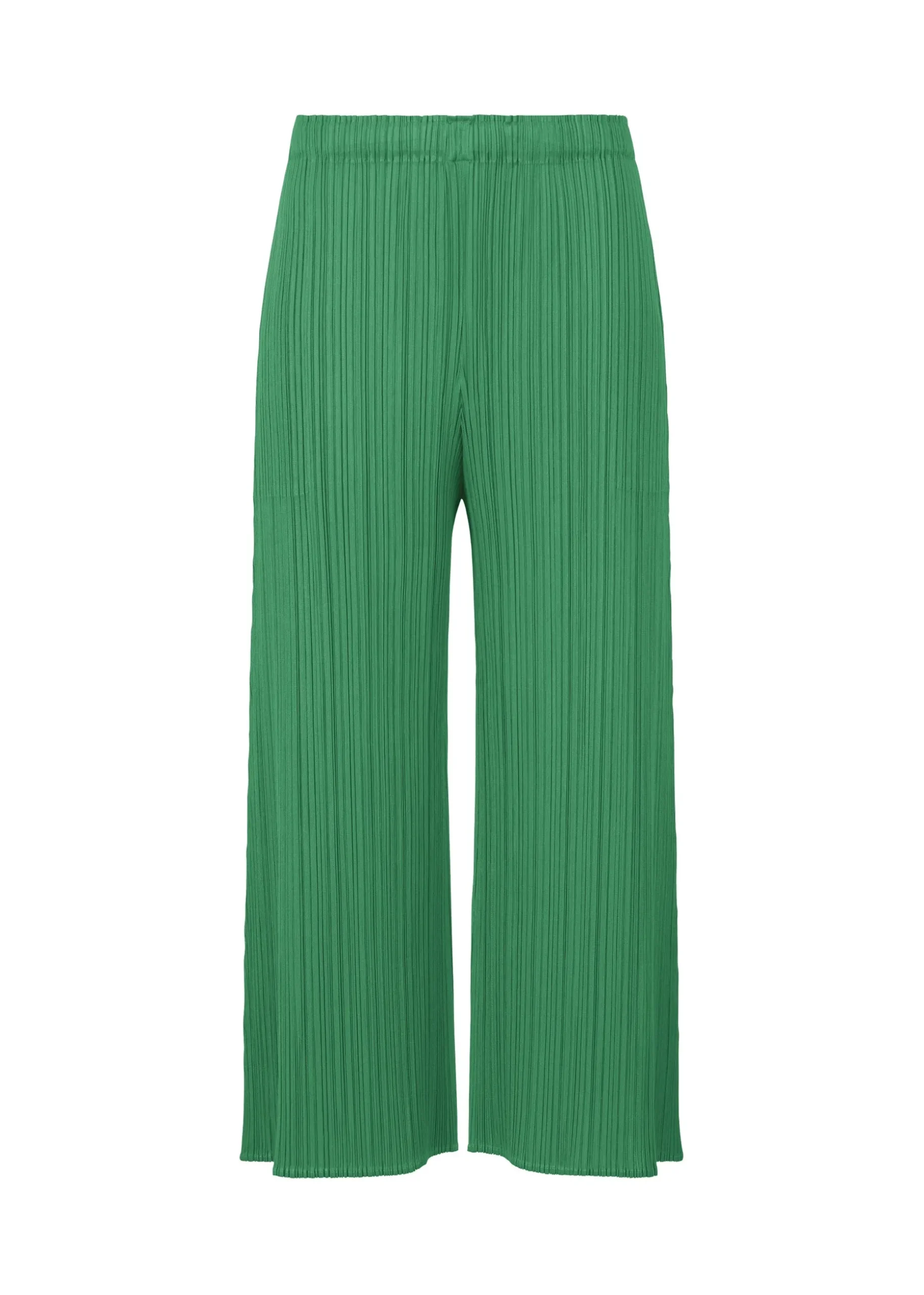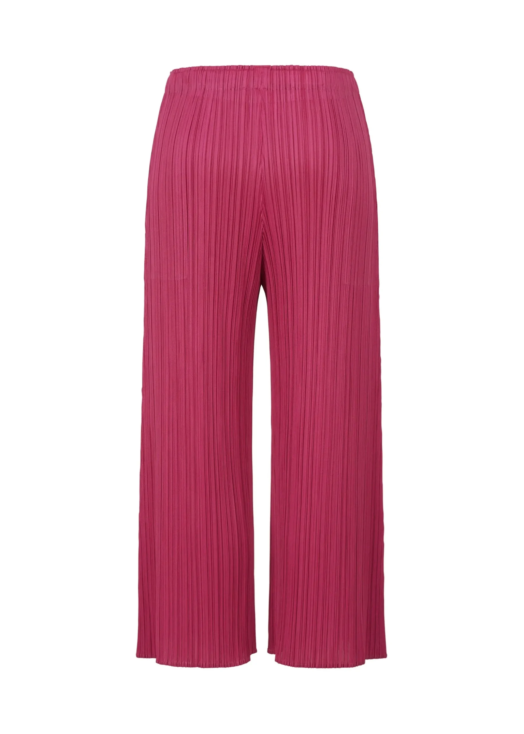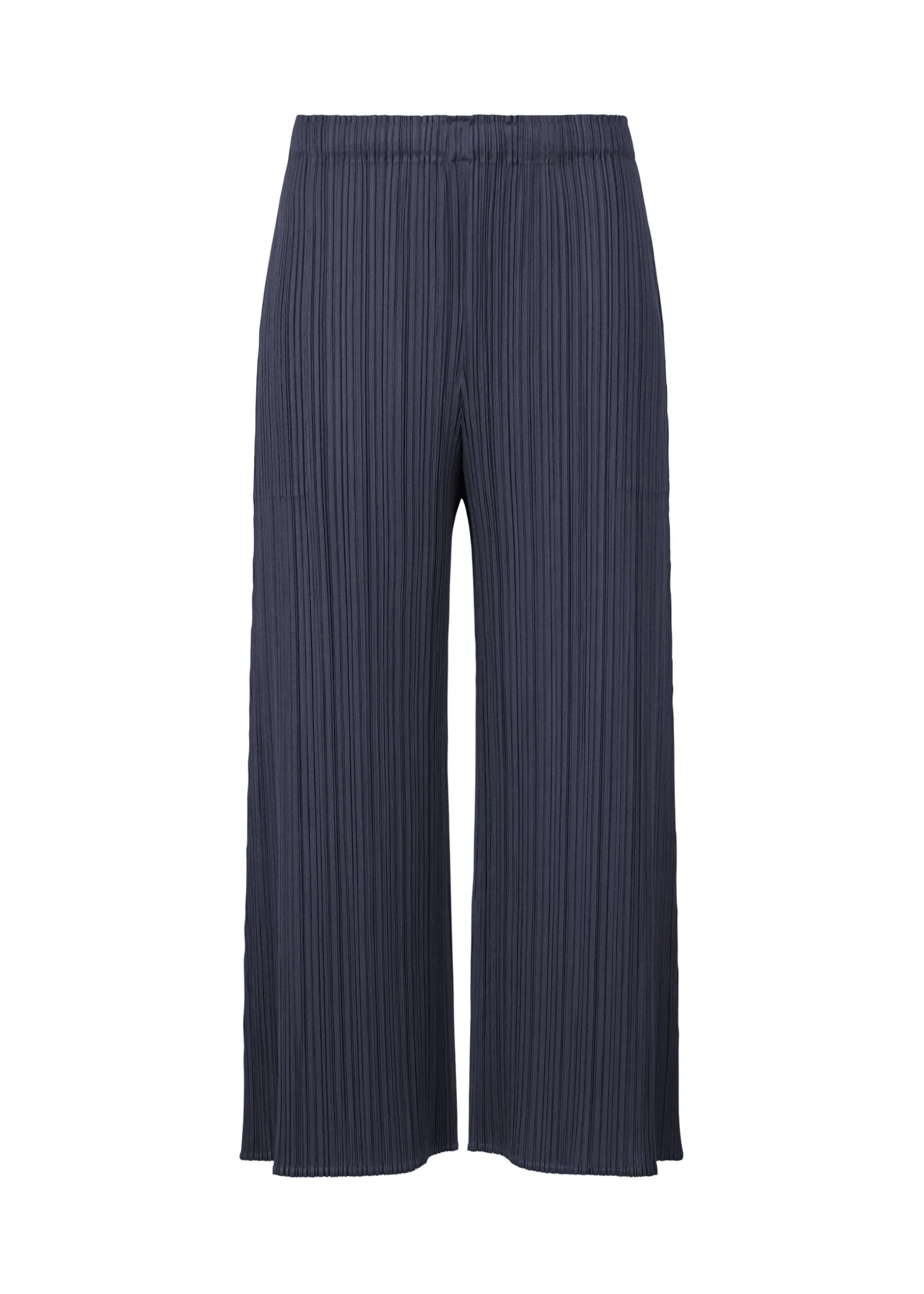 These pleated pants have a wide leg, elastic waist, and two side pockets.