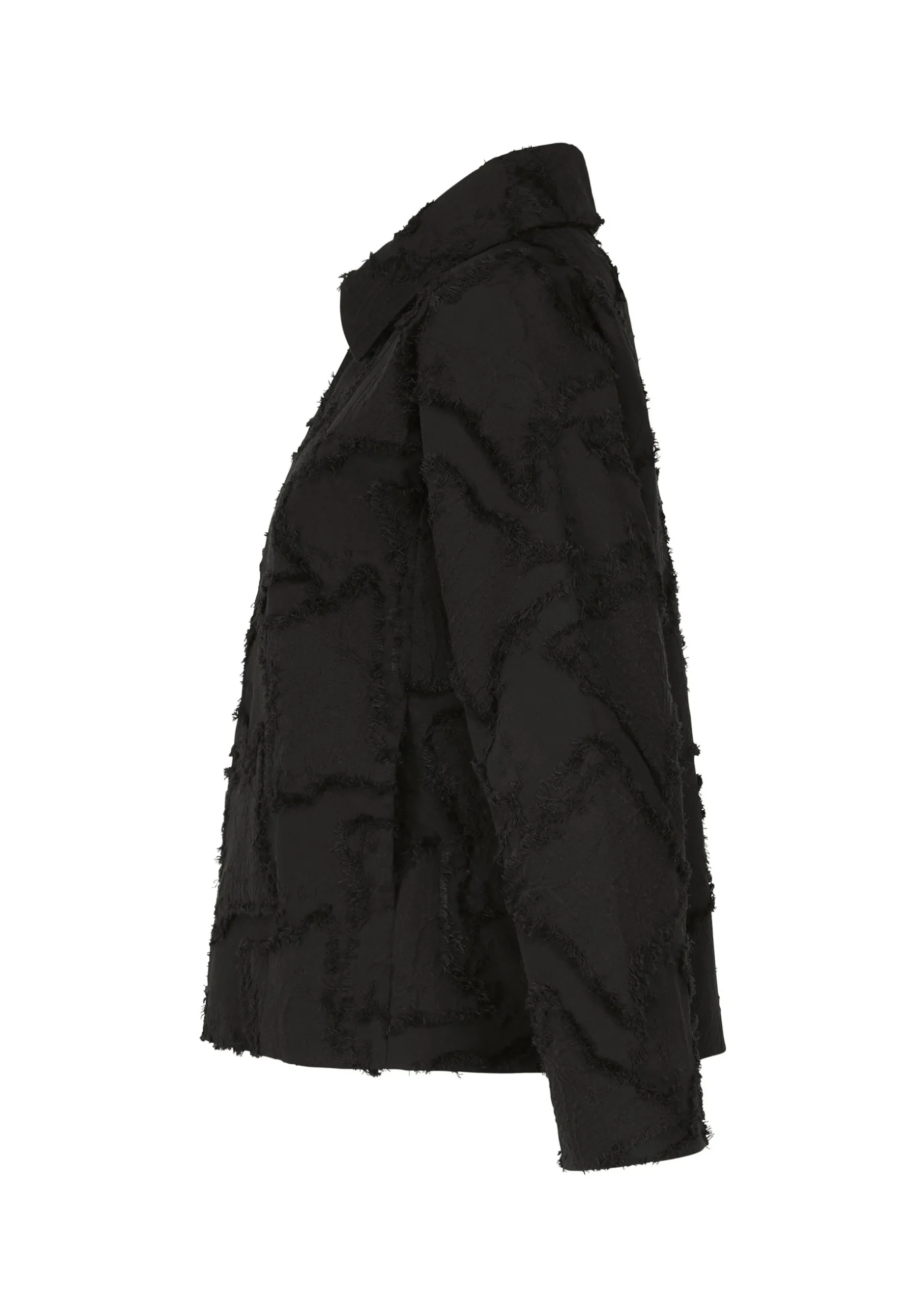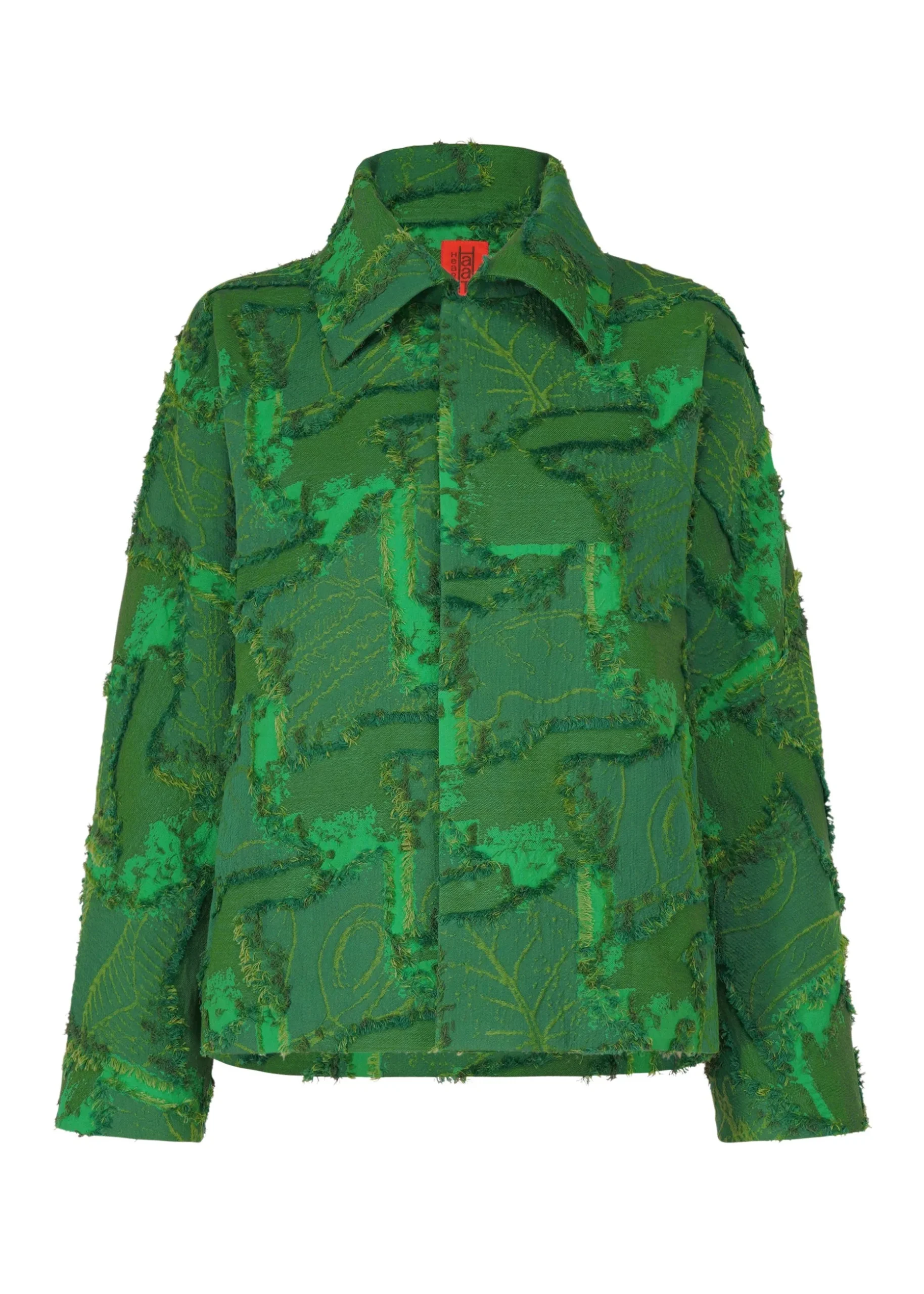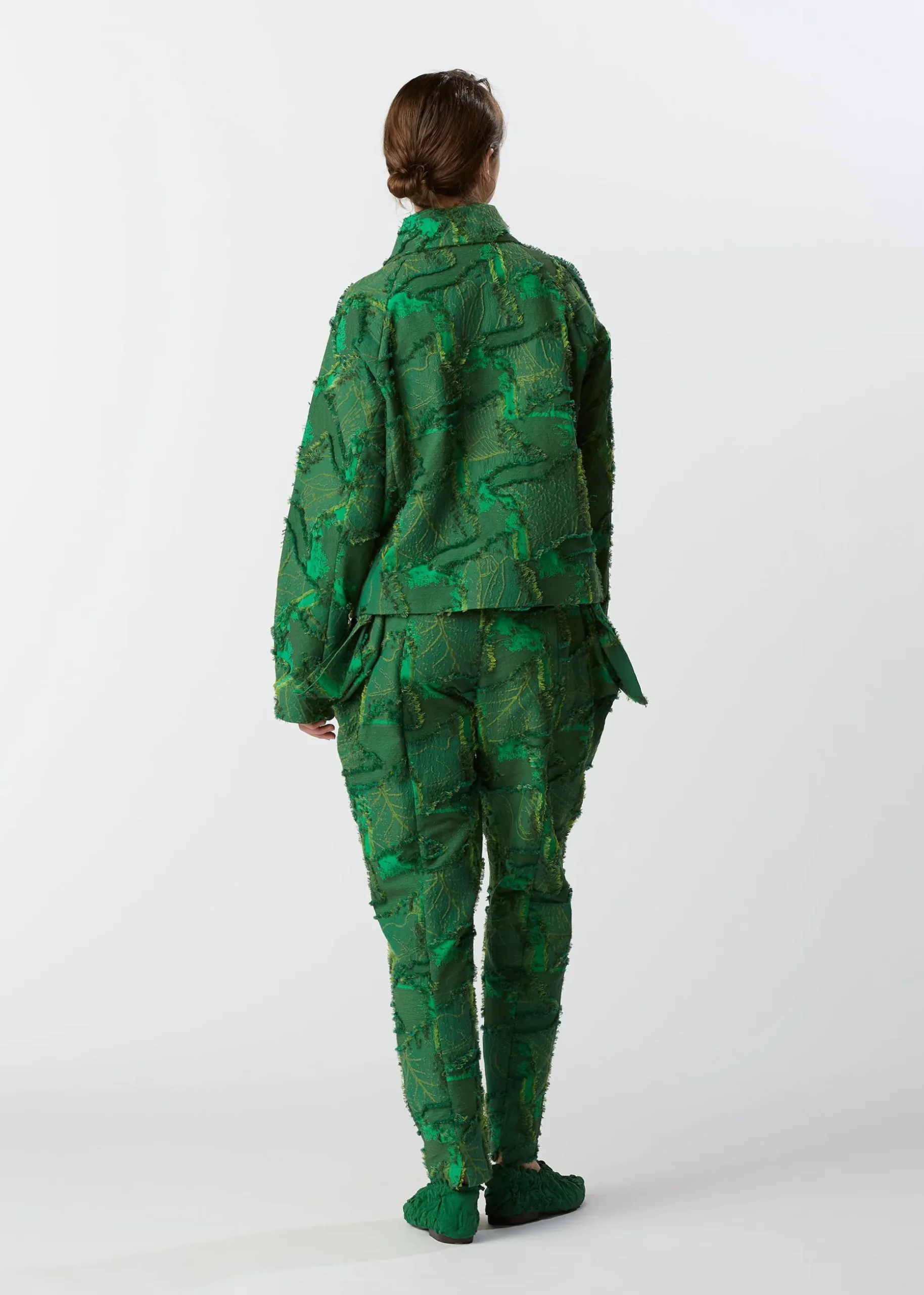 A jacket made of cut jacquard fabric with a staggered pattern inspired by the veins of leaves in trees. After weaving a complex jacquard with a double structure using two colors of cotton thread for the warp thread and two colors of cotton thread and one color of polyester thread for the weft thread, we cut the threads where the warp and weft threads cross to create a three-dimensional pattern.