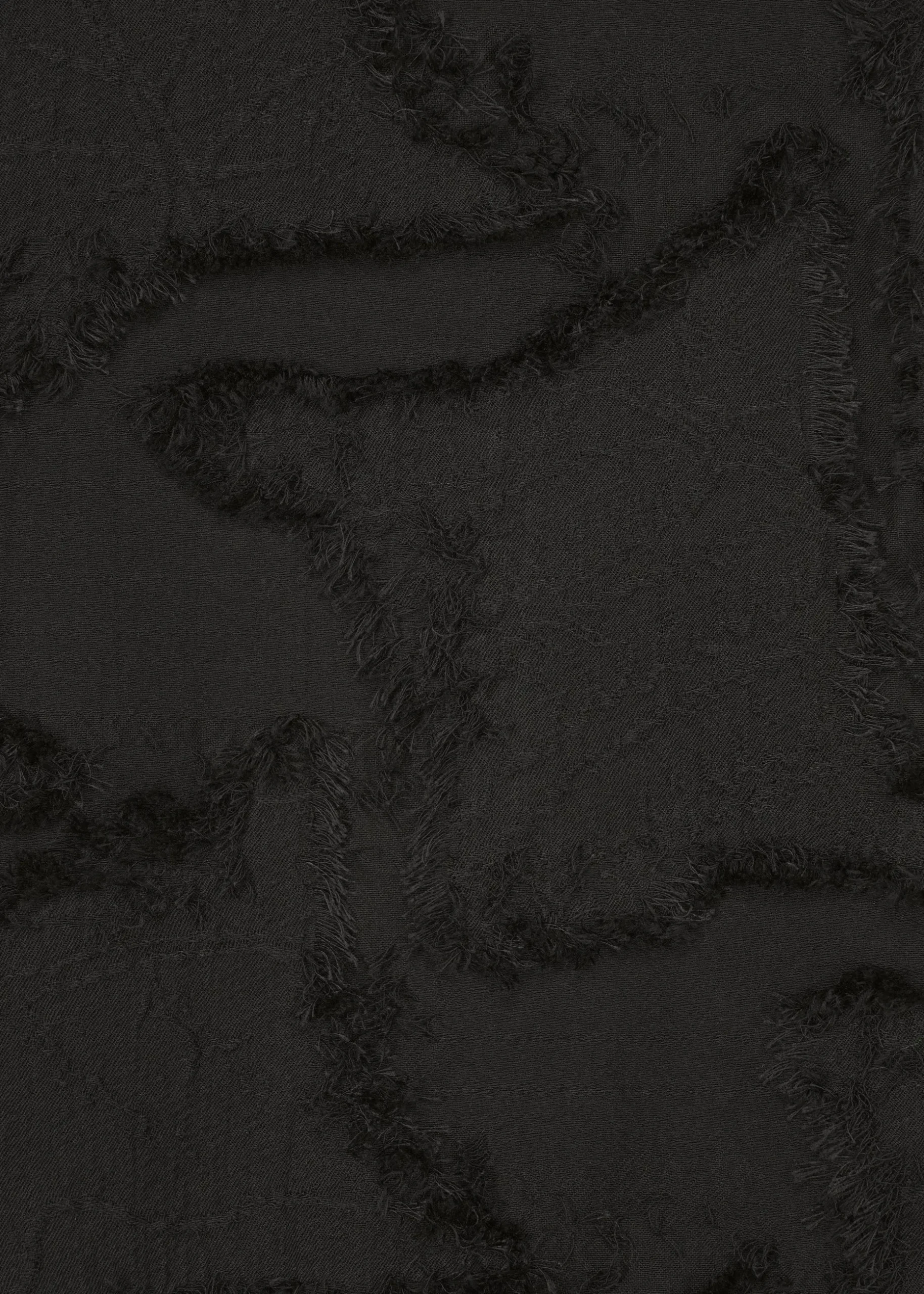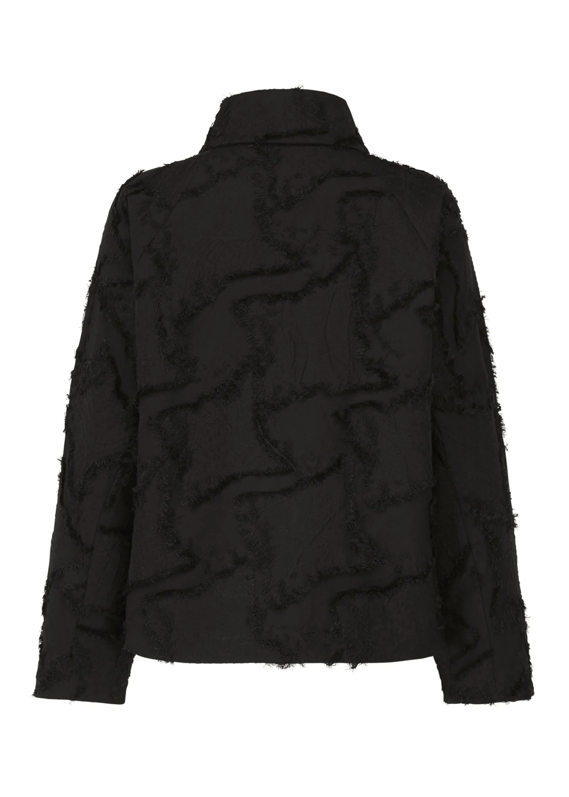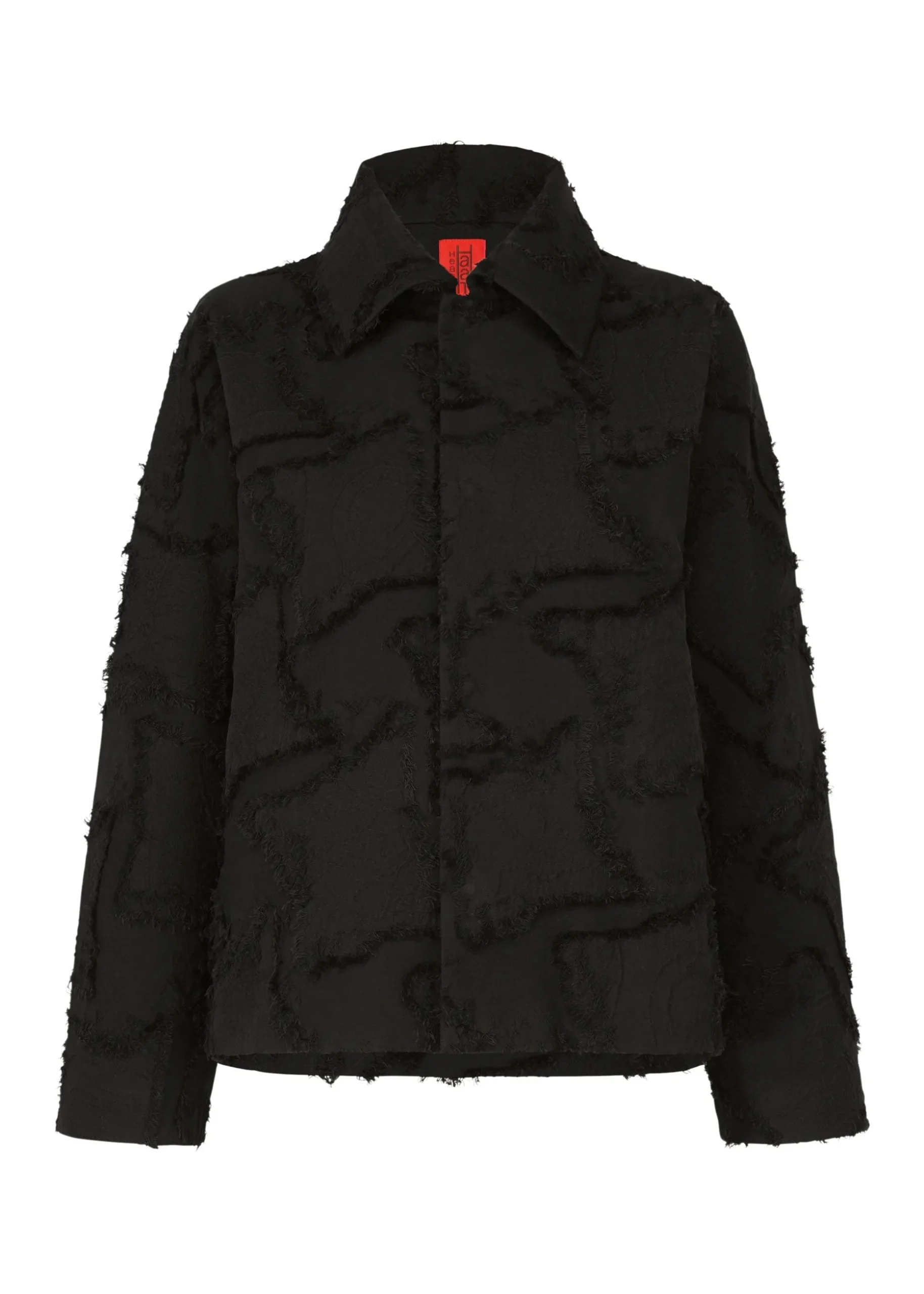 A jacket made of cut jacquard fabric with a staggered pattern inspired by the veins of leaves in trees. After weaving a complex jacquard with a double structure using two colors of cotton thread for the warp thread and two colors of cotton thread and one color of polyester thread for the weft thread, we cut the threads where the warp and weft threads cross to create a three-dimensional pattern.