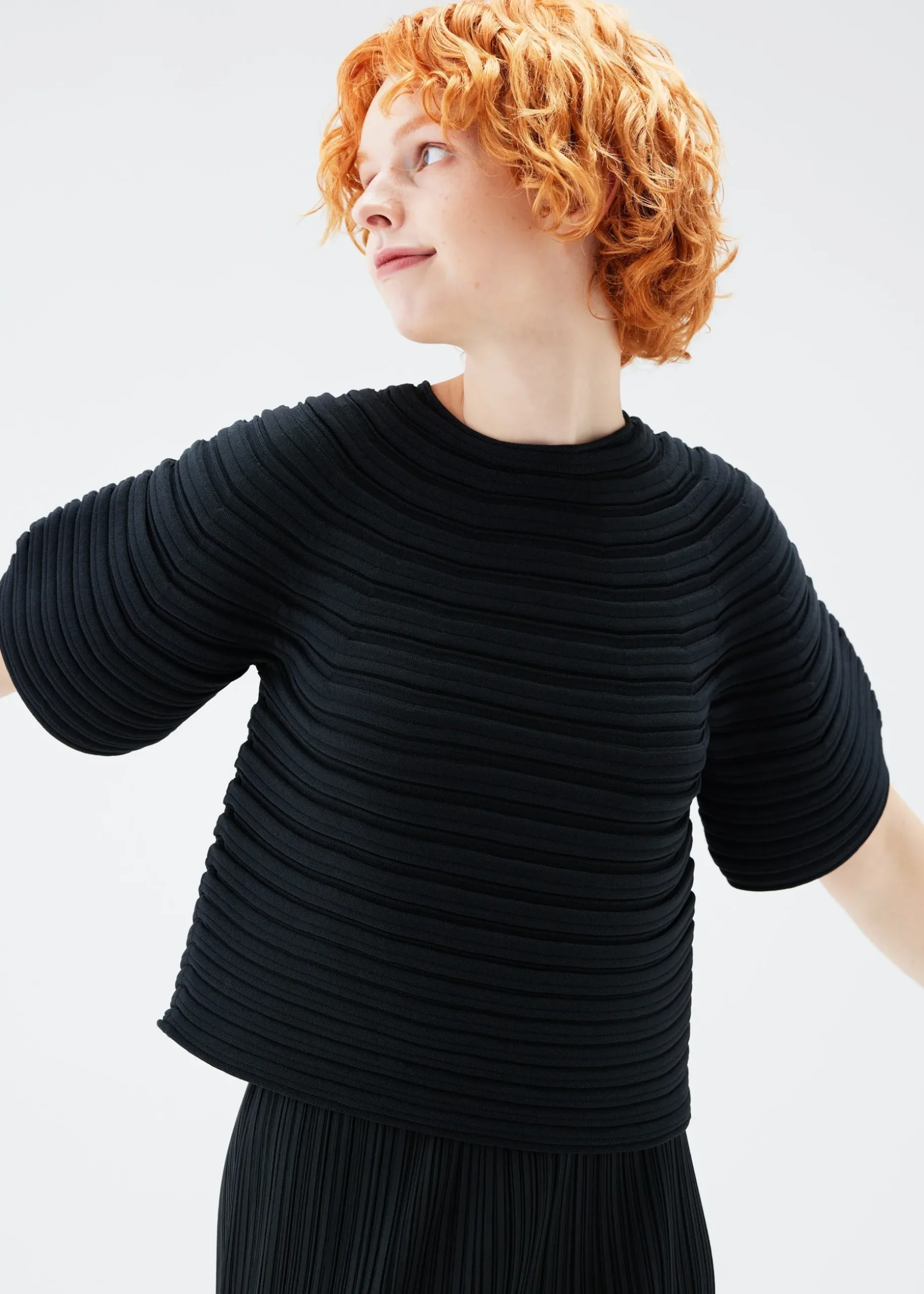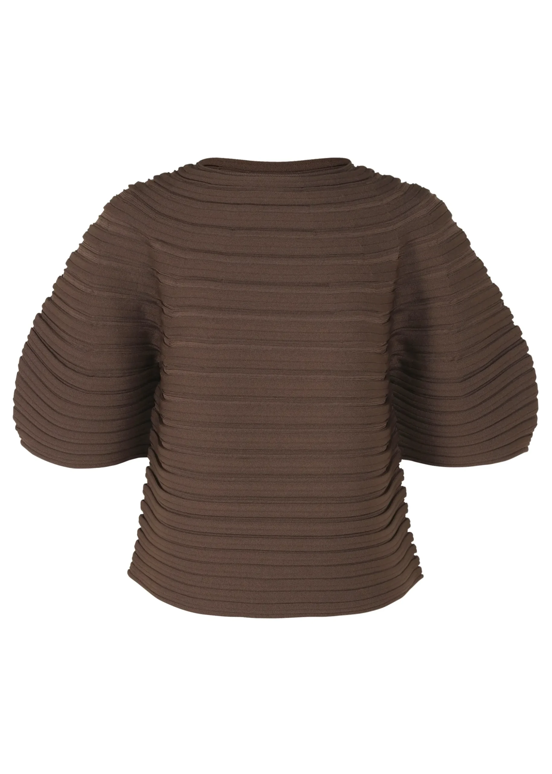 This round-neck knit is characterized by its round sleeves when it is worn and its mushroom-like form when it is laid flat. It is knit without sewing from soft polyester thread. It is an item that is easy to care for as it can be machine-washed.