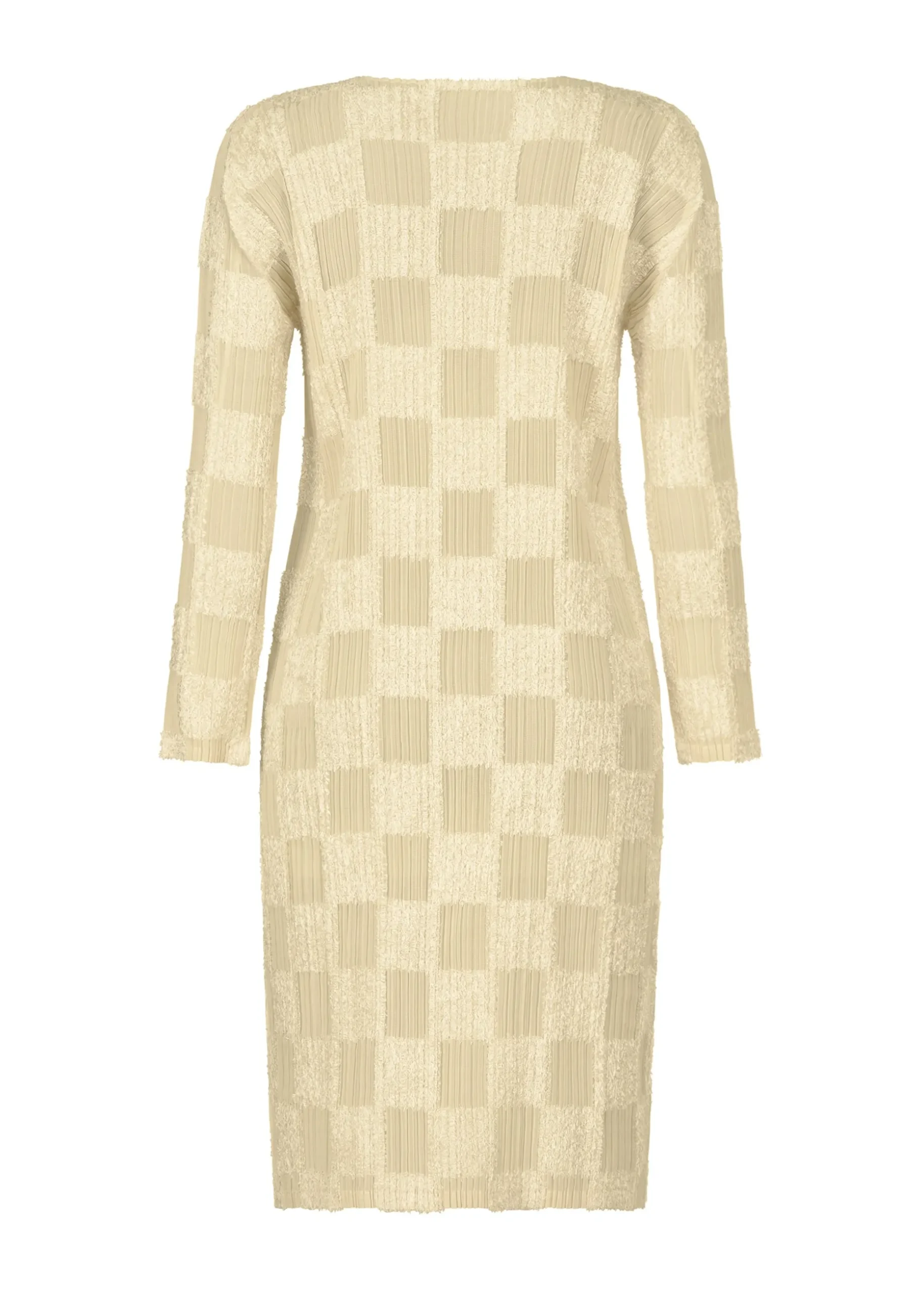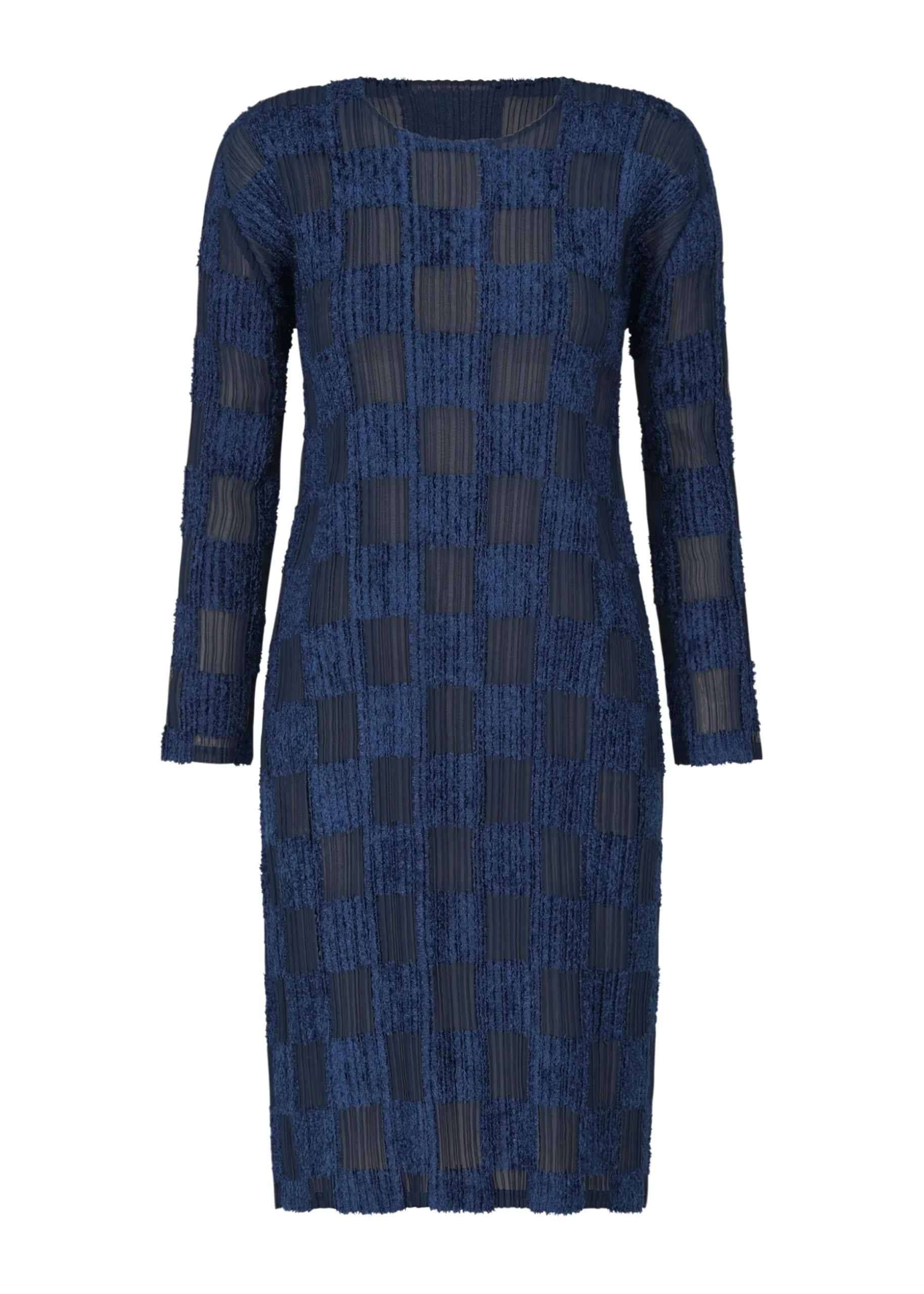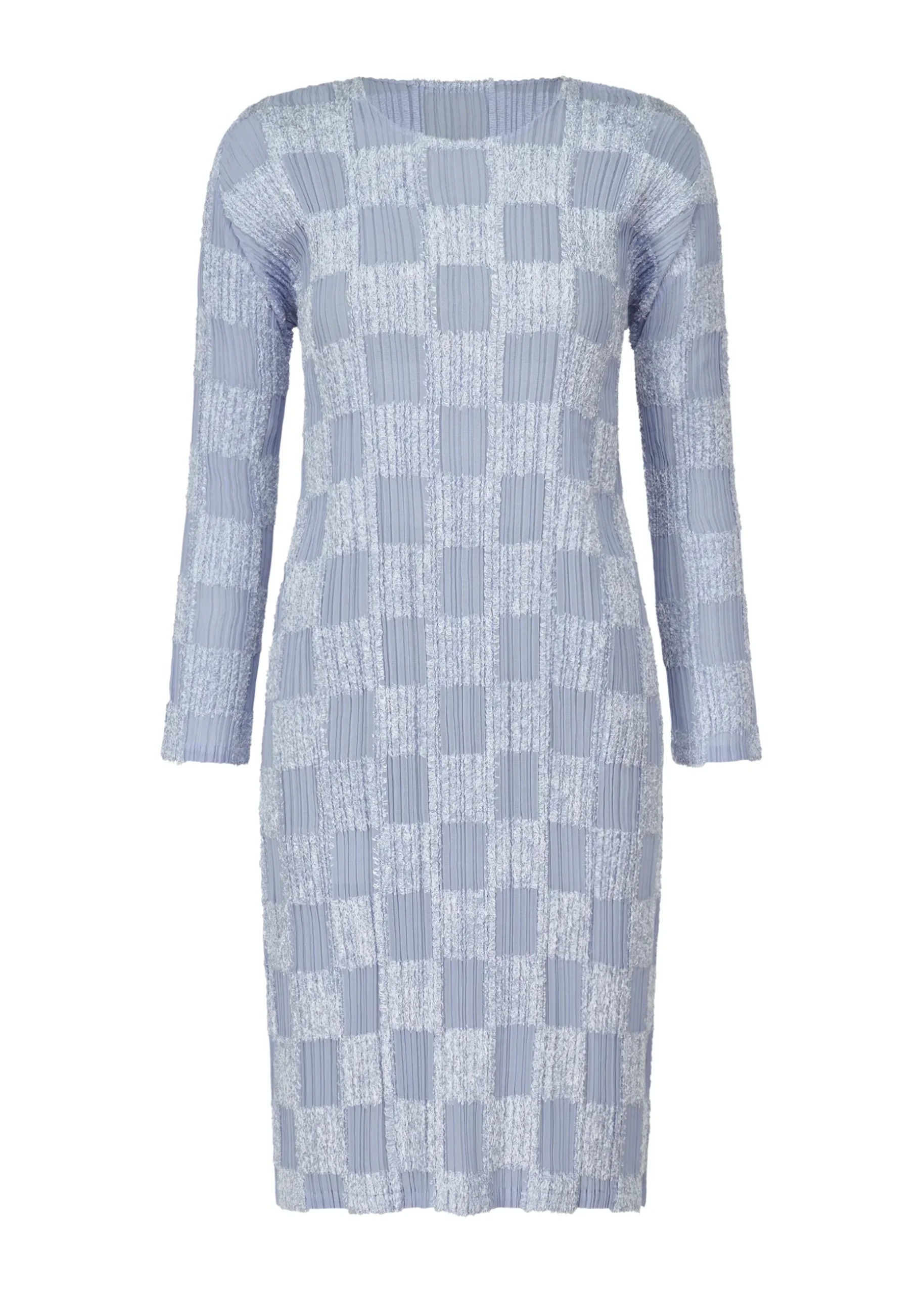 This round-neck, long-sleeved dress is characterized by its plaid pattern with different materials. It is sheer and can be layered with a variety of items.