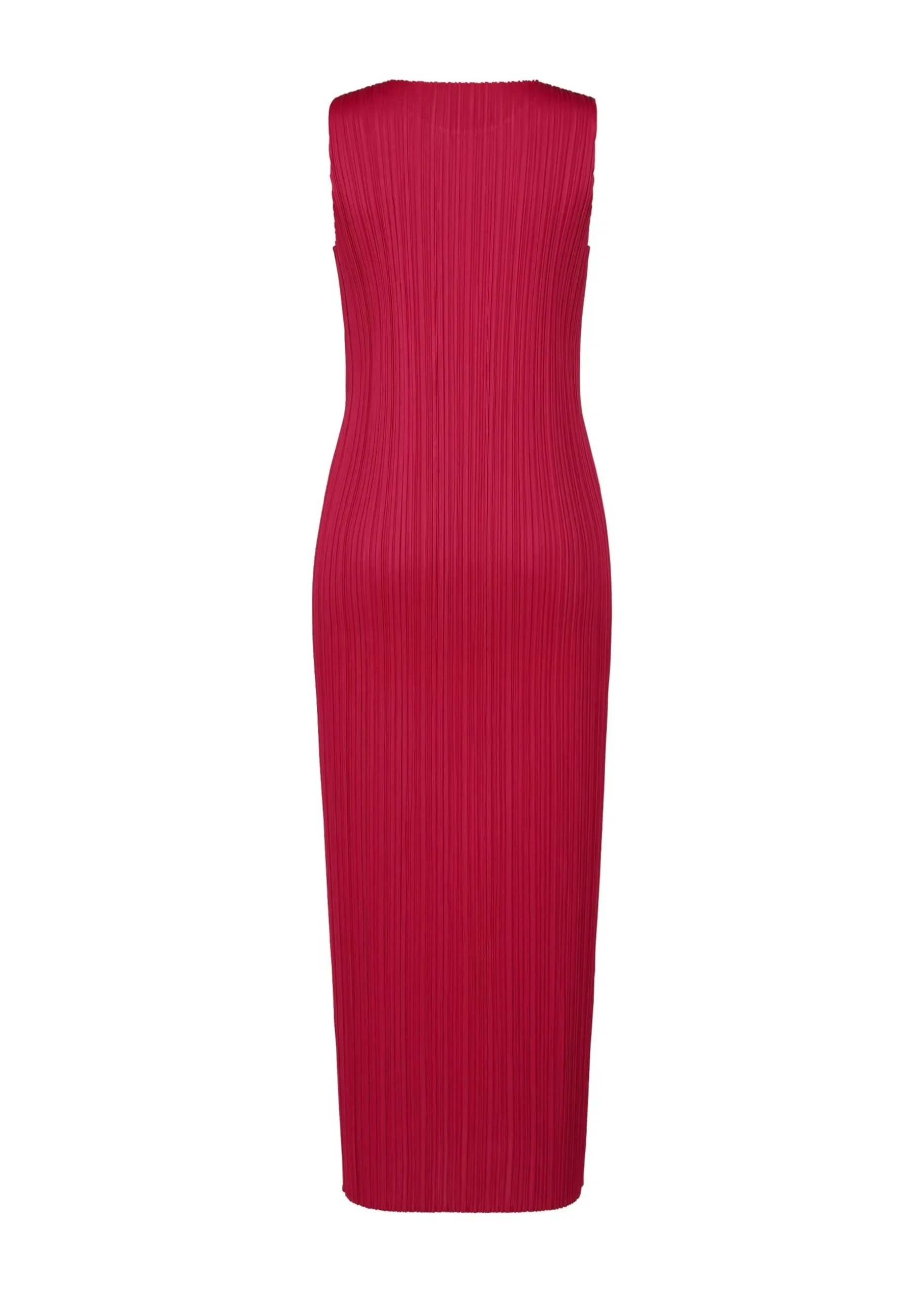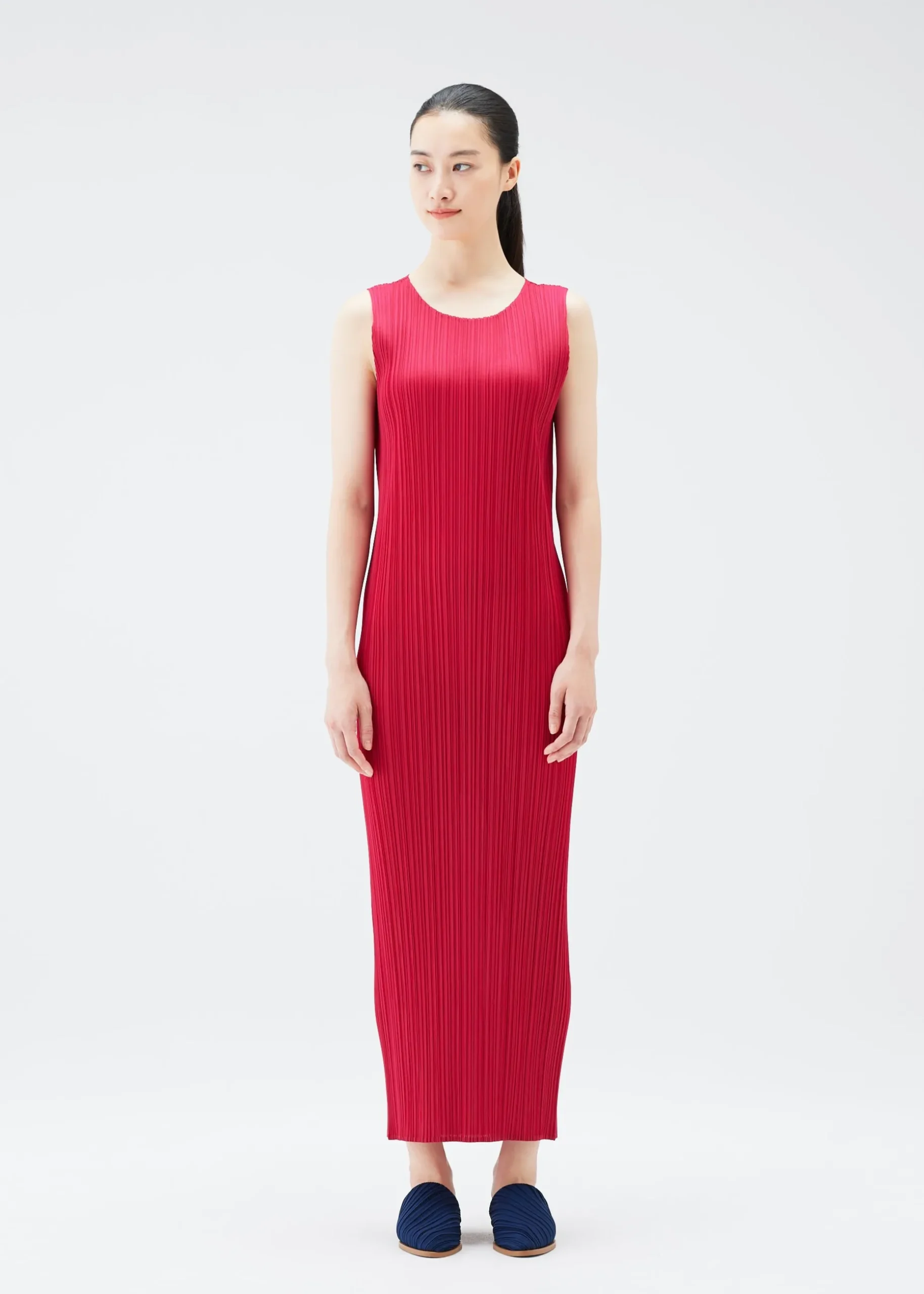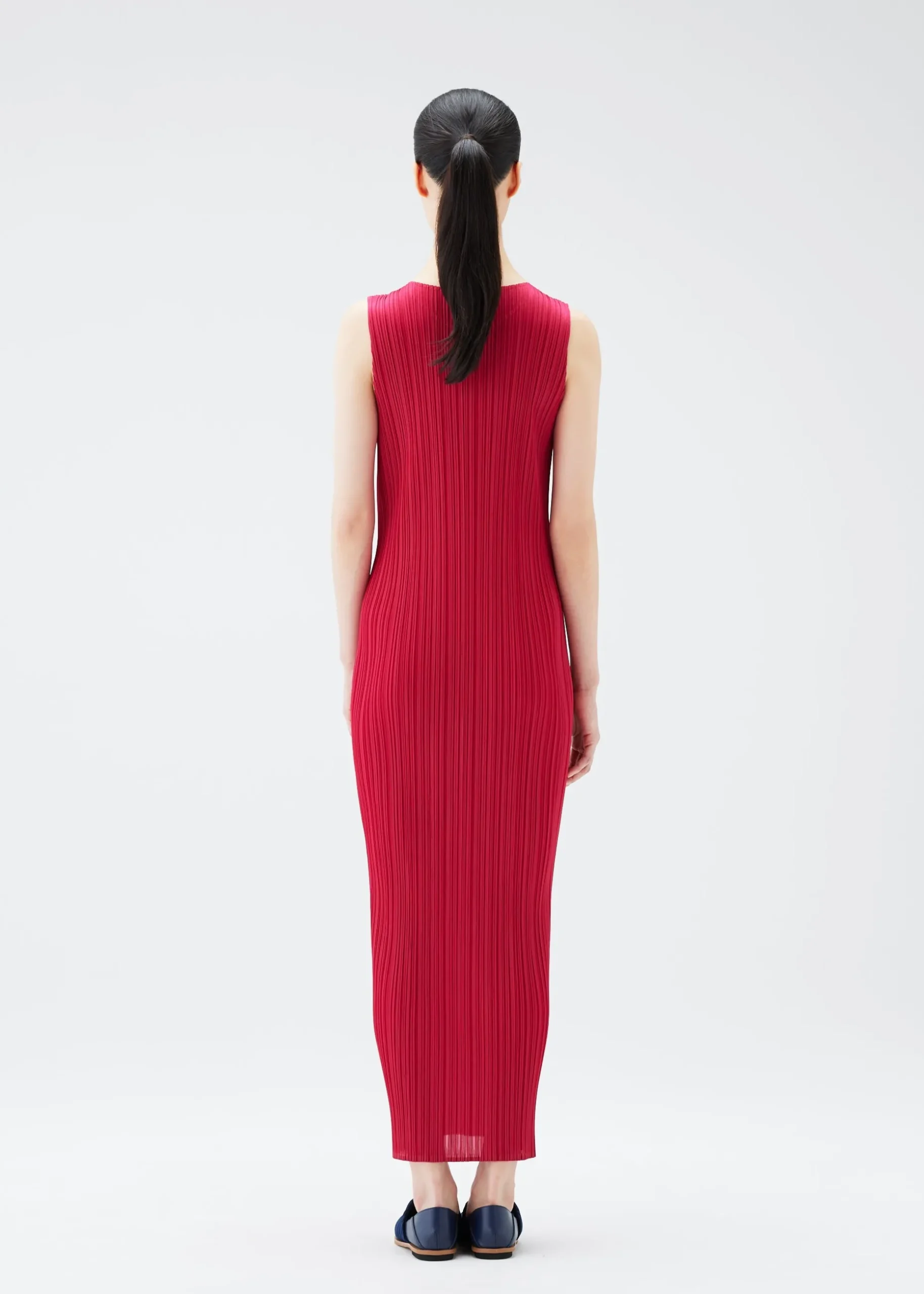 This sleeveless pleated dress has a slim shape, scoop neck, and can be reversed for a straight neck and scoop back.