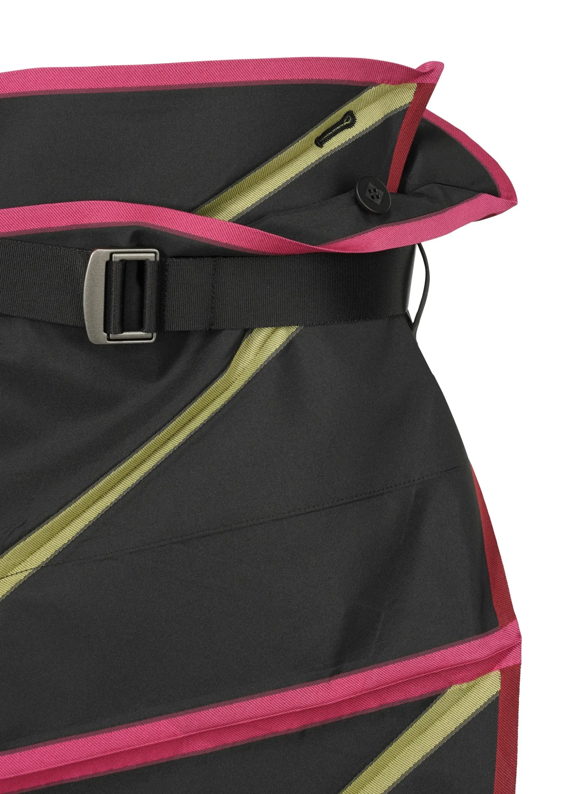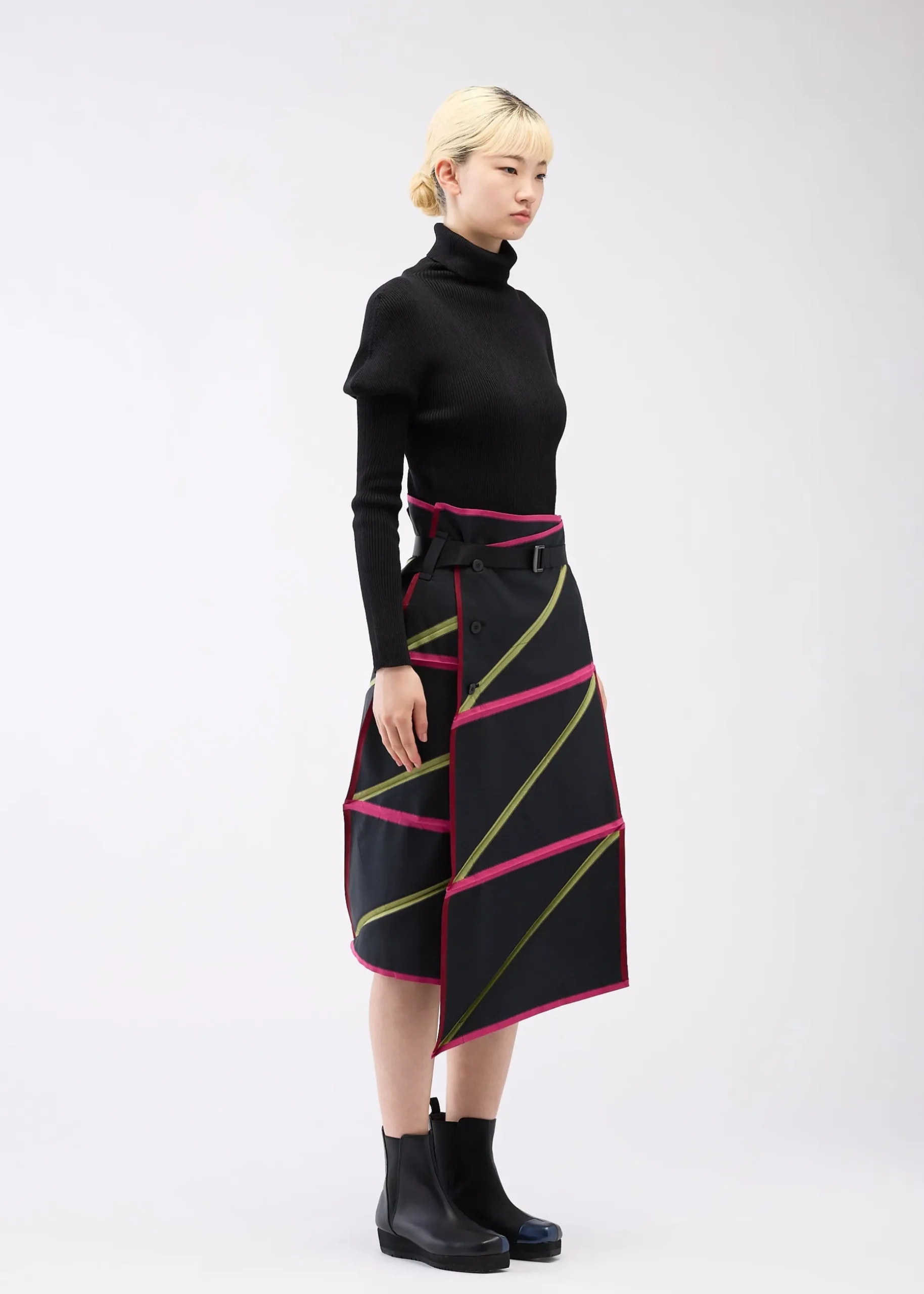 This skirt is based on the fold structure “NO. 5,” which connects a series of same-size parallelograms to form a spiral-shaped quadrangular column when made three-dimensional. The skirt is characterized by its jacquard-woven pattern along each parallelogram that serves as a fold line.The waist can be adjusted with the included belt.