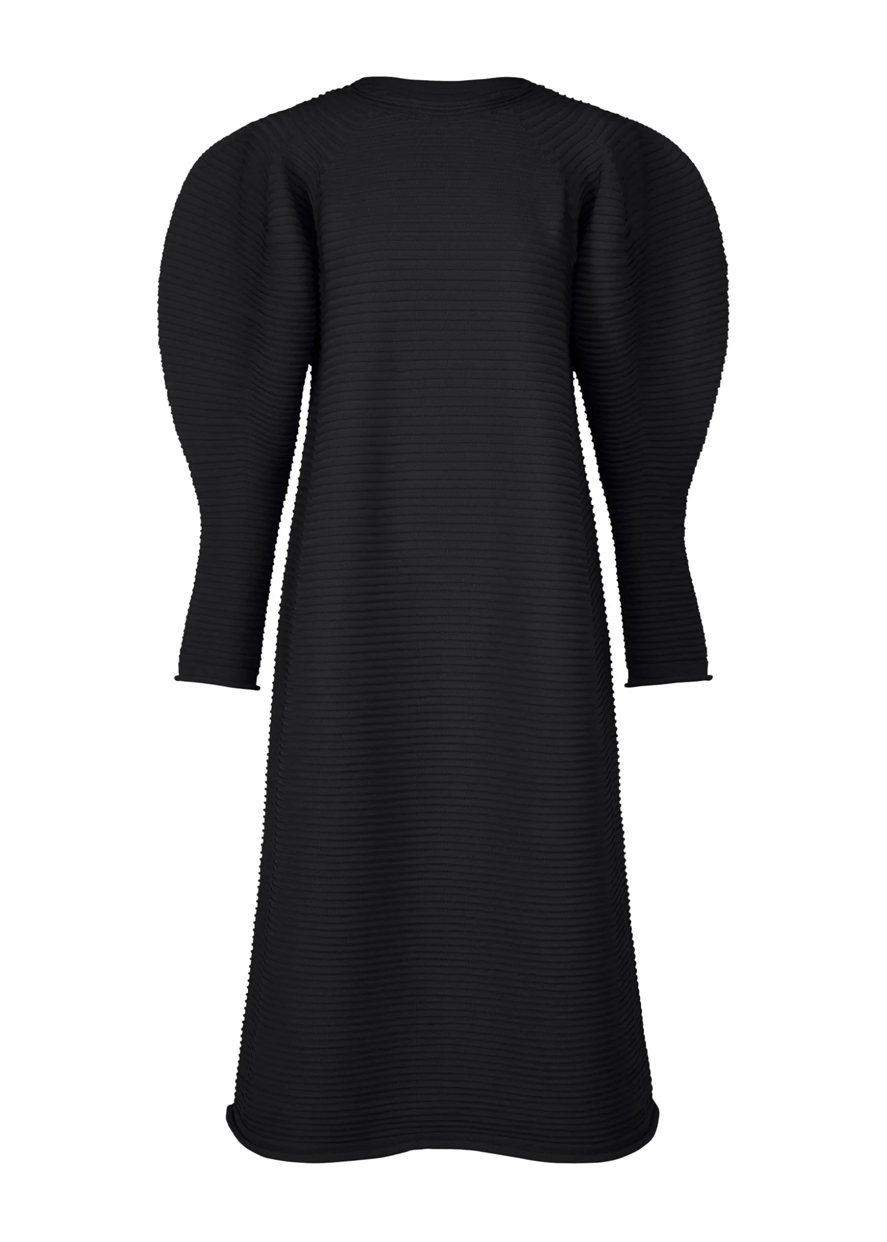 This round-neck, long-sleeved dress is characterized by its puffy, three-dimensional silhouette. It is made using a light material and is machine-washable.