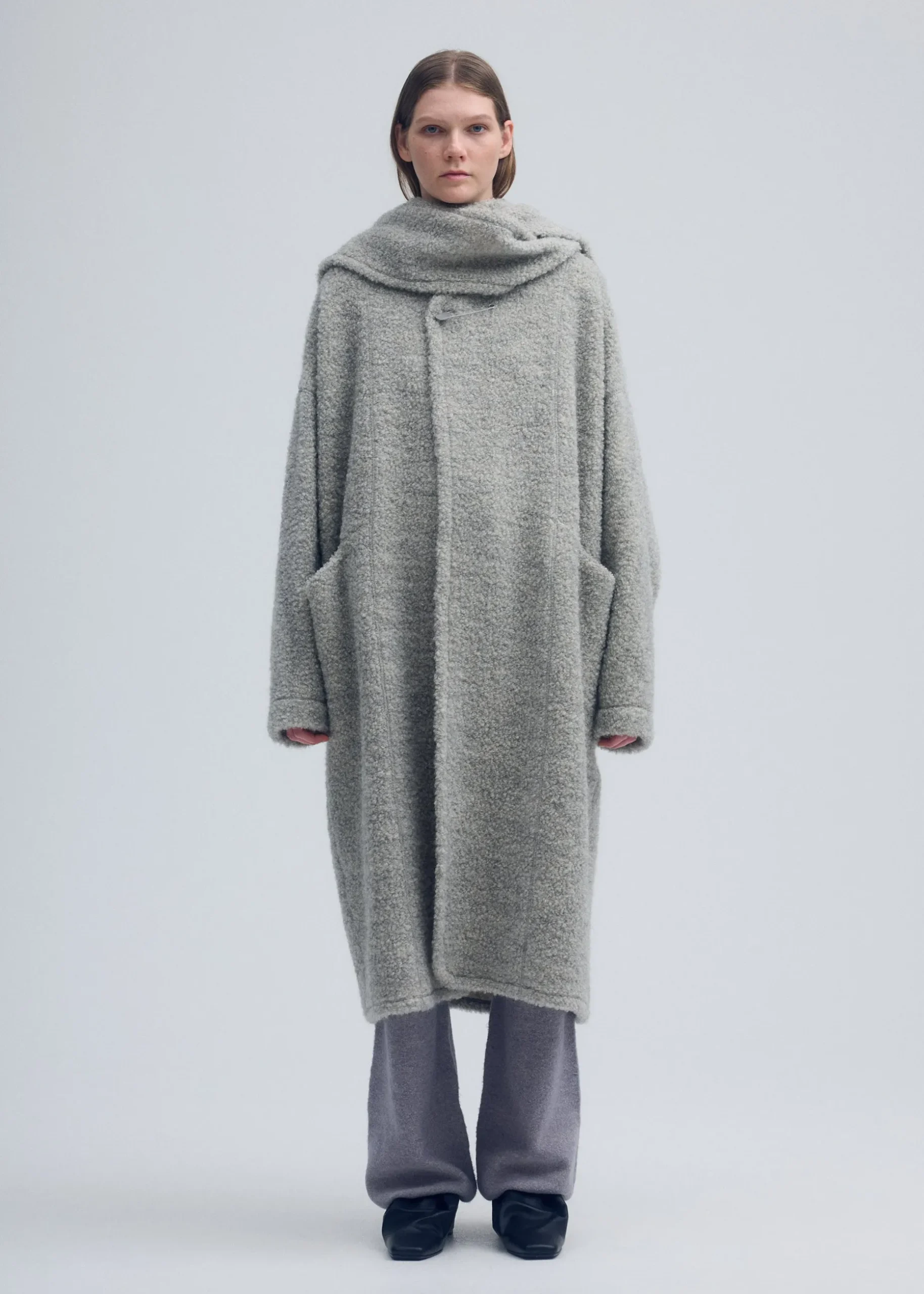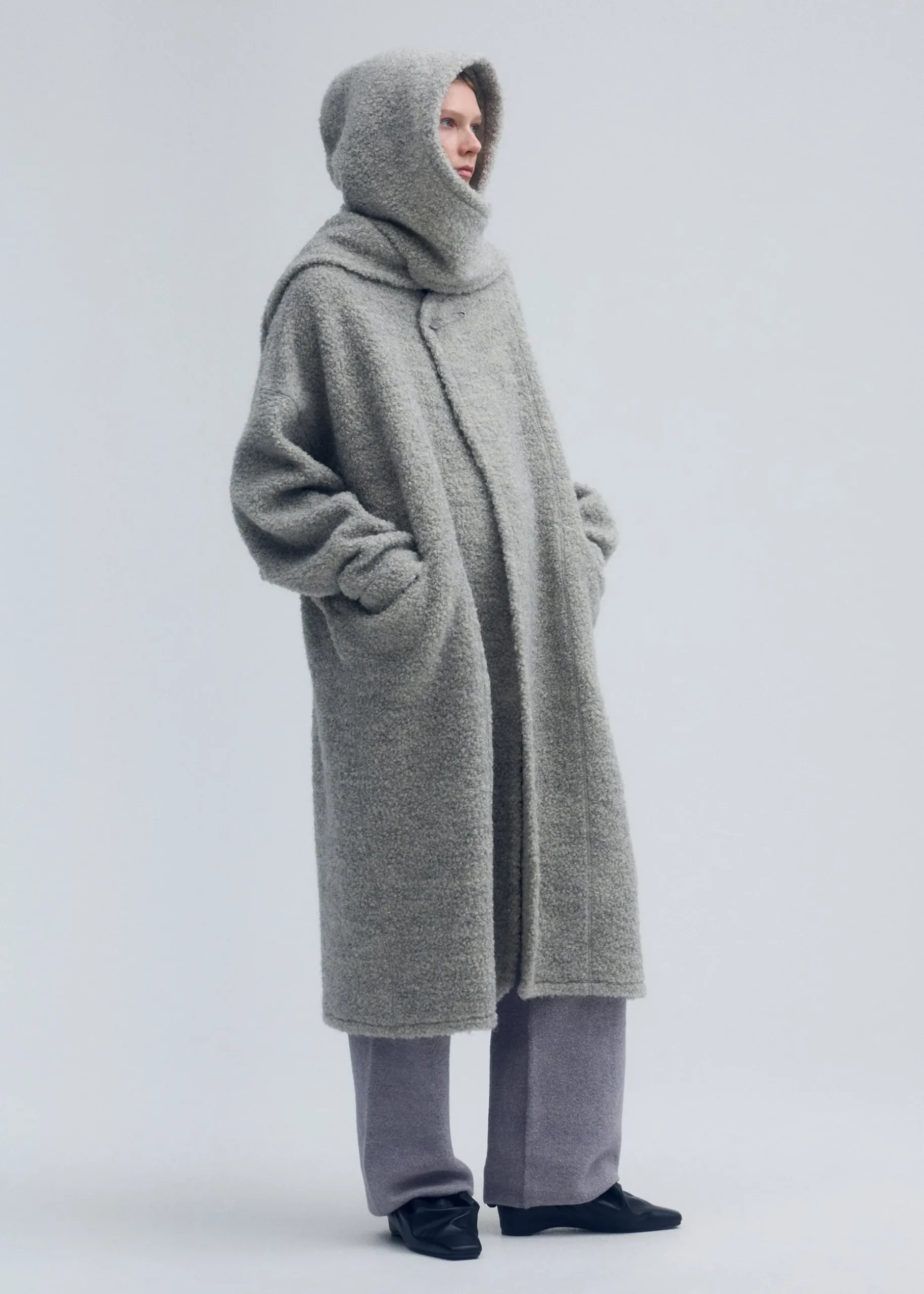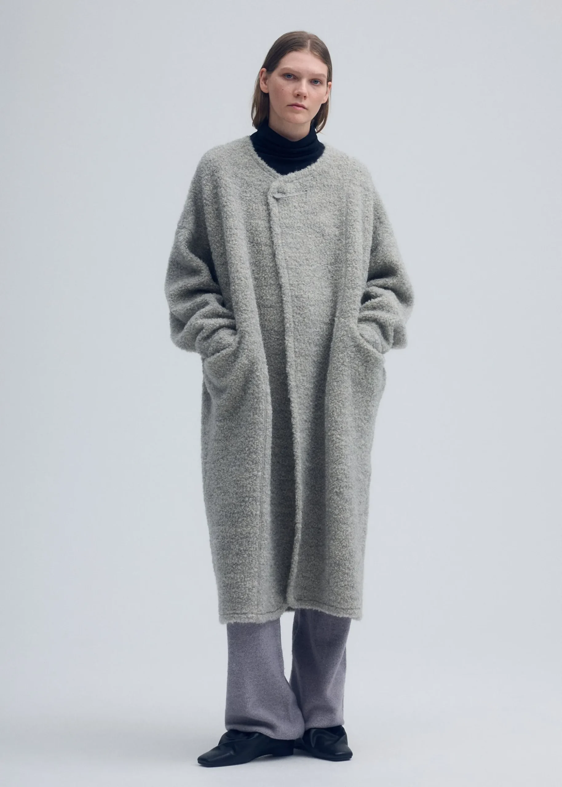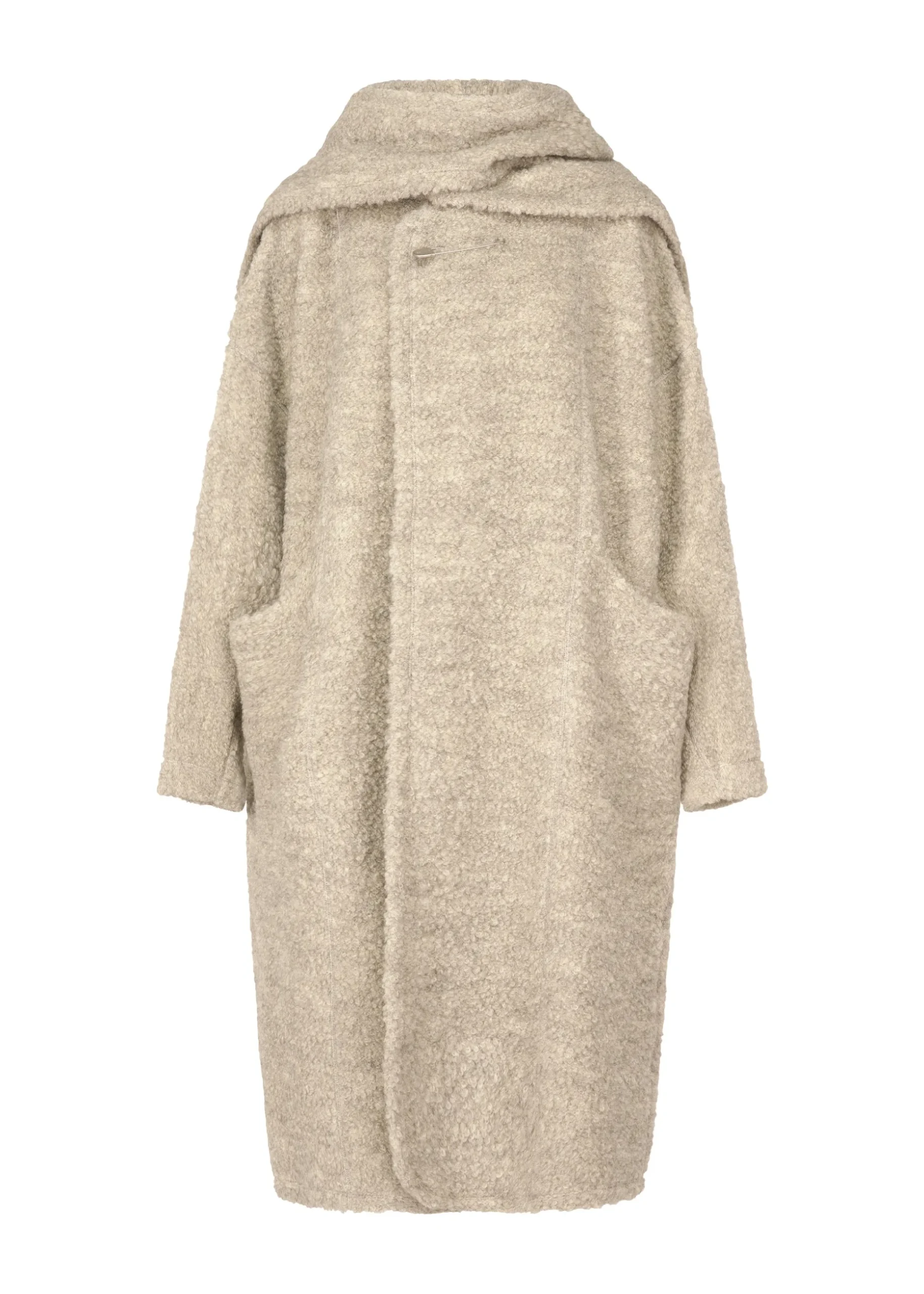 This long coat was crafted by leveraging the original hue of the fabric without dyeing it, recognizing anew the strength of natural colors. It is made using inlay knitting with thread from highly rare Gotland sheep. It is characterized by its an elegant gray sheen and texture with soft loops. Enjoy the high-quality material, as each item has a unique texture and color created by nature.